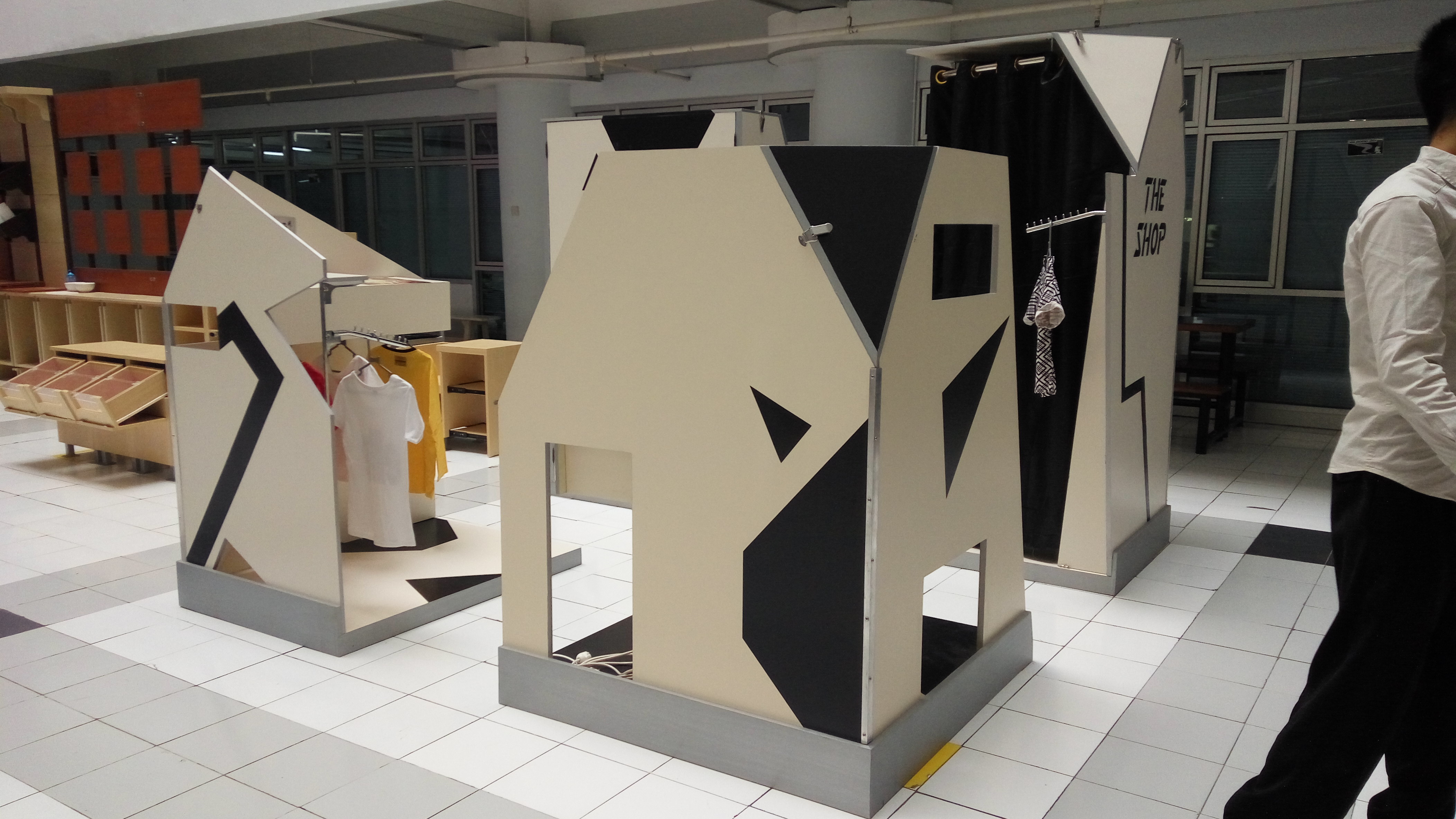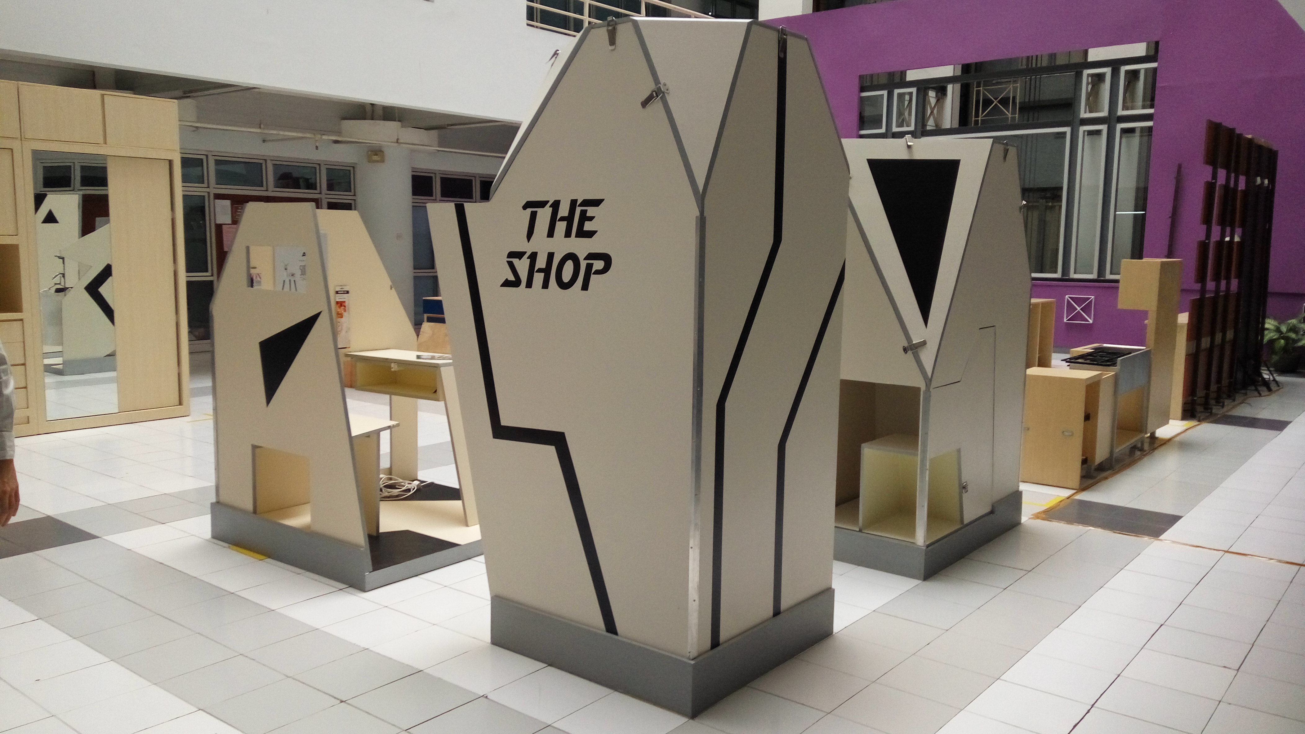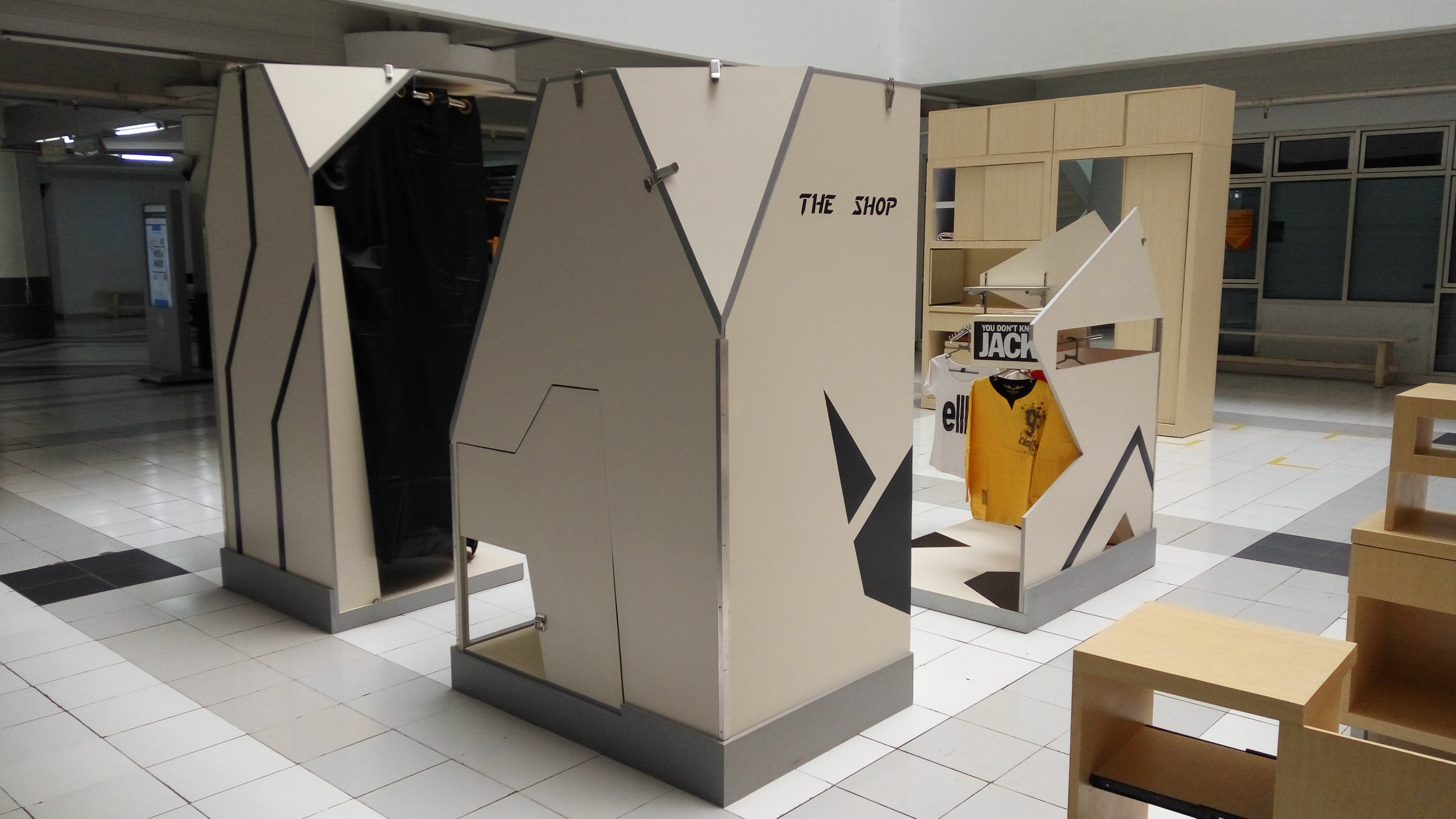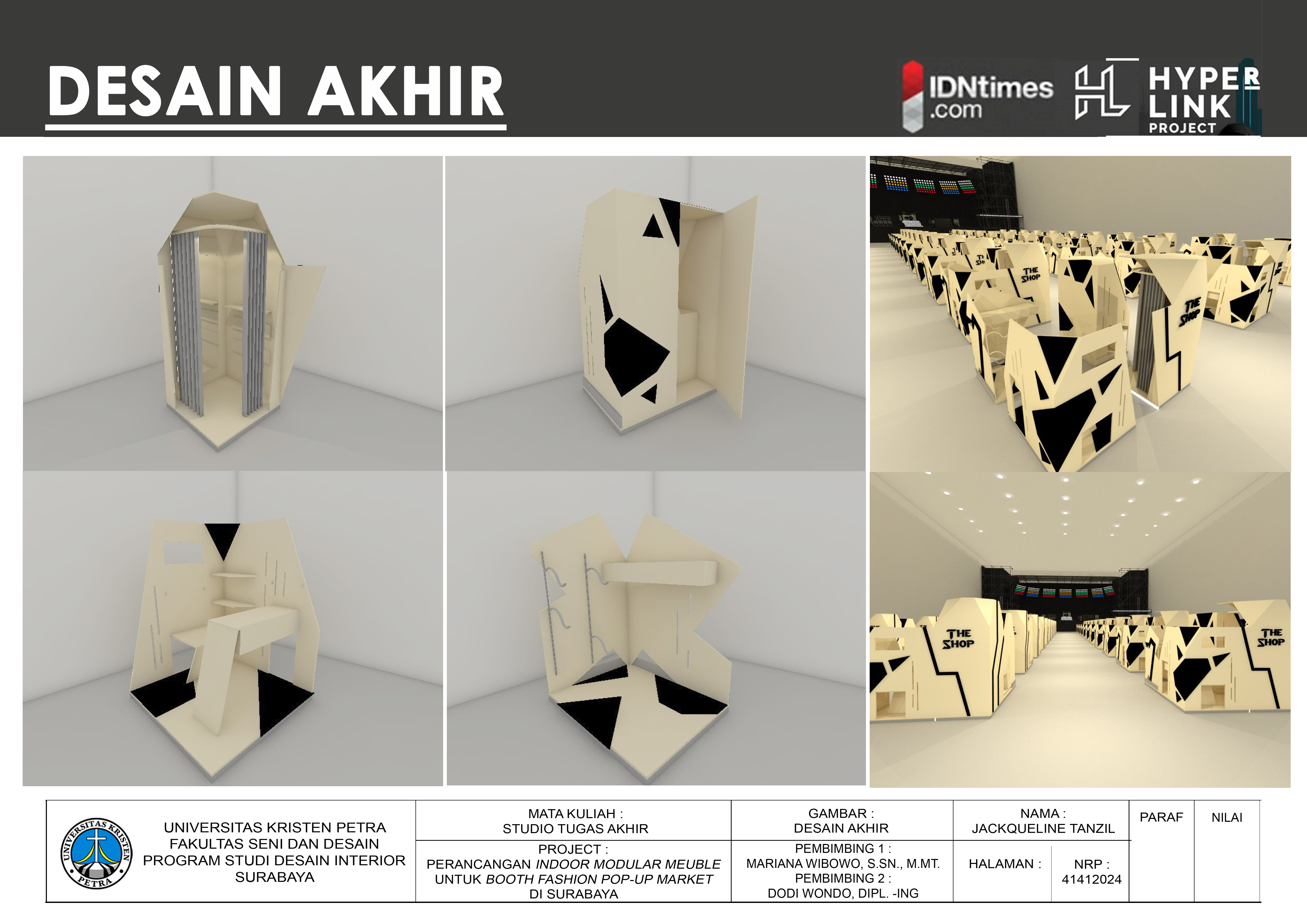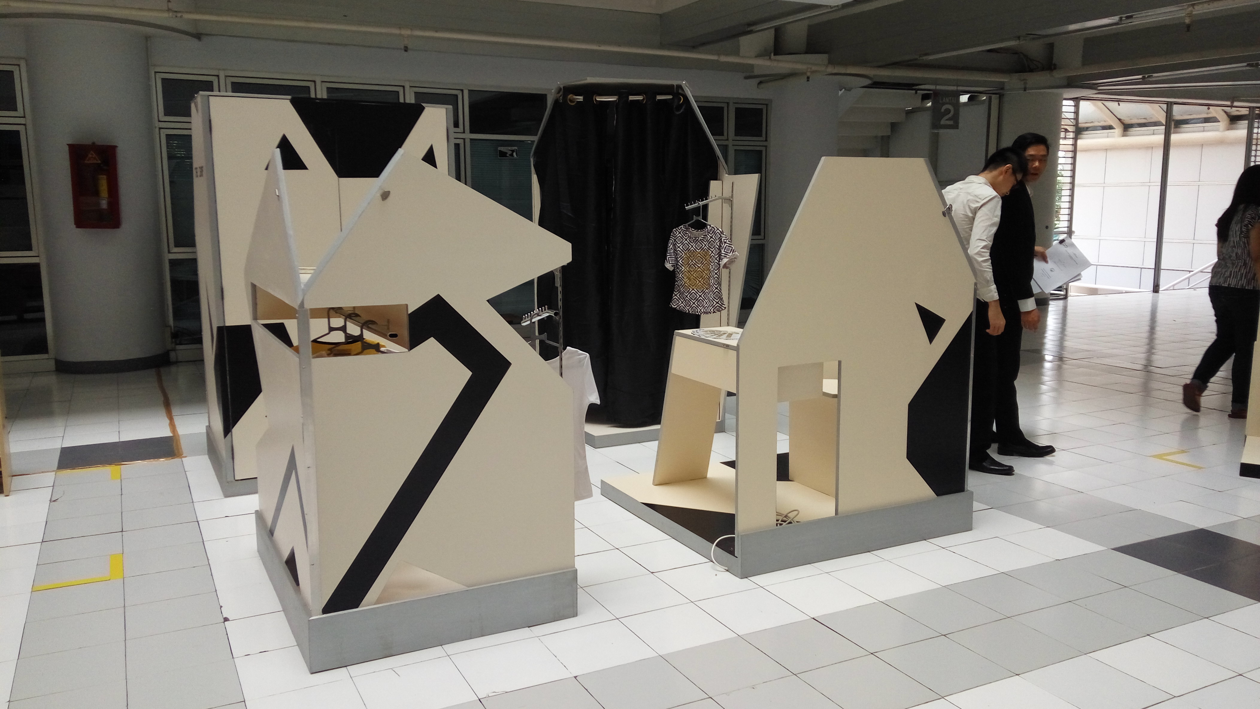 Perancangan indoor modular meuble sebagai bahan pendukung pop-up market. Alasan di balik pemilihan topik ini karena melihat semakin maraknya pop-up market yang mewadahi tenant online shop untuk memasarkan produk secara nyata, memberikan wadah agar konsumen dapat melihat kualitas produk secara langsung, dan modal awal untuk sebuah toko menetap jauh lebih mahal, penulis ingin membuat rancangan desain yang menjawab kebutuhan. Sebuah desain yang mudah dibongkar pasang dan mudah diangkut. Konsep mebel ini adalah modular, futuristic, dan market. Sebuah mebel yang memberi dampak positif terhadap beberapa pihak terkait. Pengaplikasian konsep terdapat pada pemilihan bentuk, warna, dan sistem konstruksi. Tujuan dari perancangan ini adalah mengetahui aktivitas pengguna booth dan memberikan jawaban atas kebutuhan tersebut, pemilihan material yang tepat dan sistem konstruksi display yang baik, membuat inovasi bentuk booth fashion yang menarik. Metode pengumpulan data dengan observasi langsung dan wawancara, setelah tahap pengumpulan data, mulai menganalisa data yang telah dikumpulkan dan membuat desain dari skematik desain hingga transformasi desain akhir, yang kemudian diwujudkan dalam bentuk prototype dengan skala 1:1. Tujuan dari perancangan yakni menjawab kebutuhan pengguna booth, pemilihan material yang tepat, sistem konstruksi display yang baik, dan membuat inovasi bentuk booth fashion yang menarik.