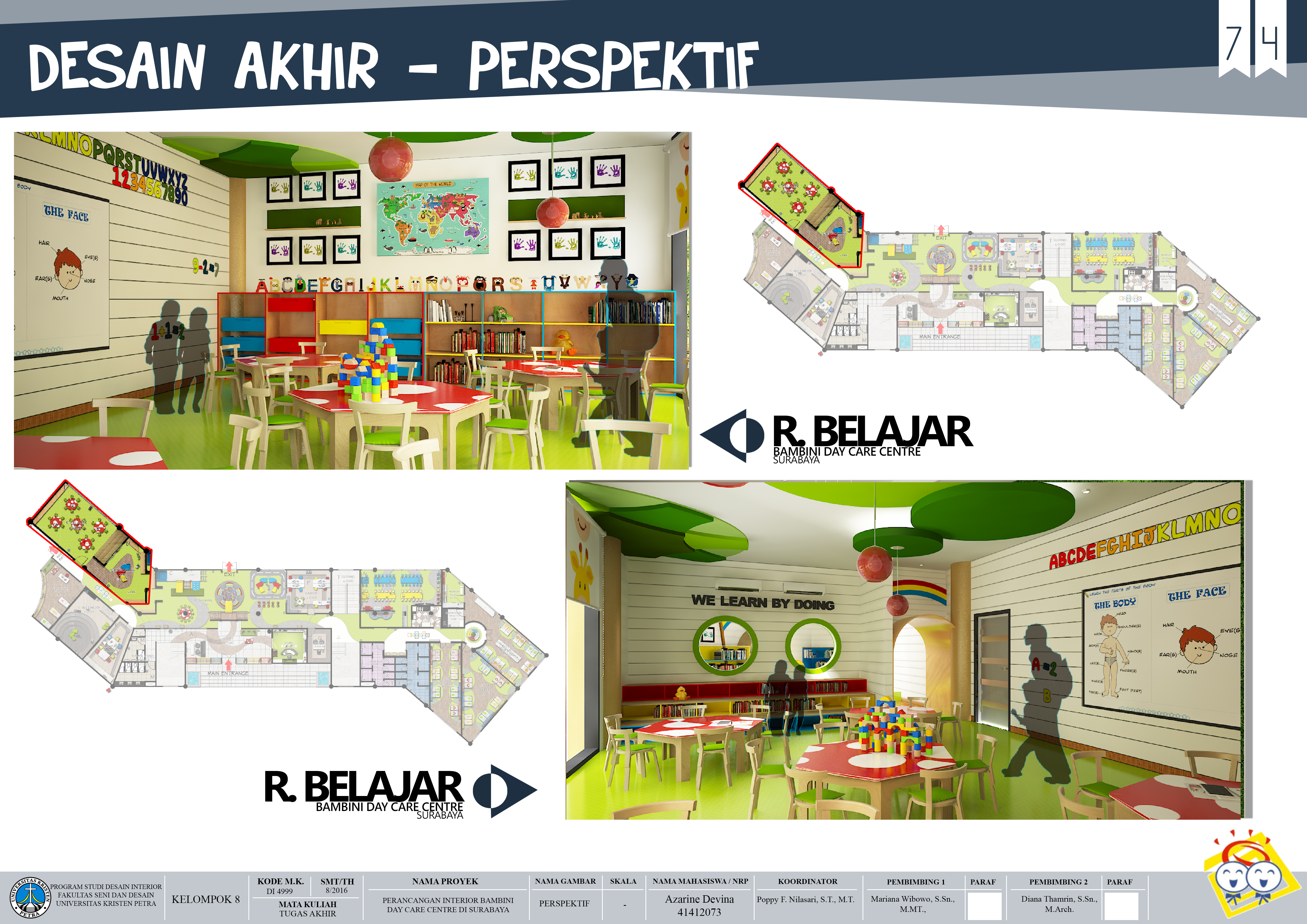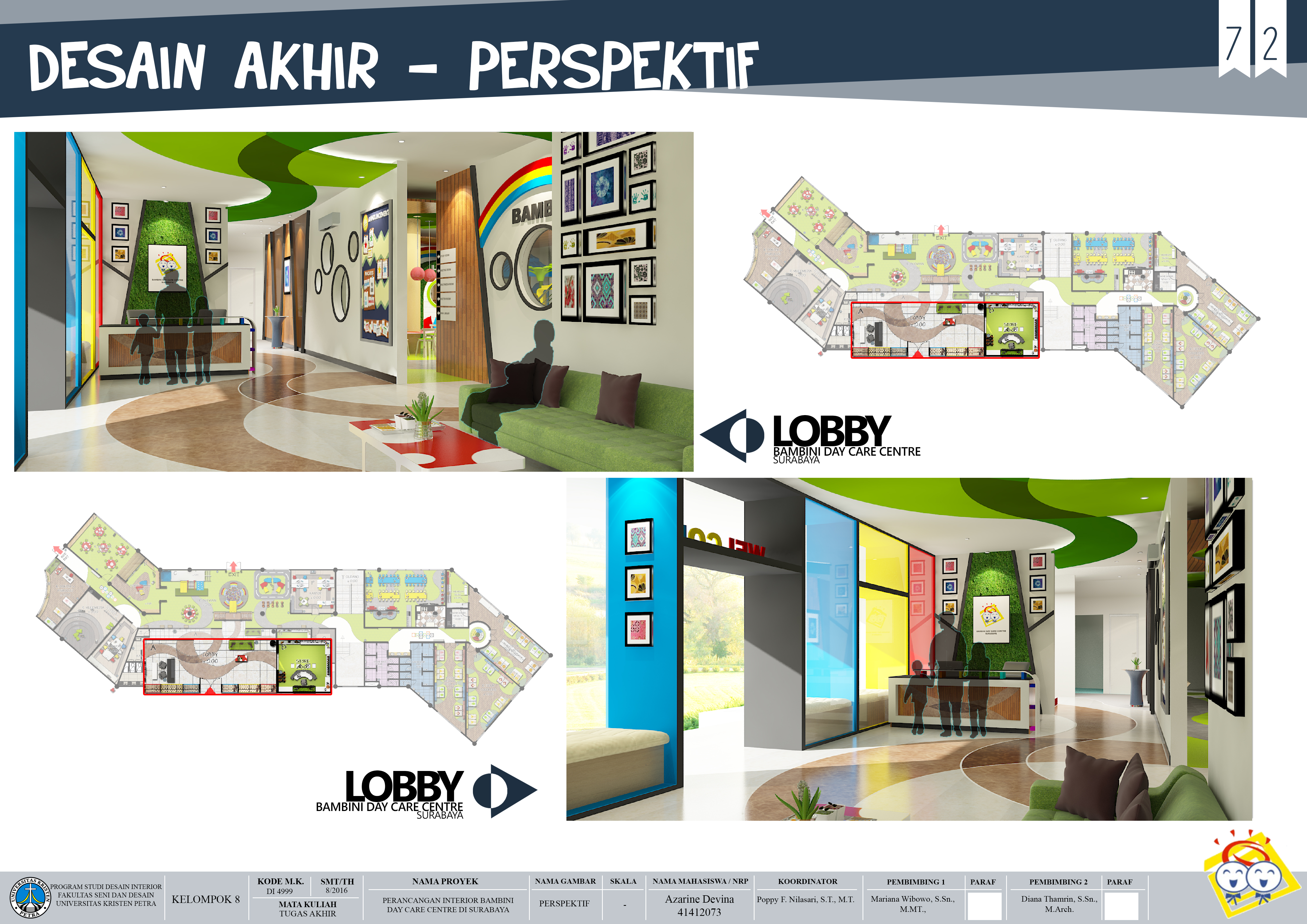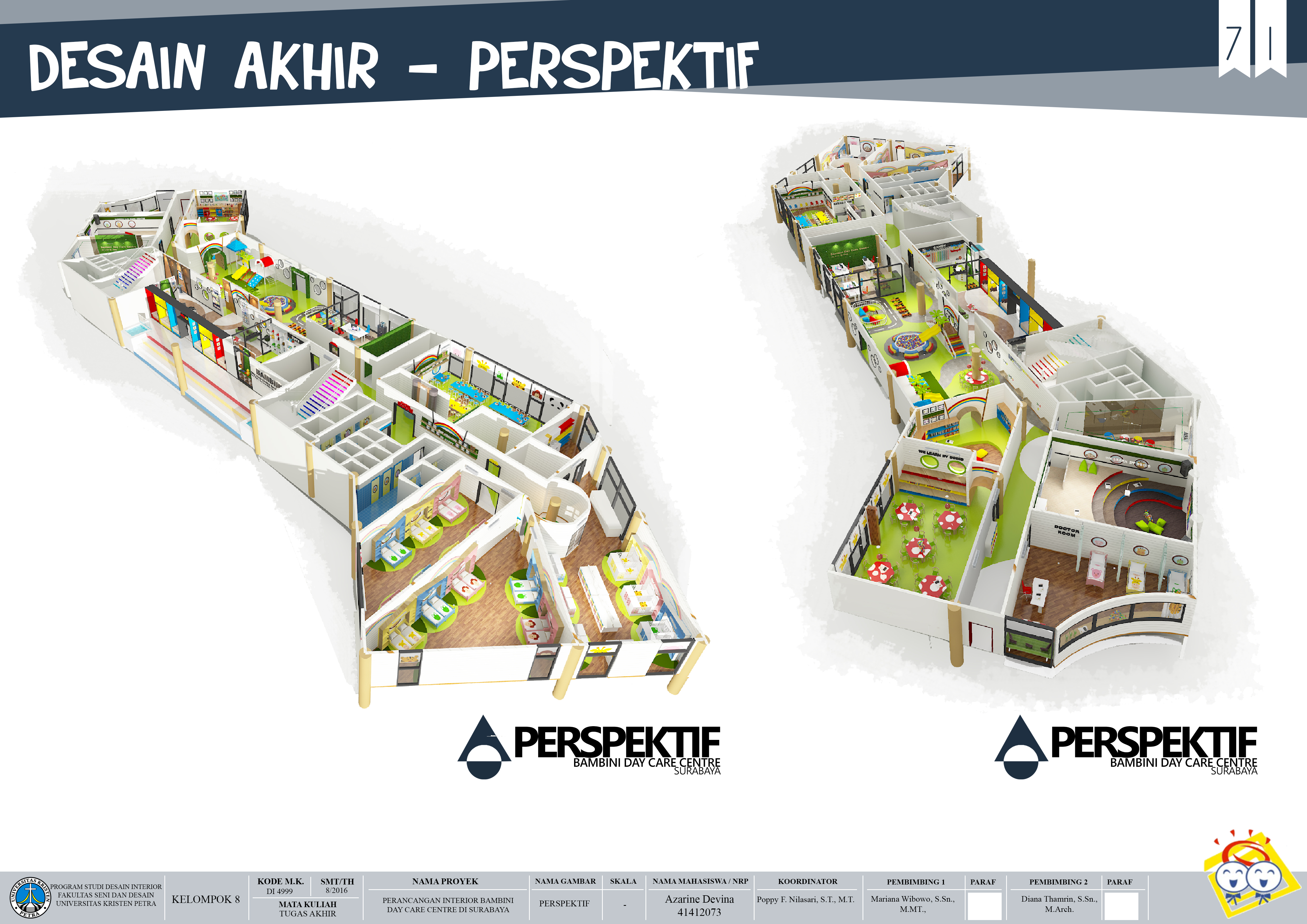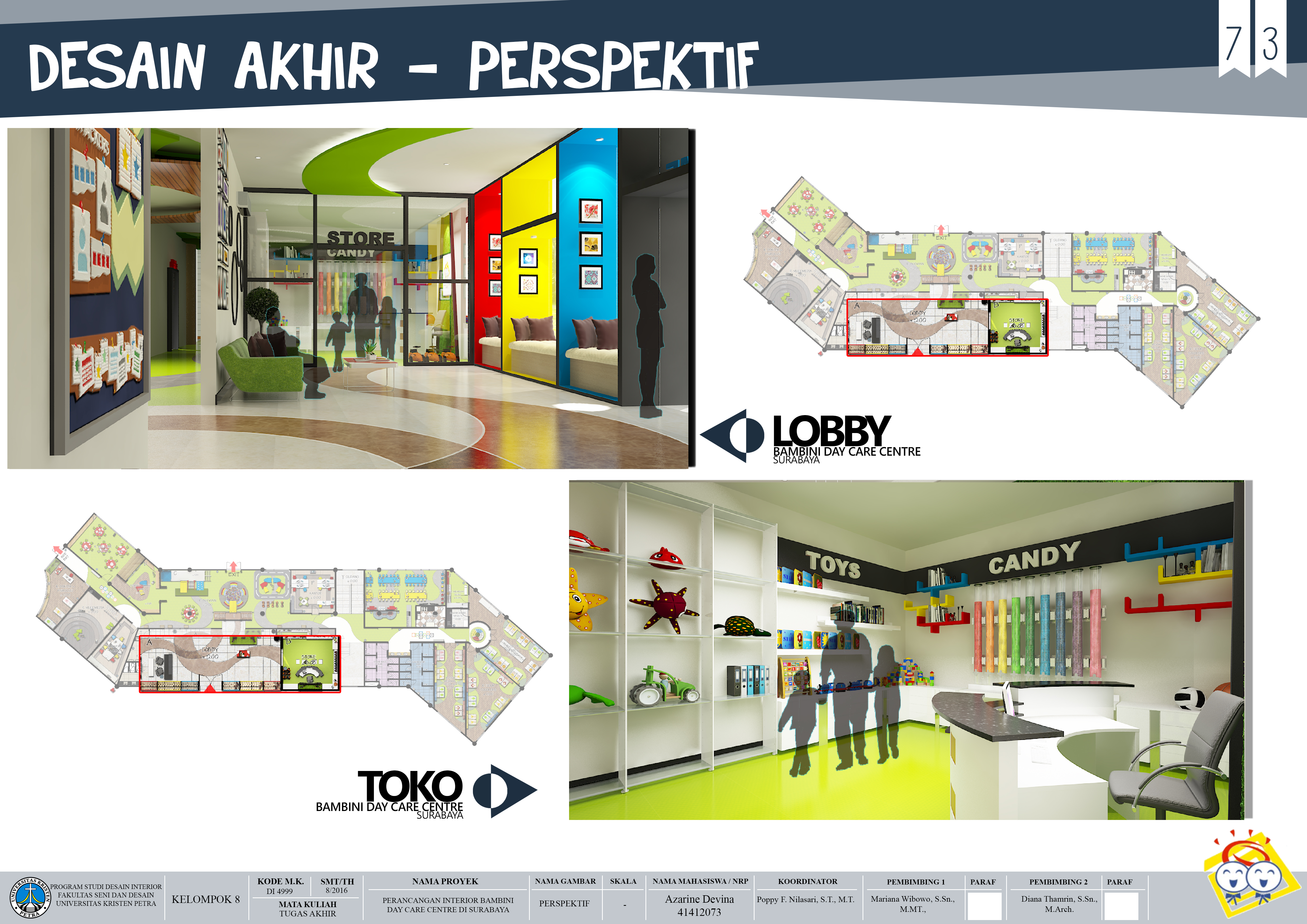 Surabaya memiliki banyak wanita karir. Beberapa wanita bekerja sepanjang hari sehingga mau tidak mau anak kecil mereka harus dititipkan ke pihak ke 3. Anak pada usia 0-5 tahun mengalami periode “golden age”. Otak anak berkembang sangat pesat pada periode ini. Akan sangat disayangkan apabila pihak ketiga kurang bertanggung jawab, sehingga otak anak tidak berkembang maksimal. Day care bisa menjadi jawaban bagi orang tua untuk menitipkan anaknya ketika bekerja. Day care didesain dengan fun, ergonomis dan sesuai corporate identity dari Bambini. Konsep yang digunakan adalah “Funtastic”. Desain yang ada diberi warna-warna ceria merah, kuning, biru, hijau, dan putih. Konsep ini diambil agar anak-anak dalam menjalankan aktivitas-aktivitas di daycare bisa senang dan enjoy. Rasa senang dan enjoy membuat anak-anak lebih mudah menerima materi pengajaran, sehingga periode golden age bisa dimaksimalkan.