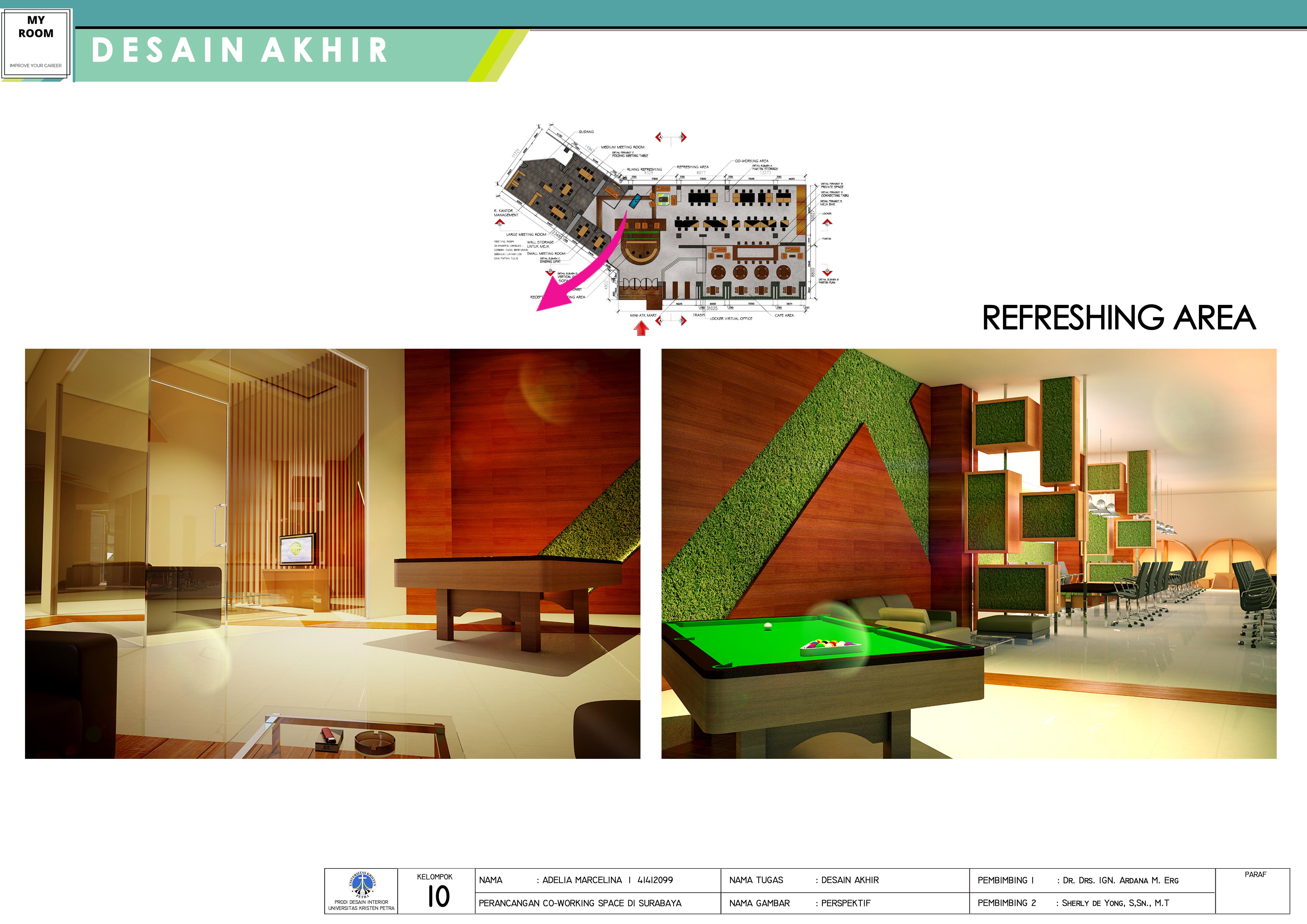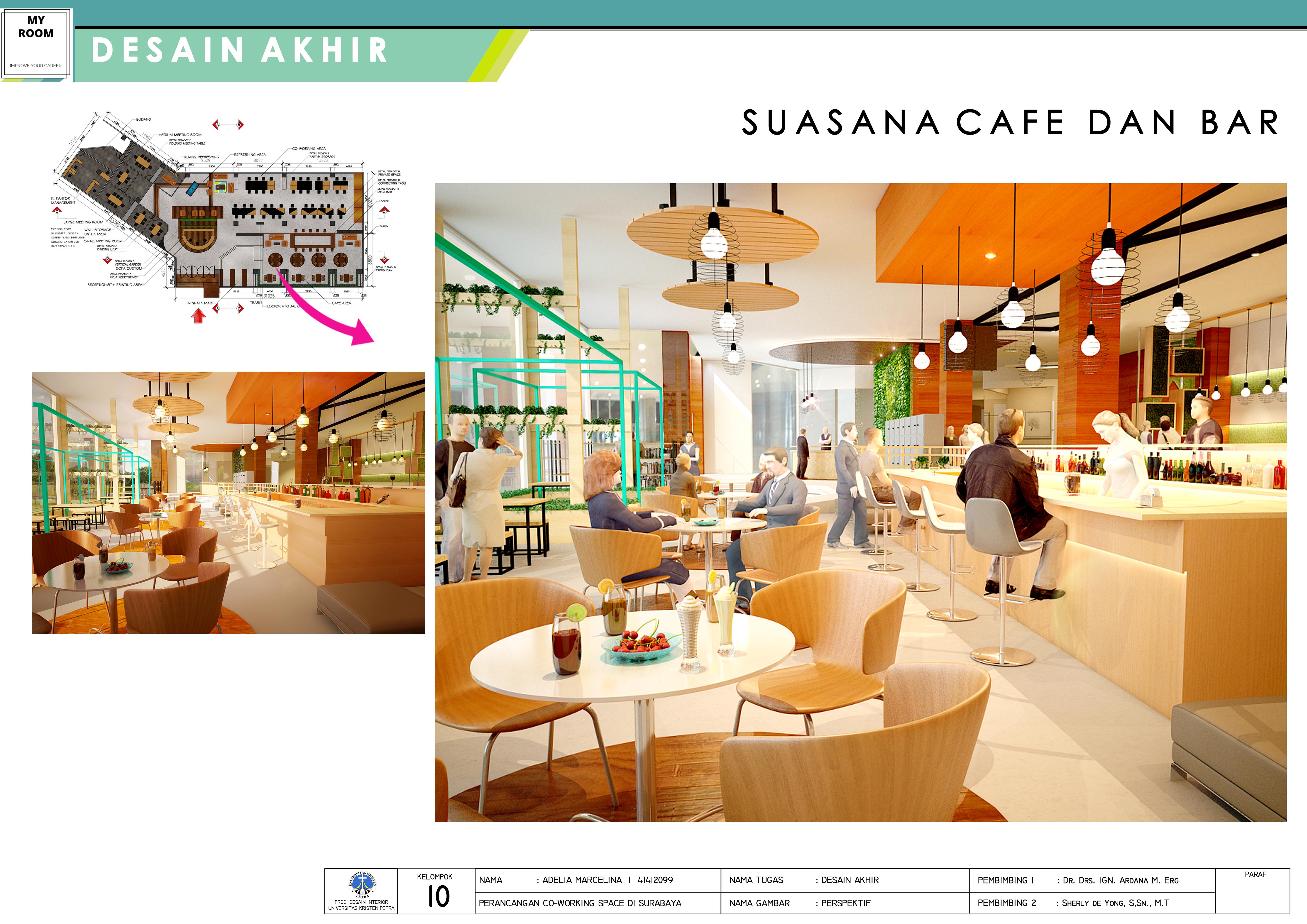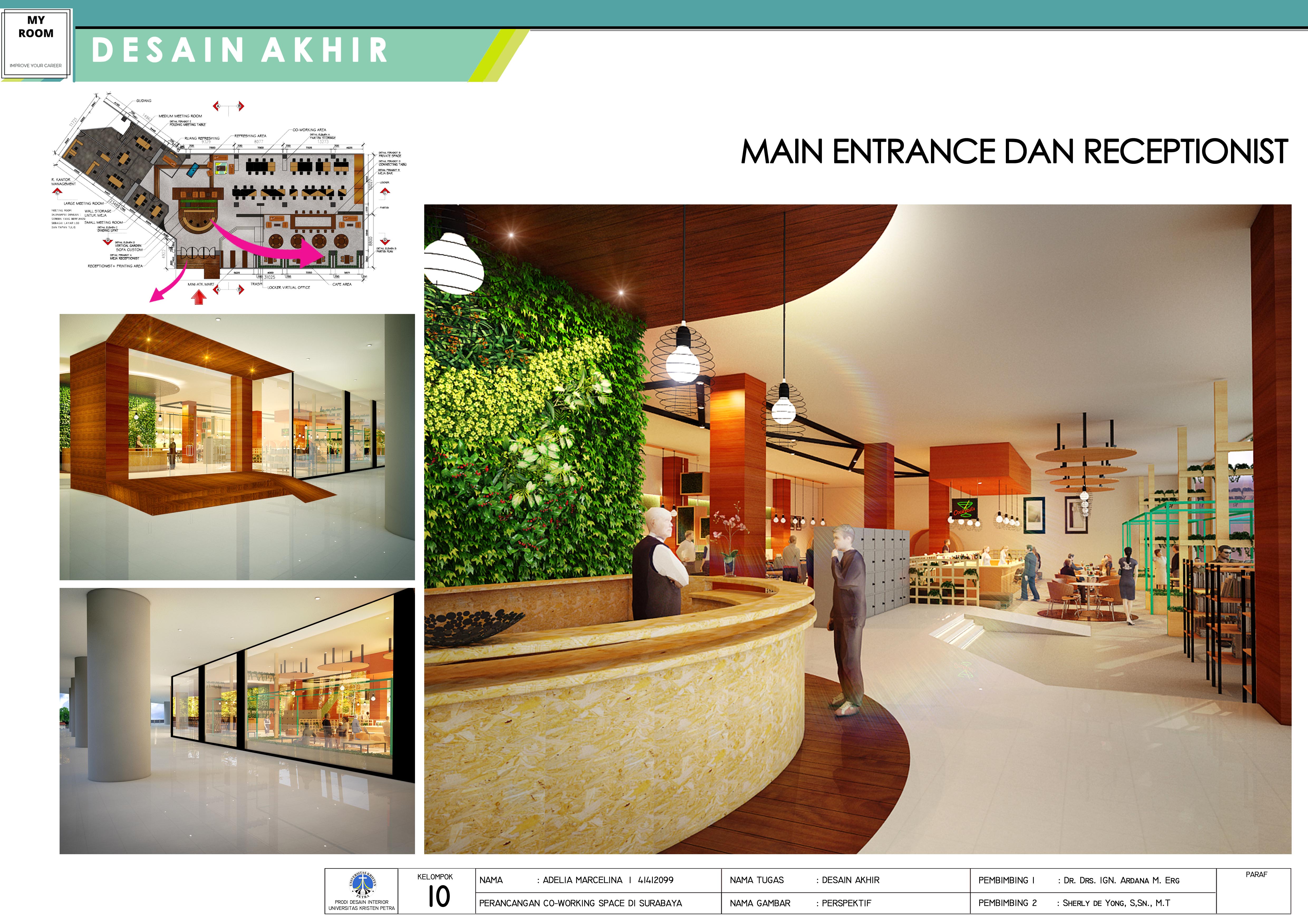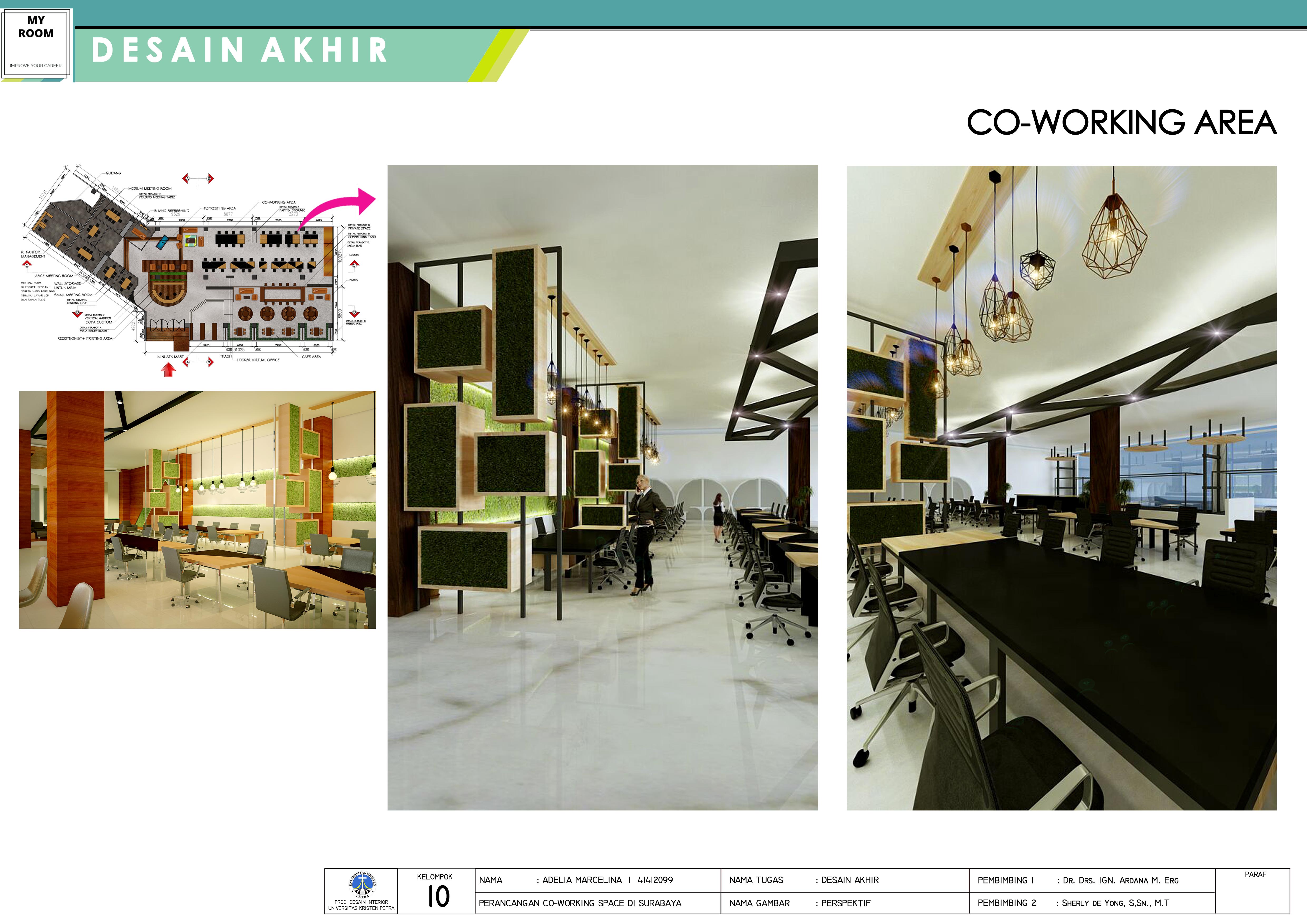 Co-working merupakan salah satu solusi untuk masalah lahan yang mahal dan tempat kerja yang terbatas dengan jumlah entrepreneur independent dan pekerja lepas kreatif yang semakin bertambah terutama di kota besar seperti Surabaya. Sehingga perlu dirancang sebuah interior co-working space yang dapat menyesuaikan kebutuhan masyarakat di kota Surabaya. Rancangan dilakukan memakai metode desain, yaitu observasi kebutuhan pengguna, melakukan suvey lapangan, menganalisis data yang menghasilkan produk programming, membuat skematik serta maket studi, hingga masuk ke evaluasi pertama hingga menghasilkan produk akhir (seperti: layout, rencana lantai, plafon, perspektif, maket dan lain-lain). Hasil yang diharapkan dari perancangan ini ialah suatu fasilitas publik yang mampu mengakomodasi kebutuhan masyarakat Surabaya khususnya di kalangan professional muda terhadap ruang kantor yang tidak memerlukan biaya yang besar untuk membangun kantor sendiri, dapat berinteraksi dengan orang lain dari latar belakang yang berbeda, dan membuka peluang bisnis baru.