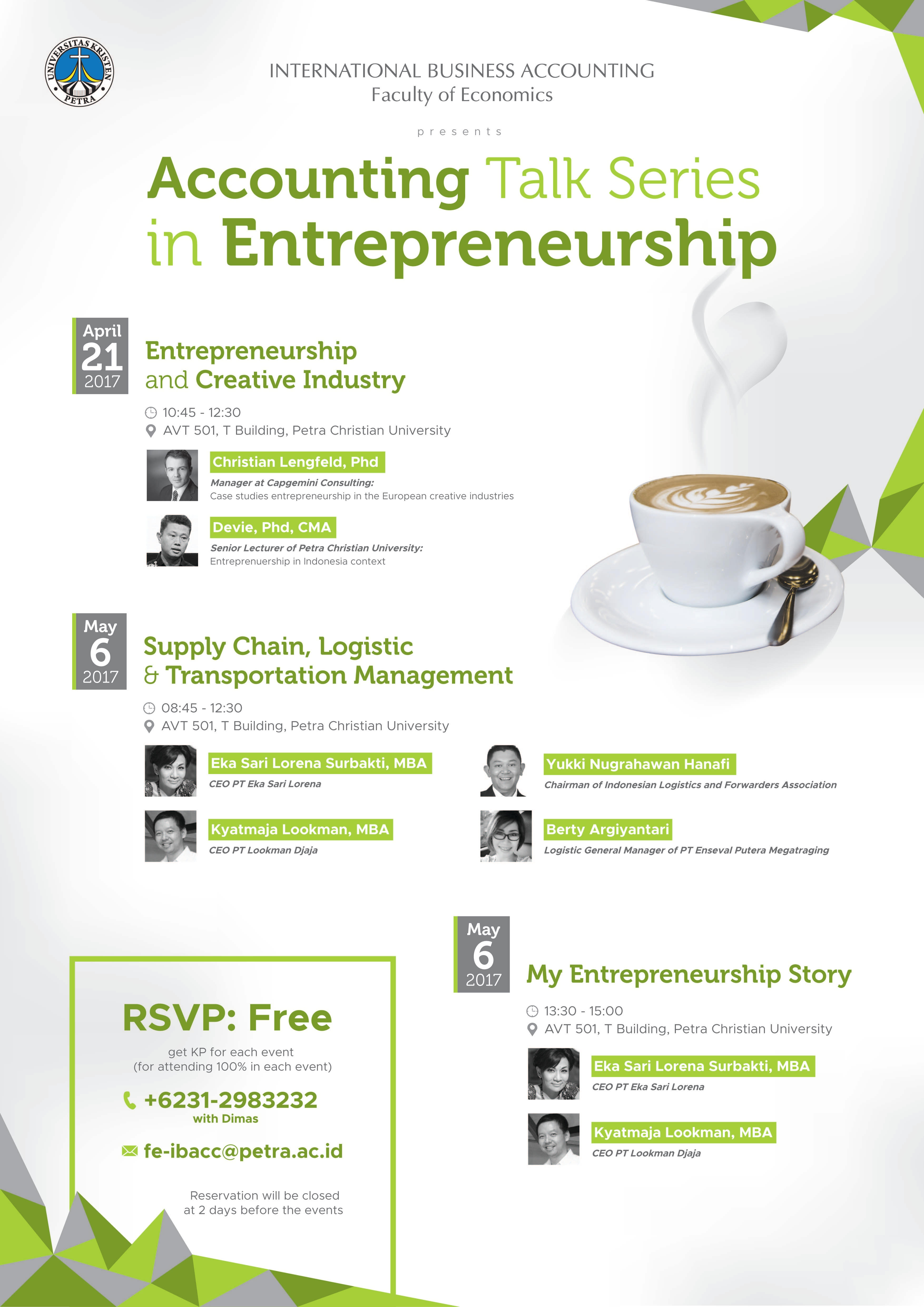 International Business Accounting Universitas Kristen Petra Surabaya mengadakan beberapa rangkaian seminar dengan mengangkat topik "Accounting talk series in entrepreneurship". Beberapa narasumber dihadirkan untuk acara ini, yang dilangsungkan pada 21 April 2017 dan 06 Mei 2017 di gedung AV.T.501 Universitas Kristen Petra Surabaya.