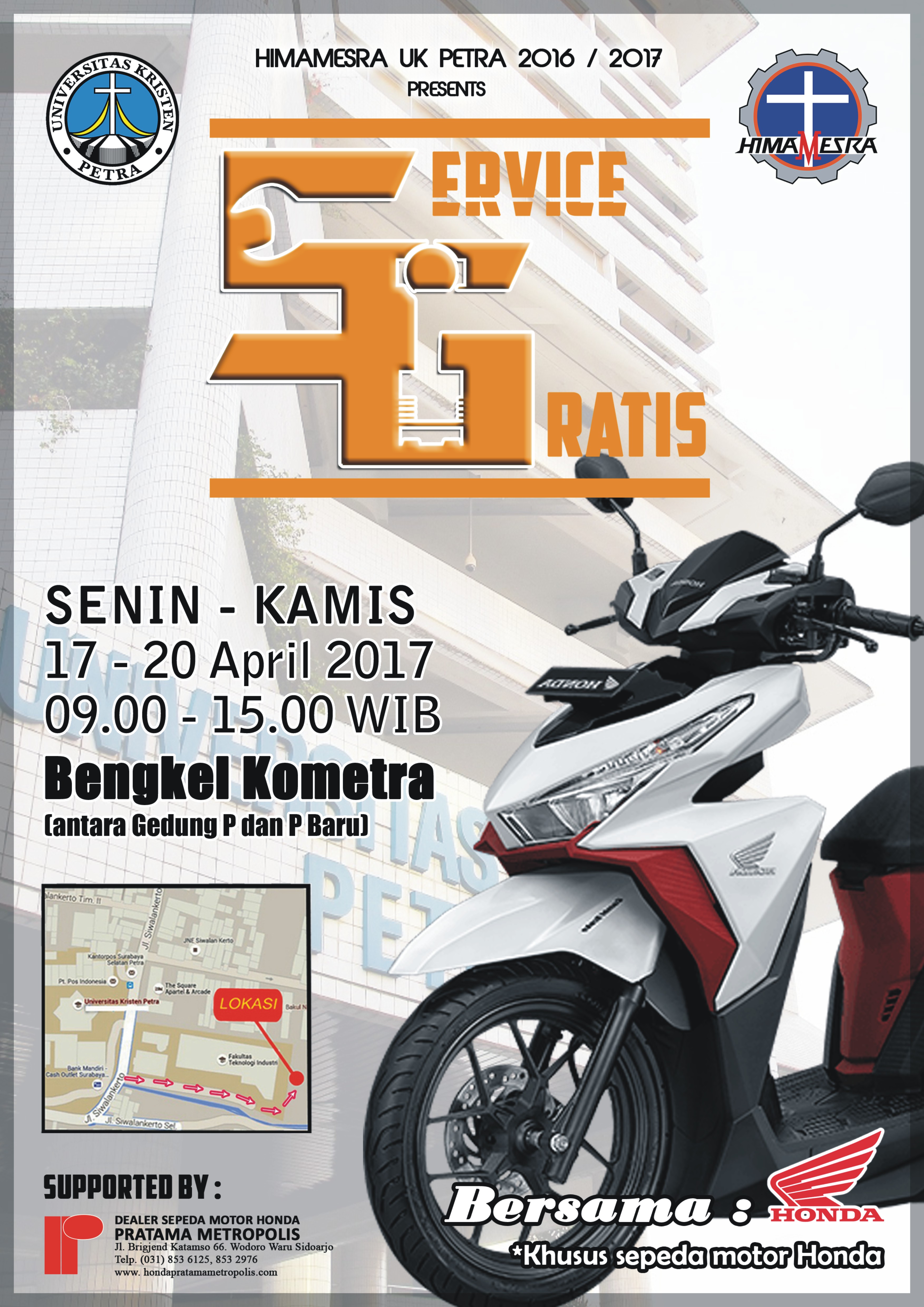 Program Studi Teknik Mesin UK Petra mengadakan service gratis khusus bagi civitas akademika yang mempunyai sepeda motor honda. Service gratis ini dilaksanakan pada 17-20 April 2017, jam 09.00-15.00 WIB, di bengkel Kometra UK Petra.
