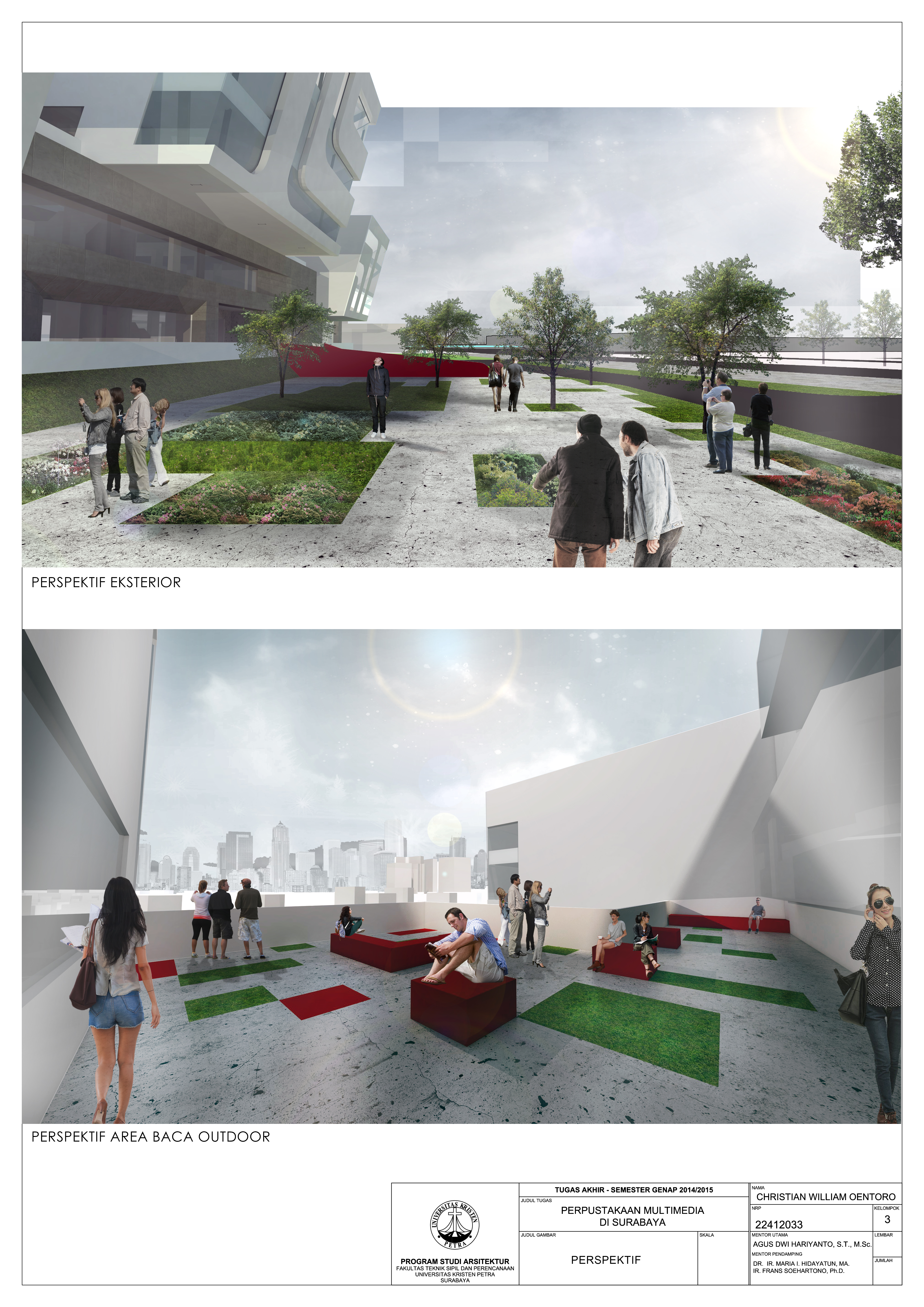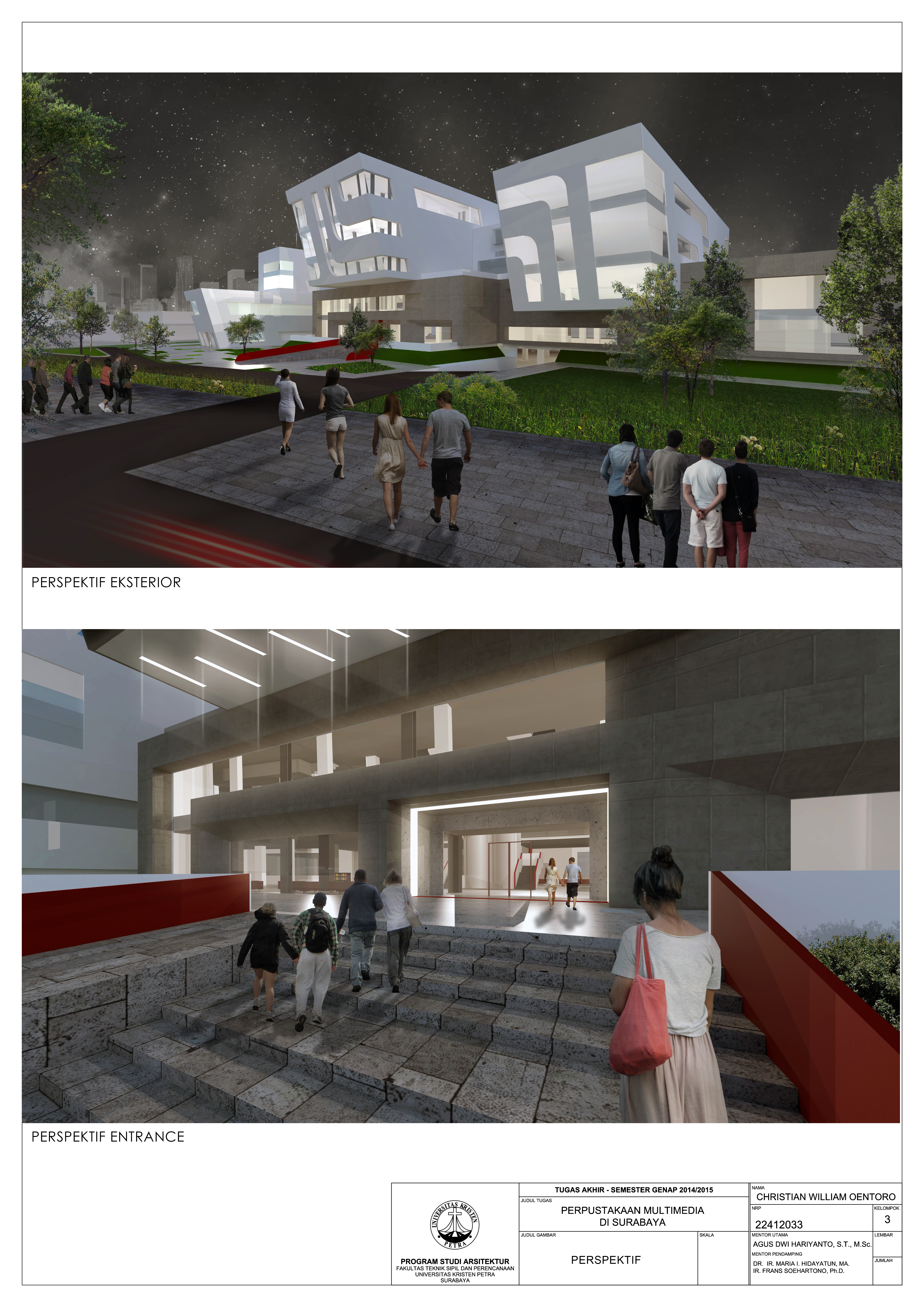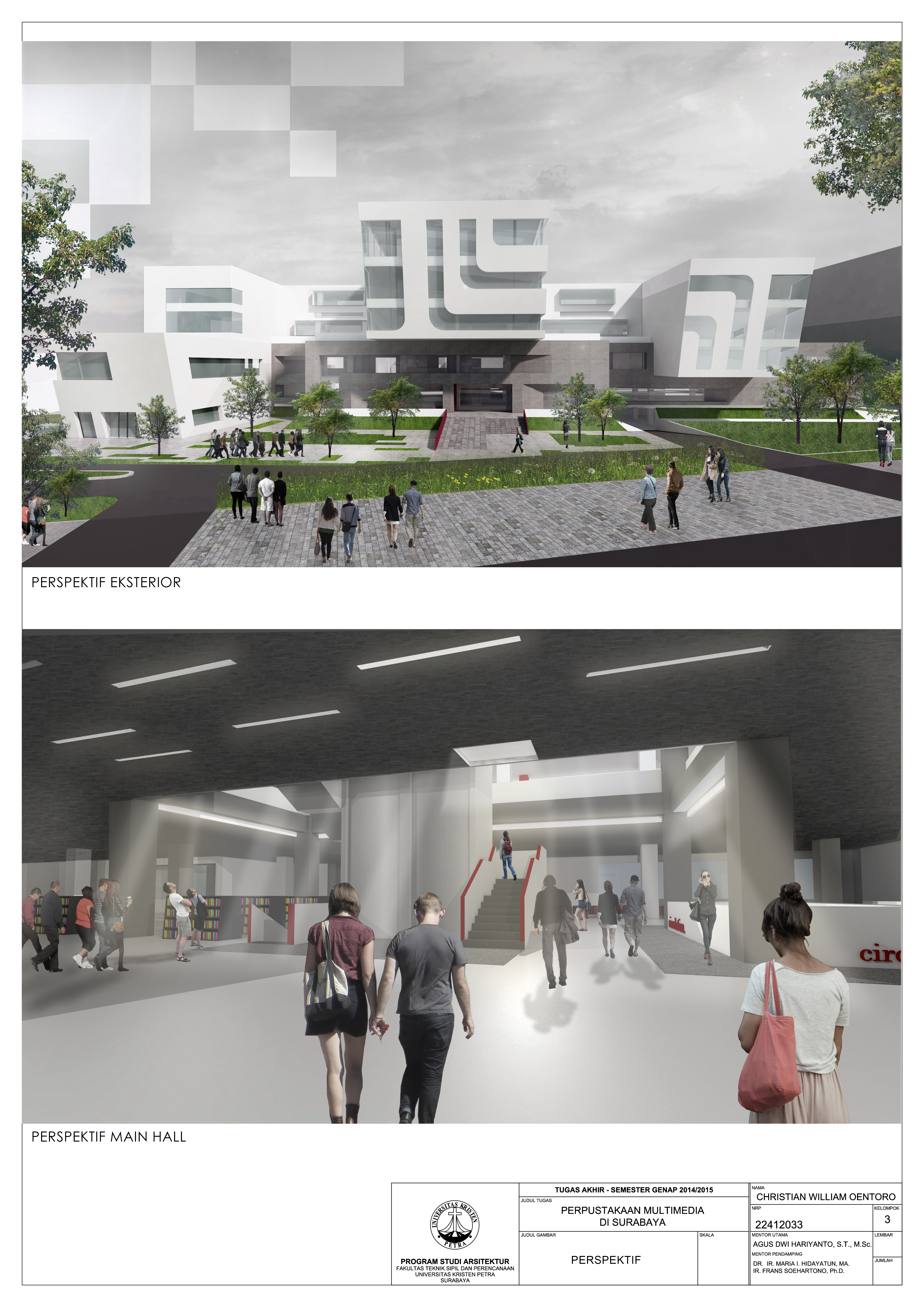 Perpustakaan merupakan fasilitas pusat informasi dan edukasi yang selalu berkembang. Dengan perkembangan zaman, maka media yang dapat diwadahi suatu perpustakaan juga berkembang. Namun perpustakaan seringkali dipandang masyarakat sebagai fasilitas yang bersifat kaku dan homogen, sehingga masyarakat kurang memiliki minat untuk bereksplorasi media. Perpustakaan juga jarang sekali difungsikan sebagai fasilitas yang dapat menampung komunitas sosial. Proyek Perpustakaan Multimedia di Surabaya ini mengangkat konsep perancangan berupa library as a hub yang terdiri dari social hub dan media hub, yaitu perpustakaan sabagai sebuah penghubung dari segi sosial dan juga media. Perpustakaan sebagai social hub diwujudkan dengan memberikan sociopetal space sebagai area komunitas dan juga blurring space sesuai dengan teritori privasi pengguna/pengunjung. Sedangkan media hub diwujudkan dari zonasi pembagian media-media yang bervariasi seperti koleksi buku dan digital. Pendekatan perancangan didasarkan pada perilaku pengguna yang memiliki preferensi pilihan media yang diminati dan area teritorial atau privasi yang berbeda-beda.