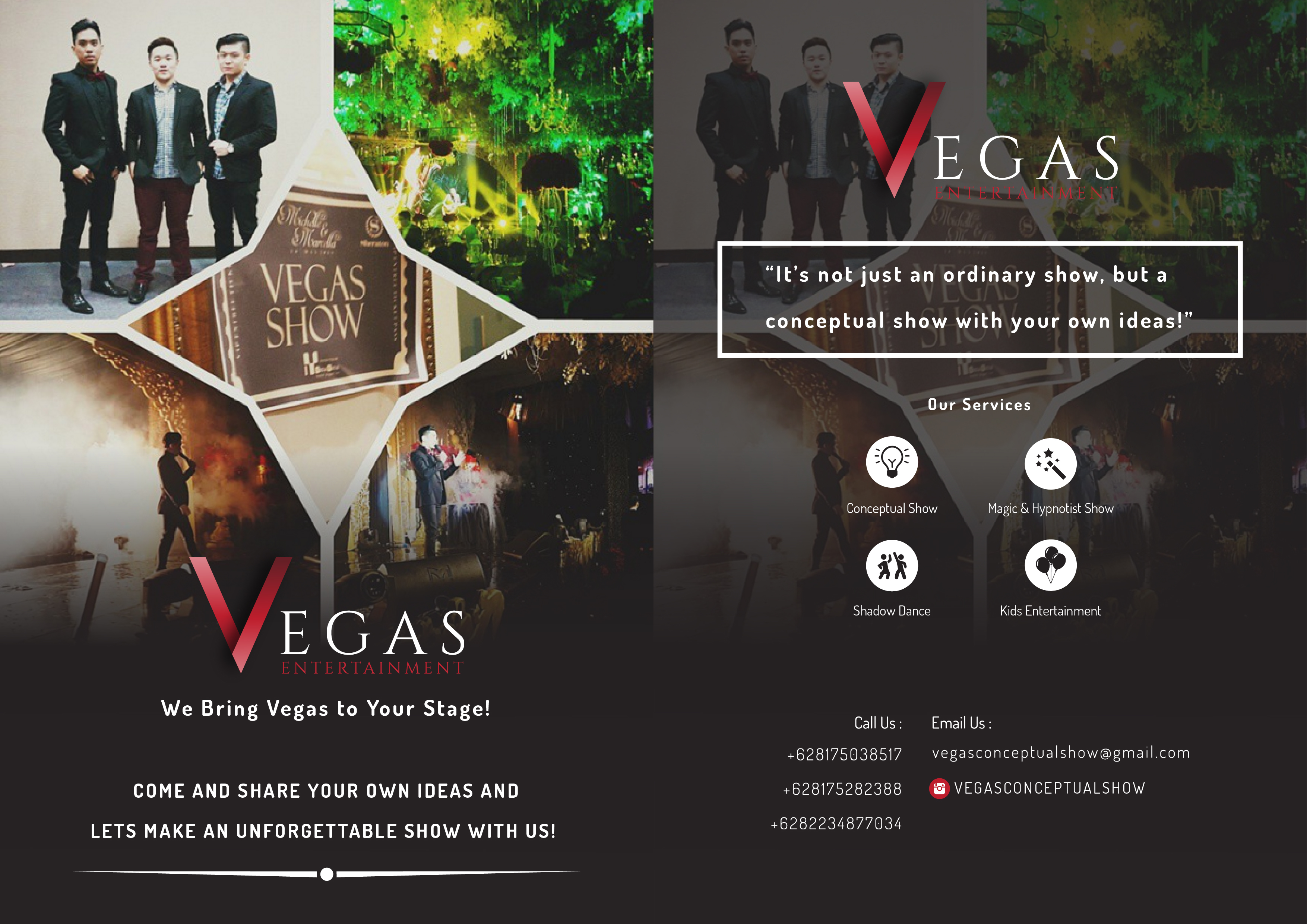 Perusahaan Vegas Conceptual Show ini berwilayah di daerah Surabaya, Indonesia. Perusahaan Vegas Conceptual Show ini merupakan perusahaan baru yang berkembang pesat di dalam pasarnya. Perusahaan ini bergerak di bidang penyedia jasa untuk entertainment conceptual show. Perusahaan Vegas Conceptual Show ini memiliki kelebihan sendiri yang membedakannya dari perusahaan entertainment show yang lainnya, yaitu kelebihan mereka dalam menyediakan jasa conceptual showtime. Namun perusahaan ini menyadari bahwa perlu adanya upaya mempromosikan nama mereka dan memberikan awareness kepada masyarakat terlebih kepada target audience mereka. Oleh karena itulah dibutuhkan media dan promosi yang dilakukan agar dapat mempromosikan dan meningkatkan awareness terhadap para target audience dari perusahaan Vegas Conceptual Show ini.