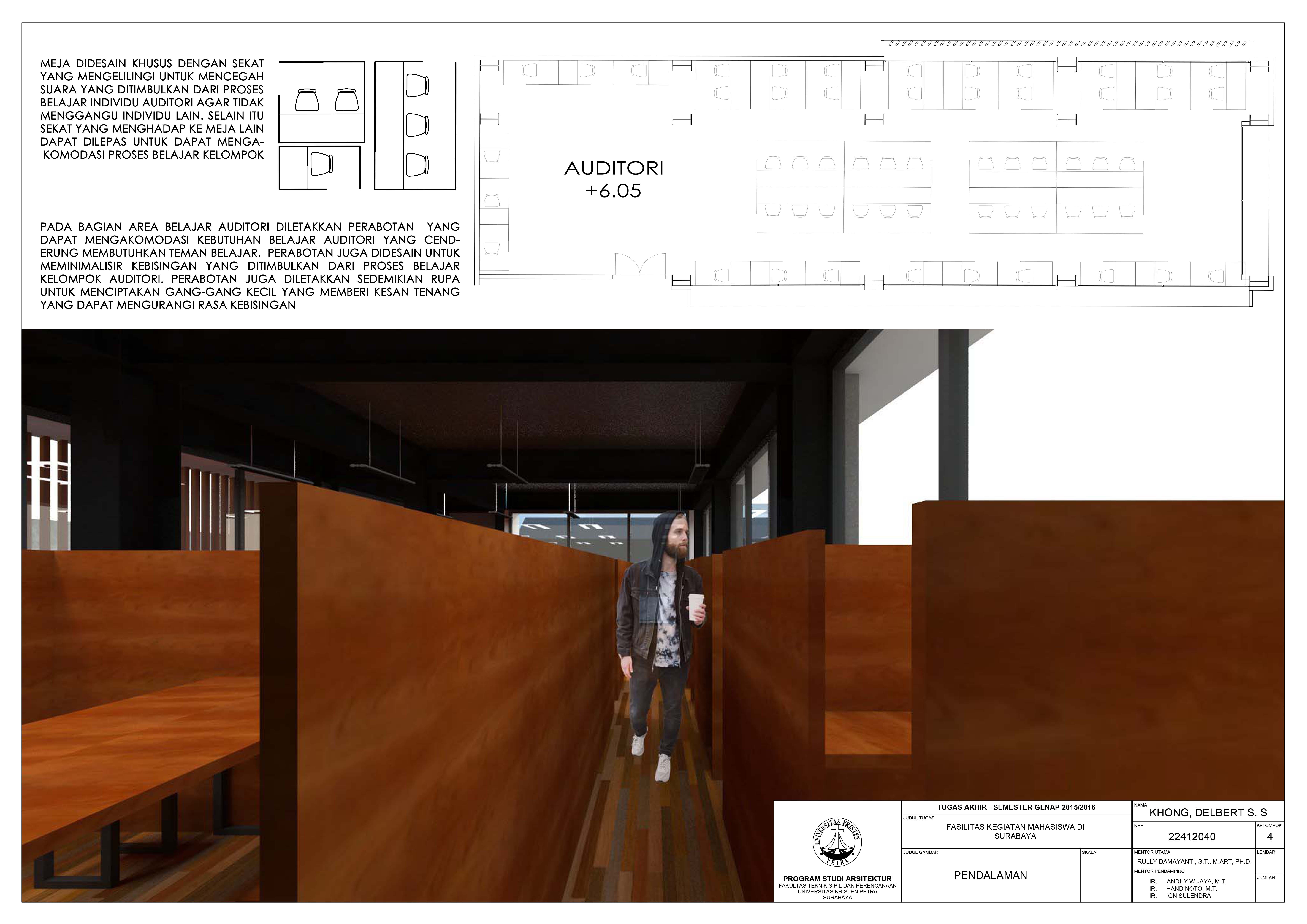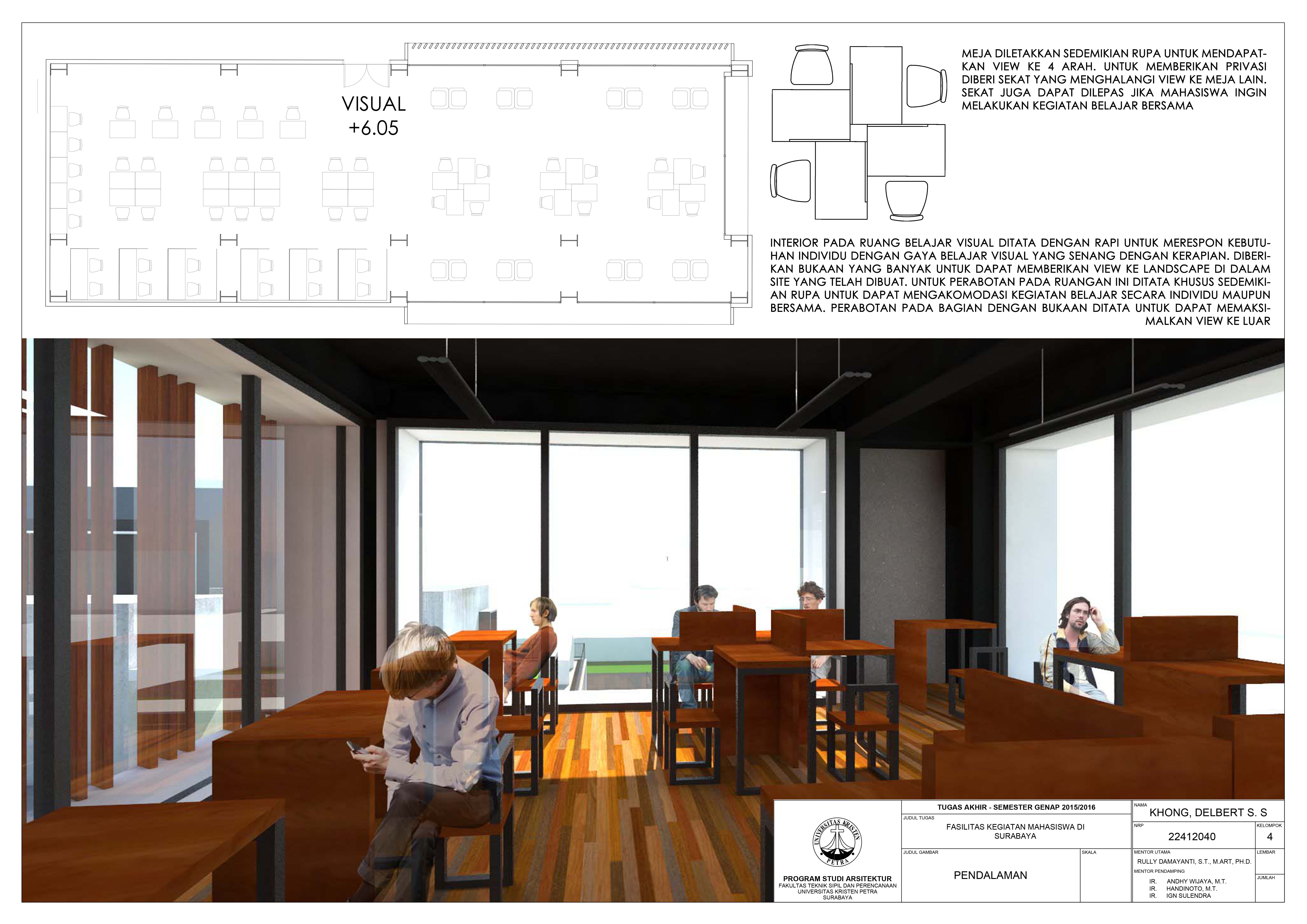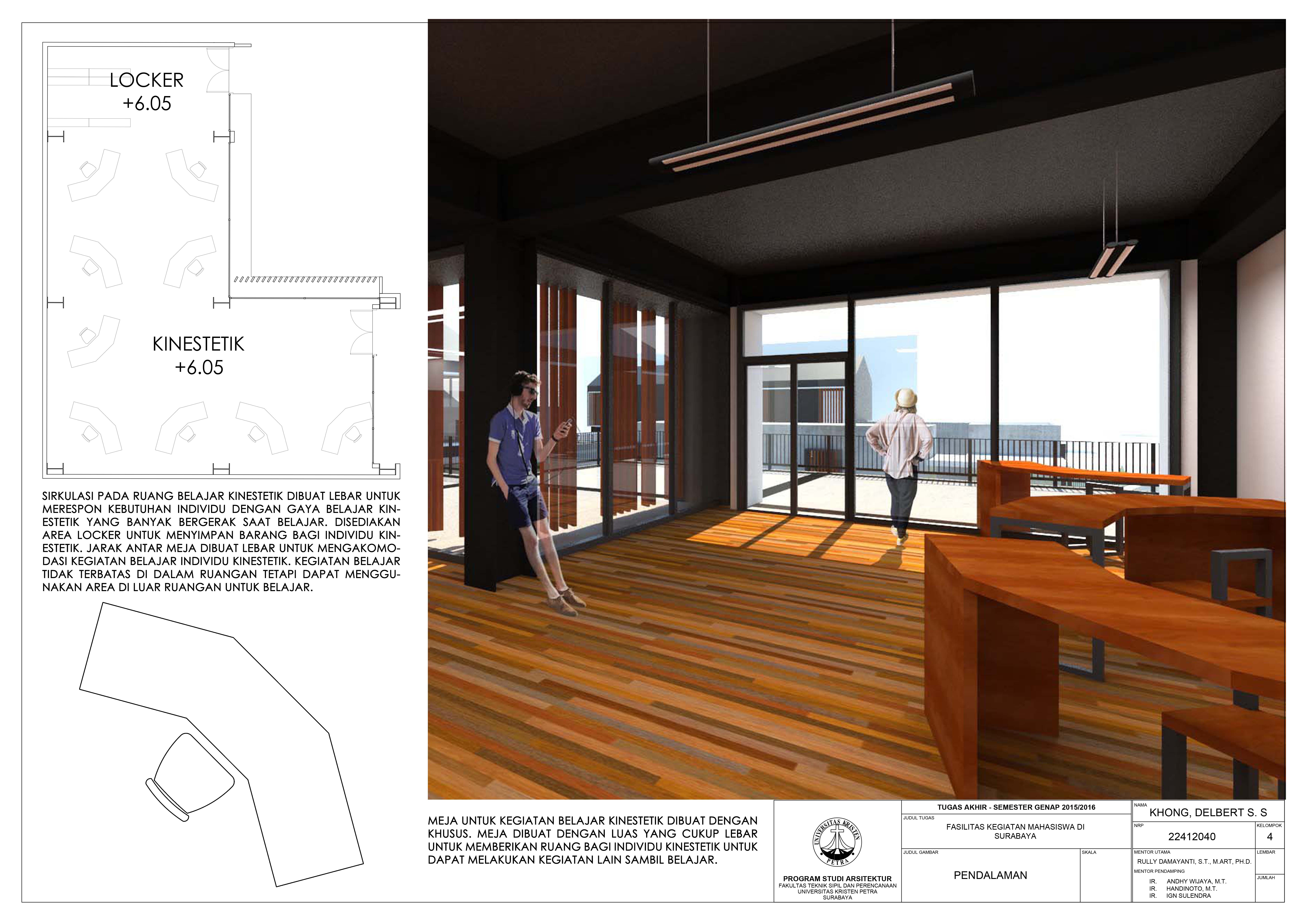 Kota Surabaya memiliki banyak fasilitas pendidikan dan merupakan tempat bagi beberapa universitas terbaik di Indonesia. Keadaan ini kurang didukung dengan fasilitas penunjang kegiatan belajar mahasiswa yang sesuai dengan gaya hidup anak muda sekarang. Fasilitas Kegiatan Mahasiswa ini merupakan fasilitas yang mewadahi kegiatan belajar tersebut dan juga aktivitas komunitas kreatif di luar jam perkuliahan. Kegiatan tersebut meliputi kegiatan akademis dan non-akademis. Konsep dari fasilitas ini adalah desain yang memperhatikan gaya belajar mahasiswa, yang dibagi dalam tiga kriteria yaitu visual, auditori, dan kinestetik. Pendekatan perilaku diaplikasikan untuk memahami masing-masing gaya belajar tersebut. Desain fasilitas ini juga disesuaikan dengan gaya hidup anak muda sekarang yaitu belajar sambil bersosialisasi. Sehingga fasilitas ini dilengkapi dengan perpustakaan, ruang seminar, ruang workshop, rent office, foodcourt, café, dan area duduk outdoor.