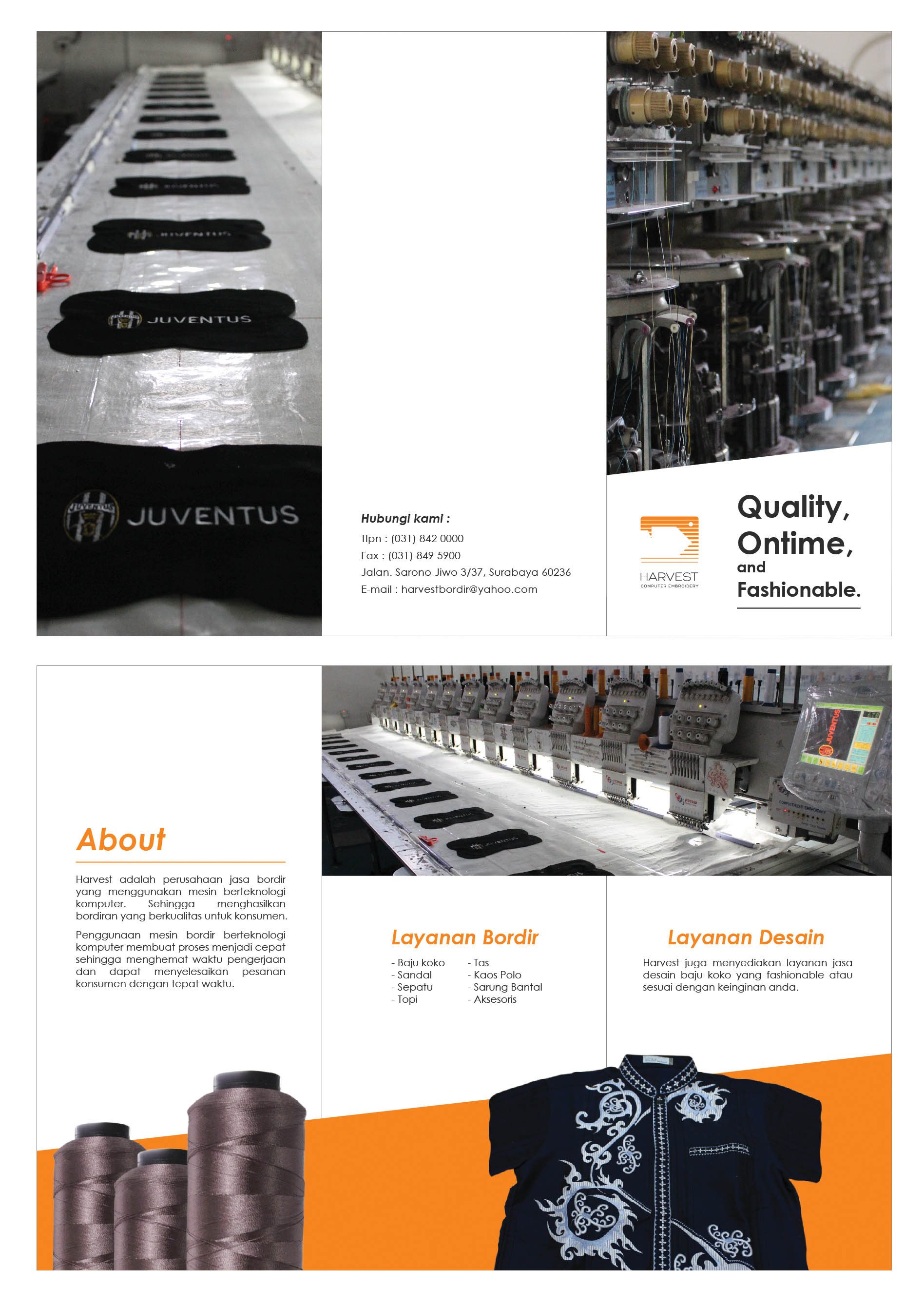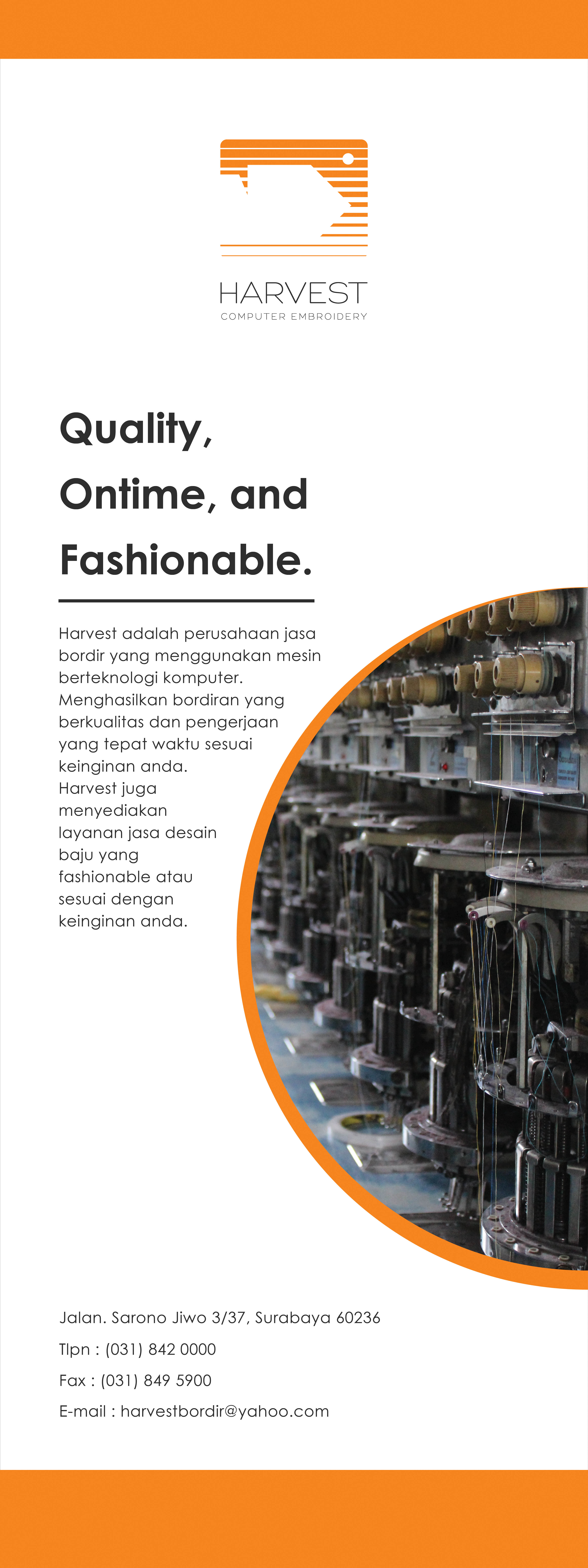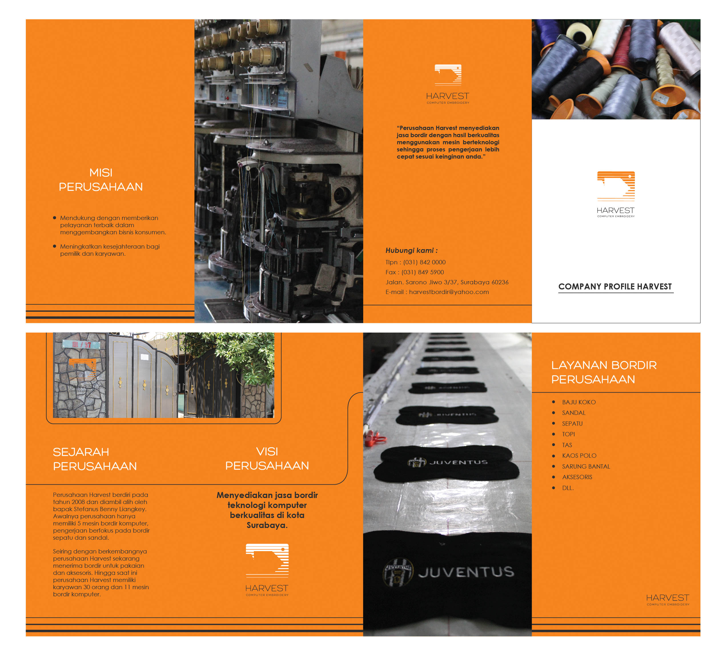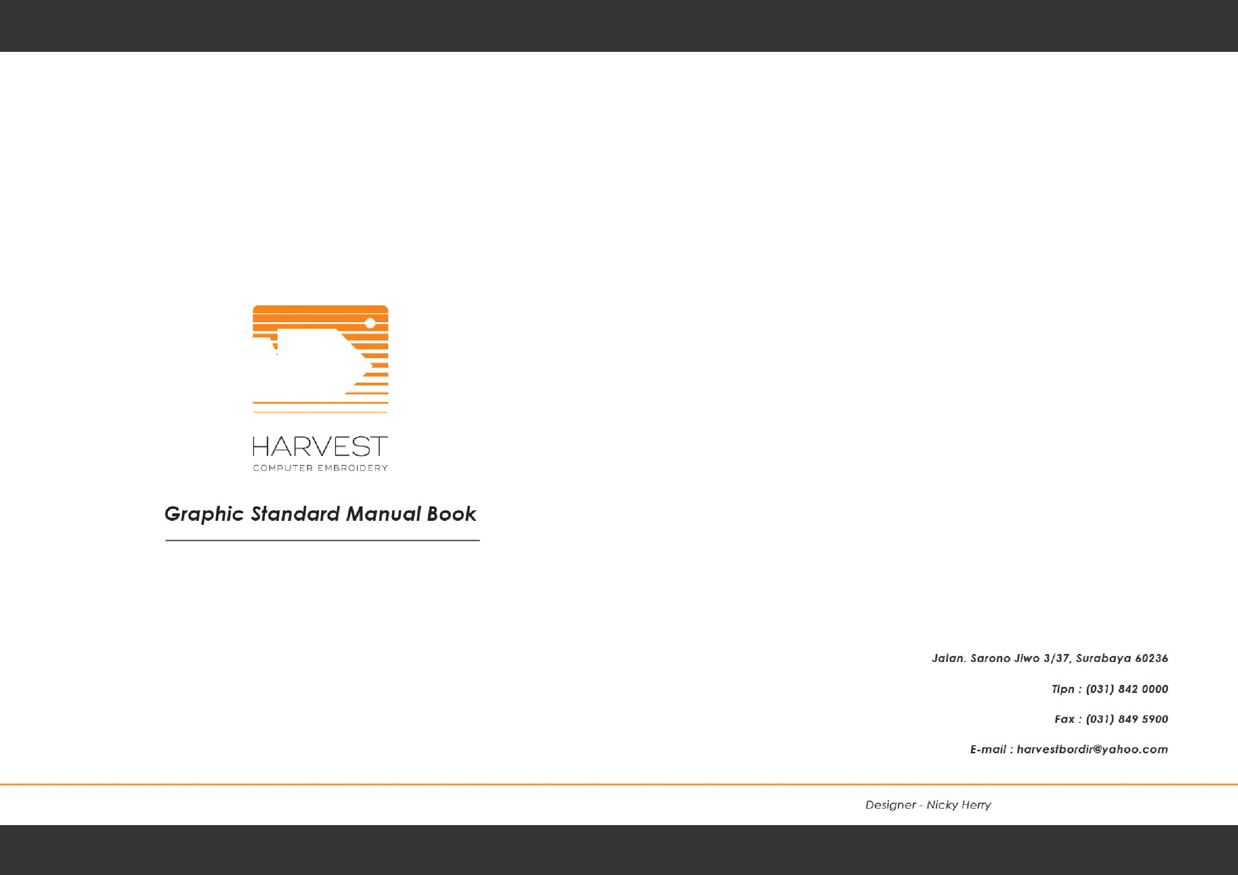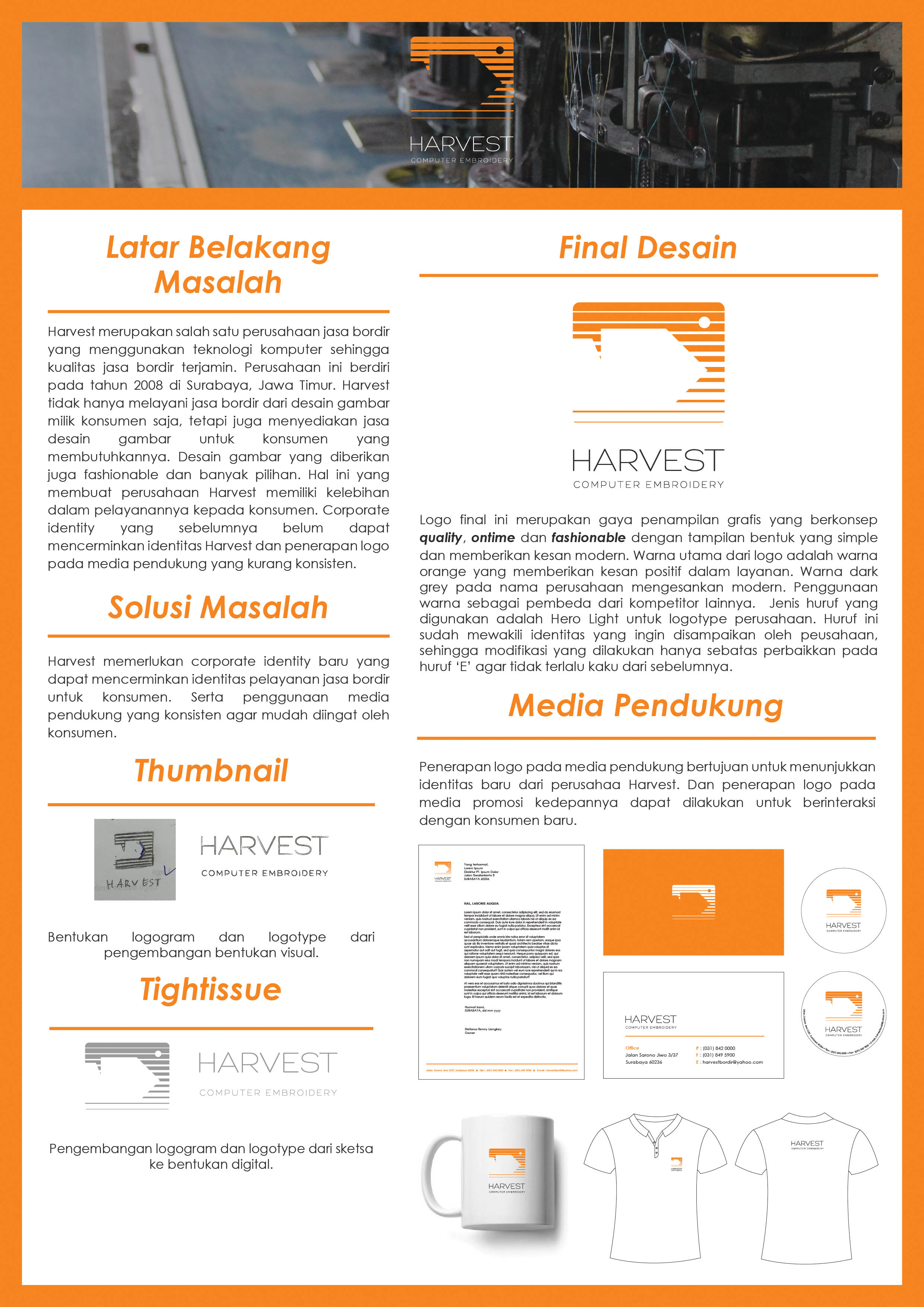 Harvest adalah perusahaan jasa bordir yang menggunakan mesin berteknologi komputer sehingga menghasilkan bordiran berkualitas di Surabaya. Sedangkan corporate identity yang dimiliki Harvest masih belum mencerminkan identitas perusahaan serta penerapan pada media yang kurang konsisten. Melalui proses perancangan corporate identity yang menggunakan makna simbolik pada identitas perusahaan dengan bentukan yang simple dan modern. Diharapkan coporate identity ini dapat mencerminkan identitas yang baru dari Harvest dan bisa bersaing dengan kompetitor. Corporate identity Harvest ini akan diaplikasikan pada media pendukung secara konsisten agar mudah diingat oleh konsumen.