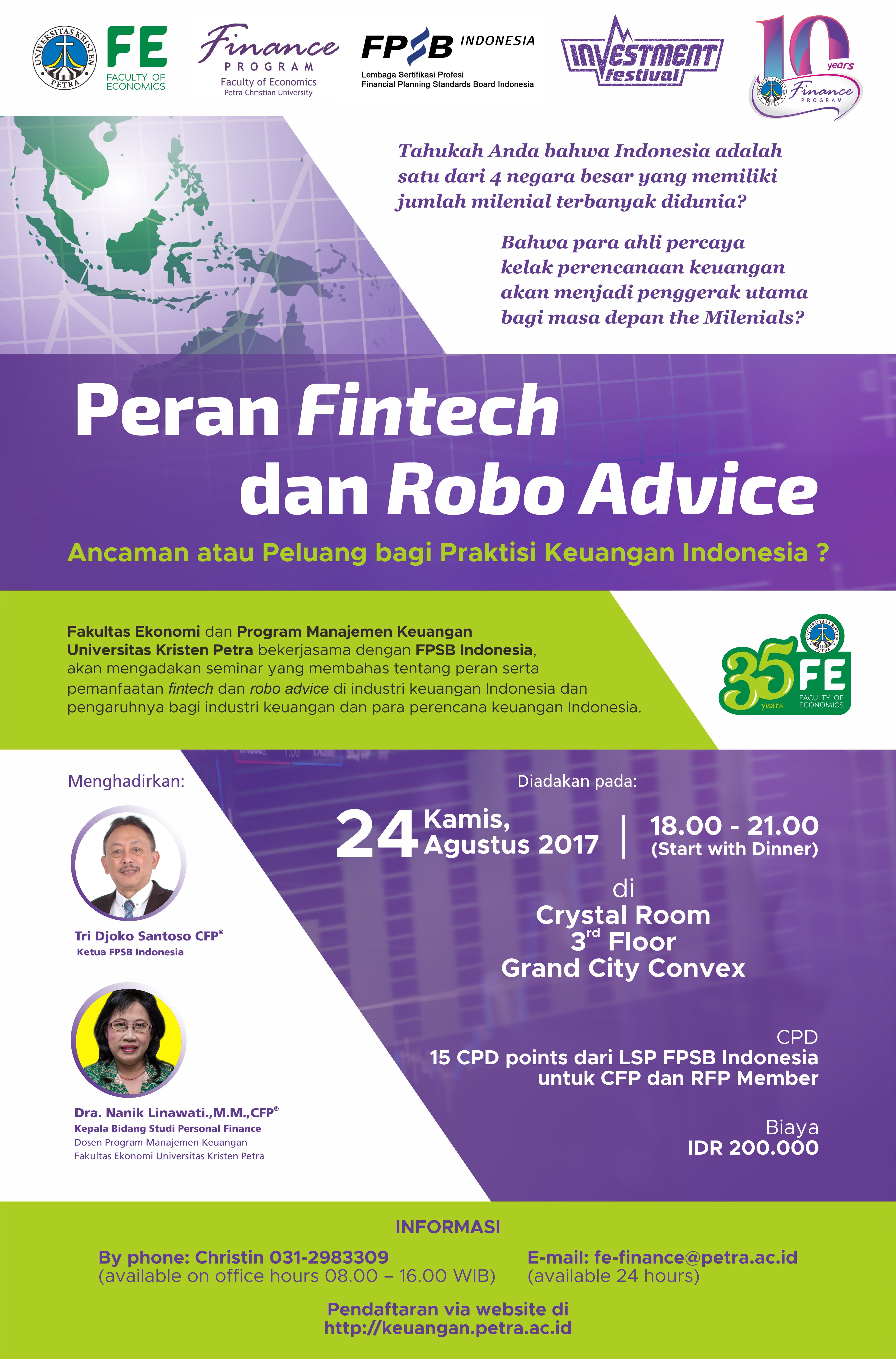Progdi Manajemen Keuangan Universitas Kristen Petra Surabaya mengadakan seminar dengan tema "Peran fintech dan robo advice". Acara ini diadakan pada Kamis, 24 Agustus 2017, bertempat di Crystal Room lantai 3, Grand City Convex Surabaya. Dengan Narasumber Bapak Tri Djoko Santoso dan Ibu Nanik Linawati.