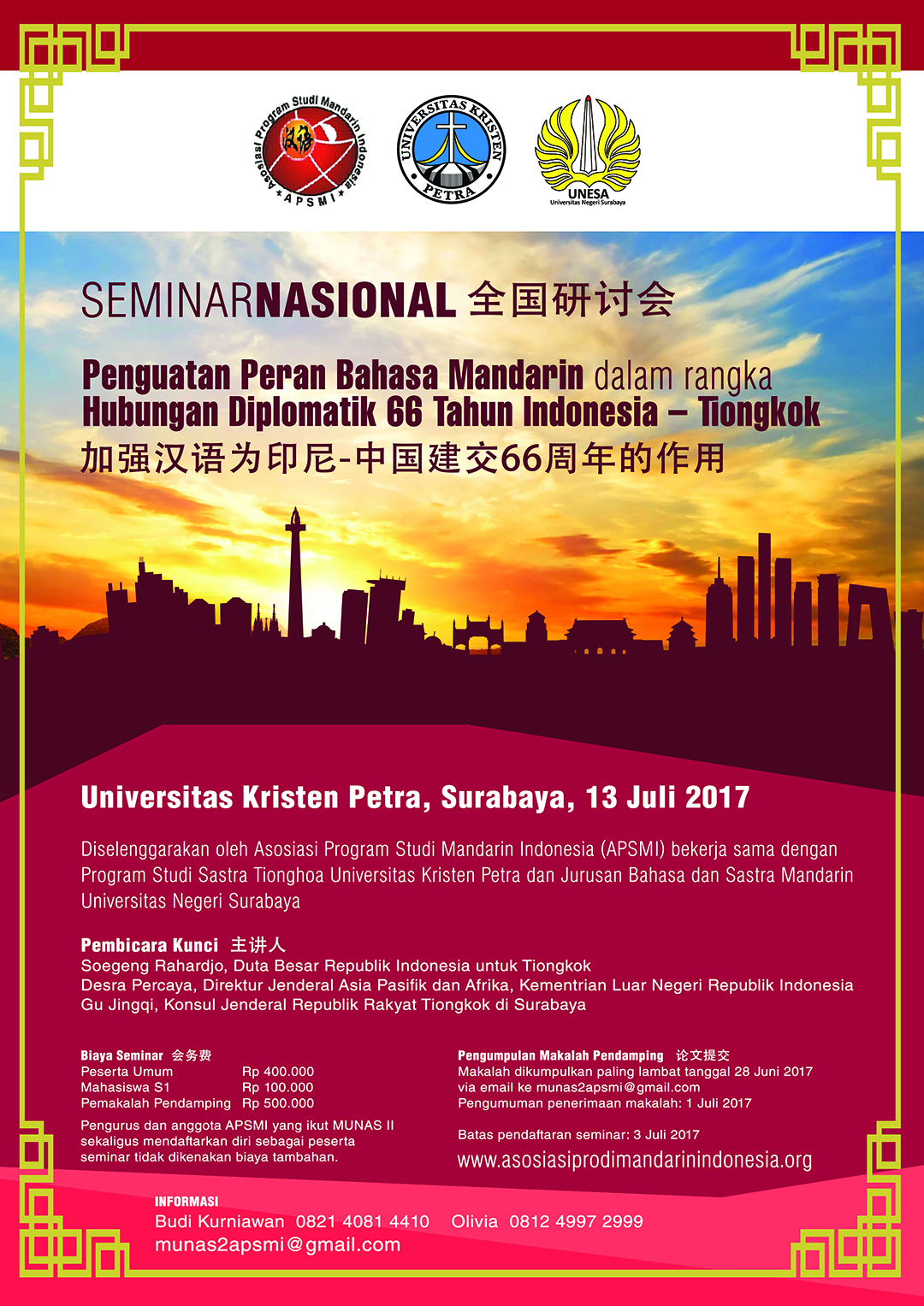 Program Studi Sastra Tionghoa Universitas mengdakan seminar nasional dengan topik penguatan peran bahasa mandarin dalam rangka hubungan diplomatik 66 tahun Indonesia-Tiongkok. Acara ini diadakan pada 13 Juli 2017 di kampus Universitas Kristen Petra Surabaya. Acara ini diselenggarakan atas kerjasama Progdi Sastra Tionghoa UK Petra dengan Asosiasi Program Studi Mandarin Indonesia (APSMI) dan Sastra Mandarin Unesa Surabaya.