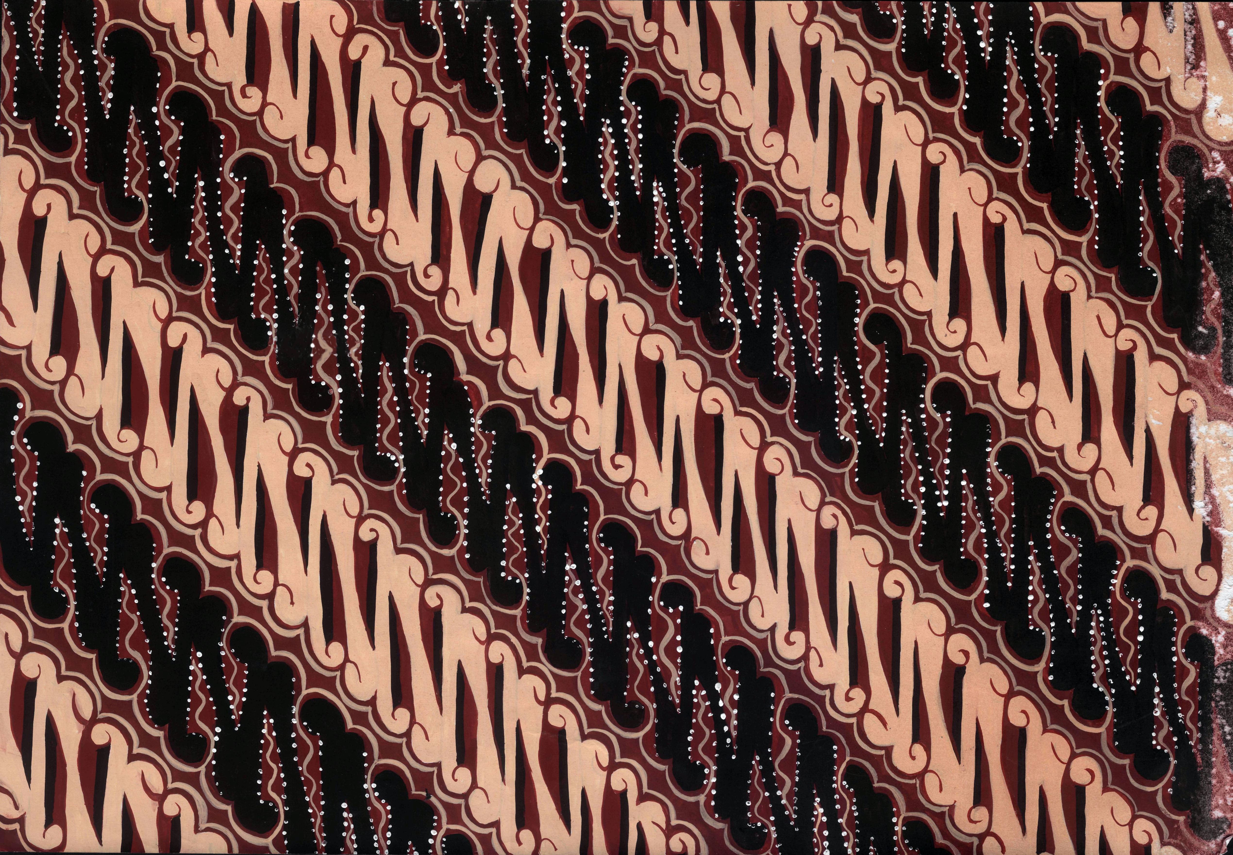 The Parang design consists of planting rows of thick knife like segments running in parallel diagonal bands. Parang ussualy alternated with narrower bands in a darker contrasting color. These darker bands contain another design element, a line of lozenge-shaped motifs call mlinjon. These are many variations of this basic striped pattern with its elegant sweeping lines, with over forty parang designs recordes. The most famous is the "parang rusak" which in its most classical form consisting of rows of softly folded parang. This motif also appears in media other than batik, including woodcarving and as ornamentation gamelan musical instrument