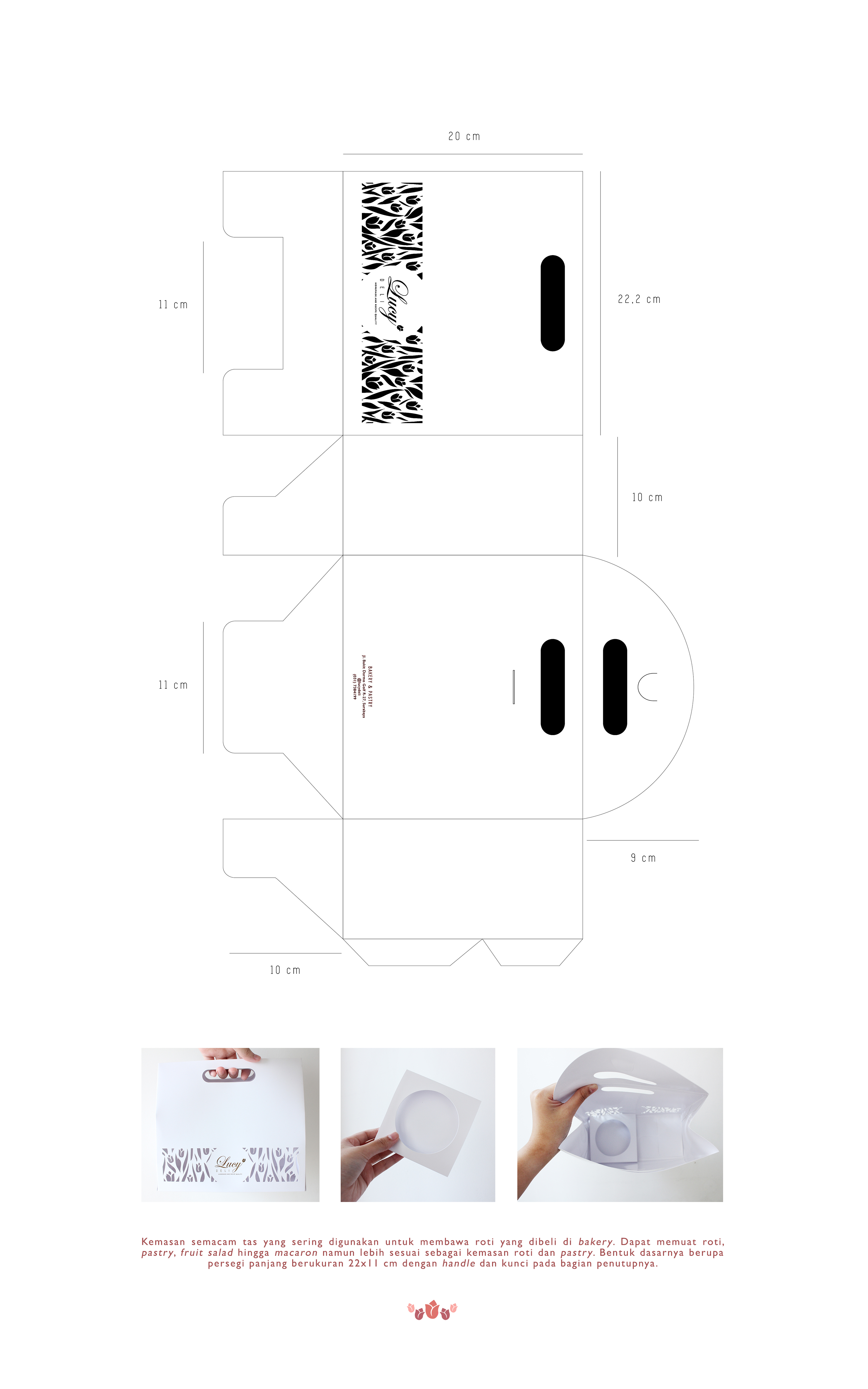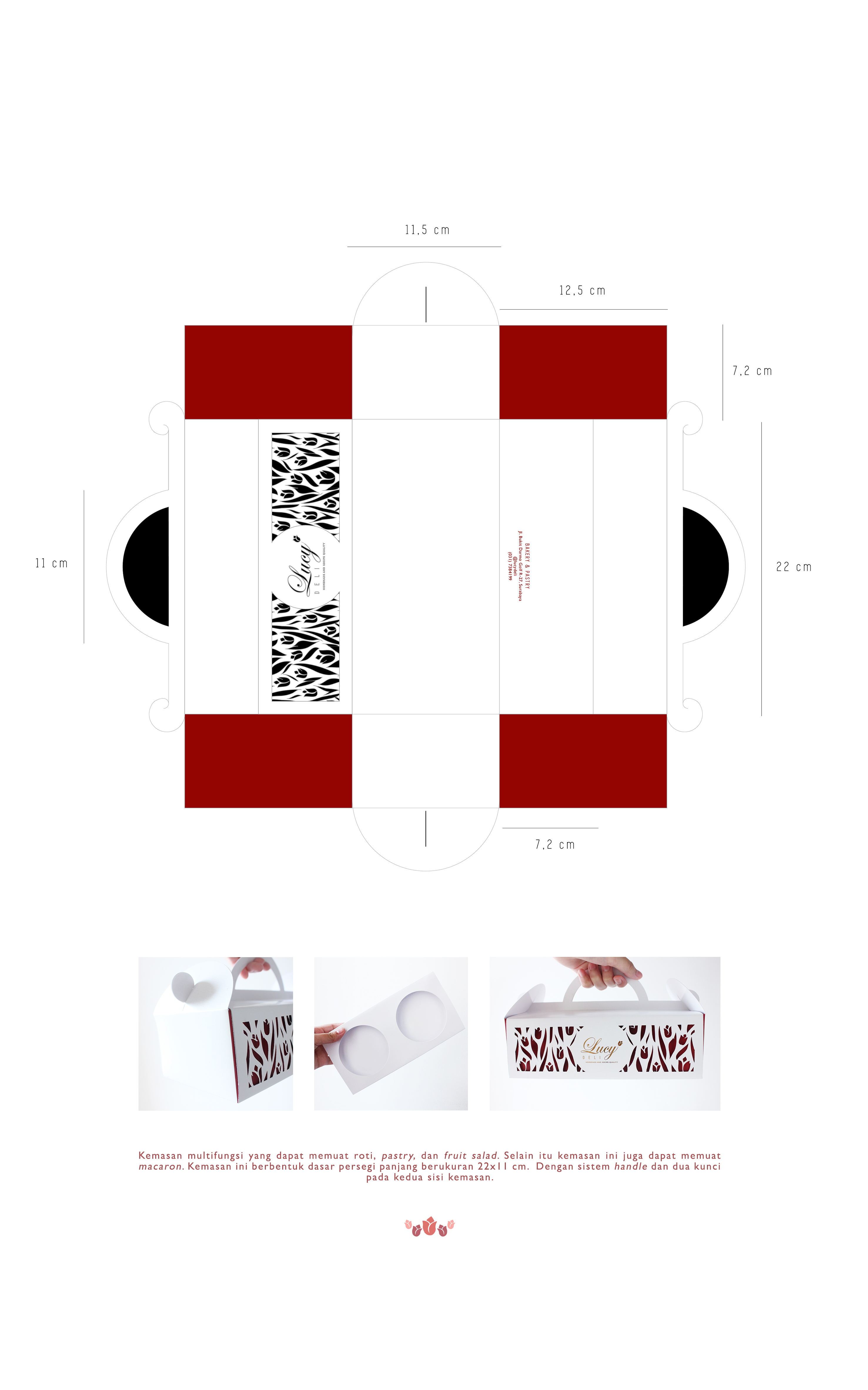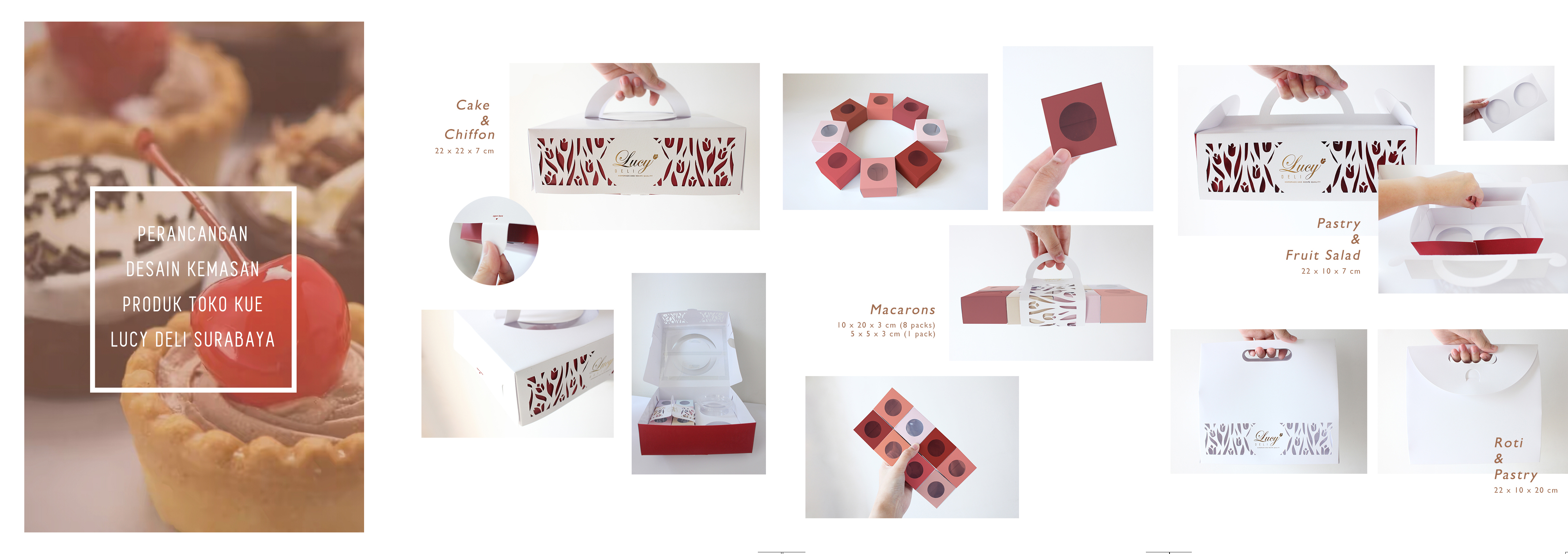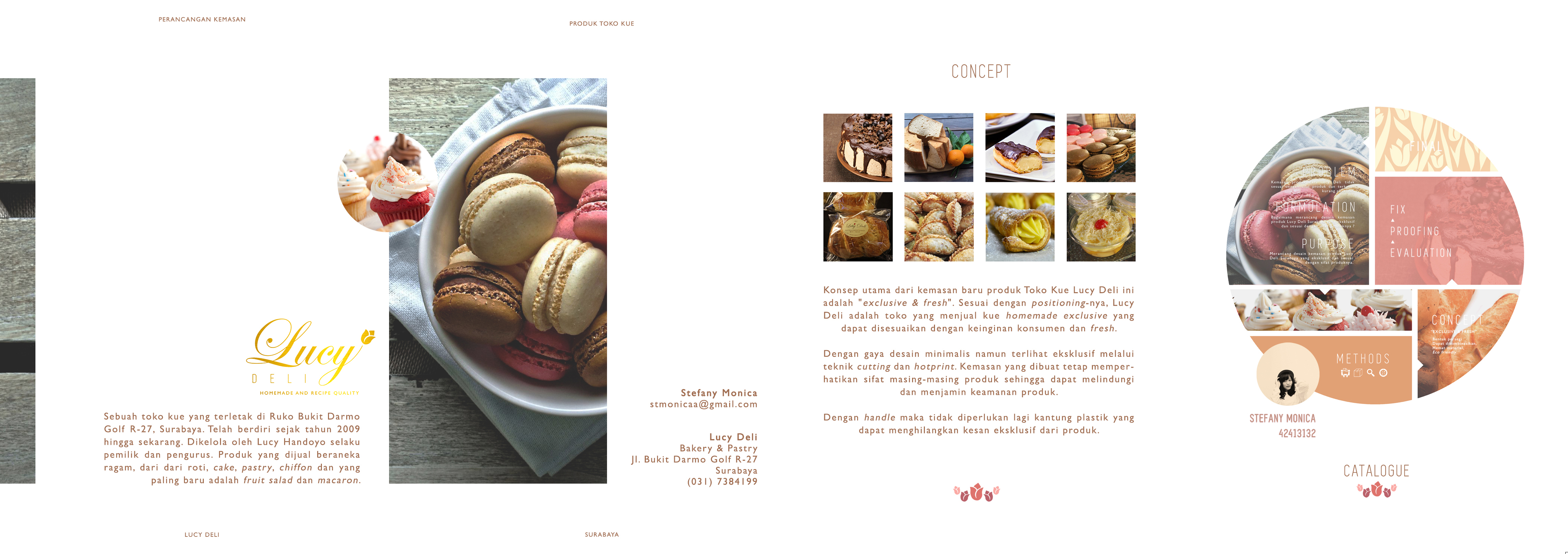 Lucy Deli adalah sebuah toko kue di Surabaya yang telah berdiri sejak tahun 2009 hingga sekarang. Produk yang dijual beraneka ragam, dari roti, cake, pastry, chiffon dan yang paling baru adalah fruit salad dan macaron. Perancangan kemasan ini bertujuan untuk merancang desain kemasan yang eksklusif dan sesuai dengan sifat produknya. Data-data pendukung didapat melalui wawancara dan observasi terhadap produk Lucy Deli beserta kemasannya, dan dianalisis dengan metode SWOT dan VIEW. Diharapkan kemasan yang baru dapat memberi perlindungan produk, kemudahan dalam membawa produk, serta menonjolkan identitas Lucy Deli yang exclusive dan fresh.