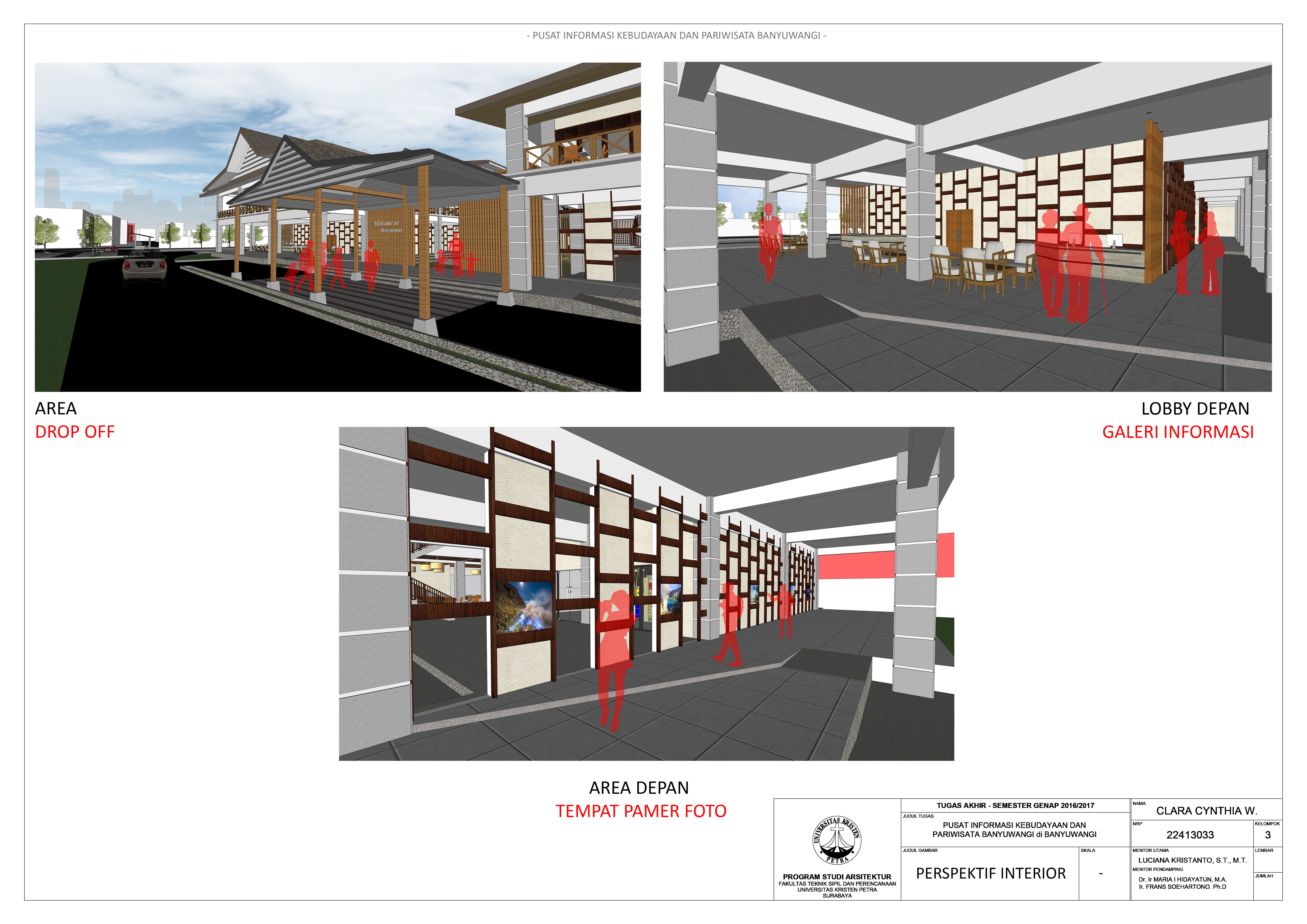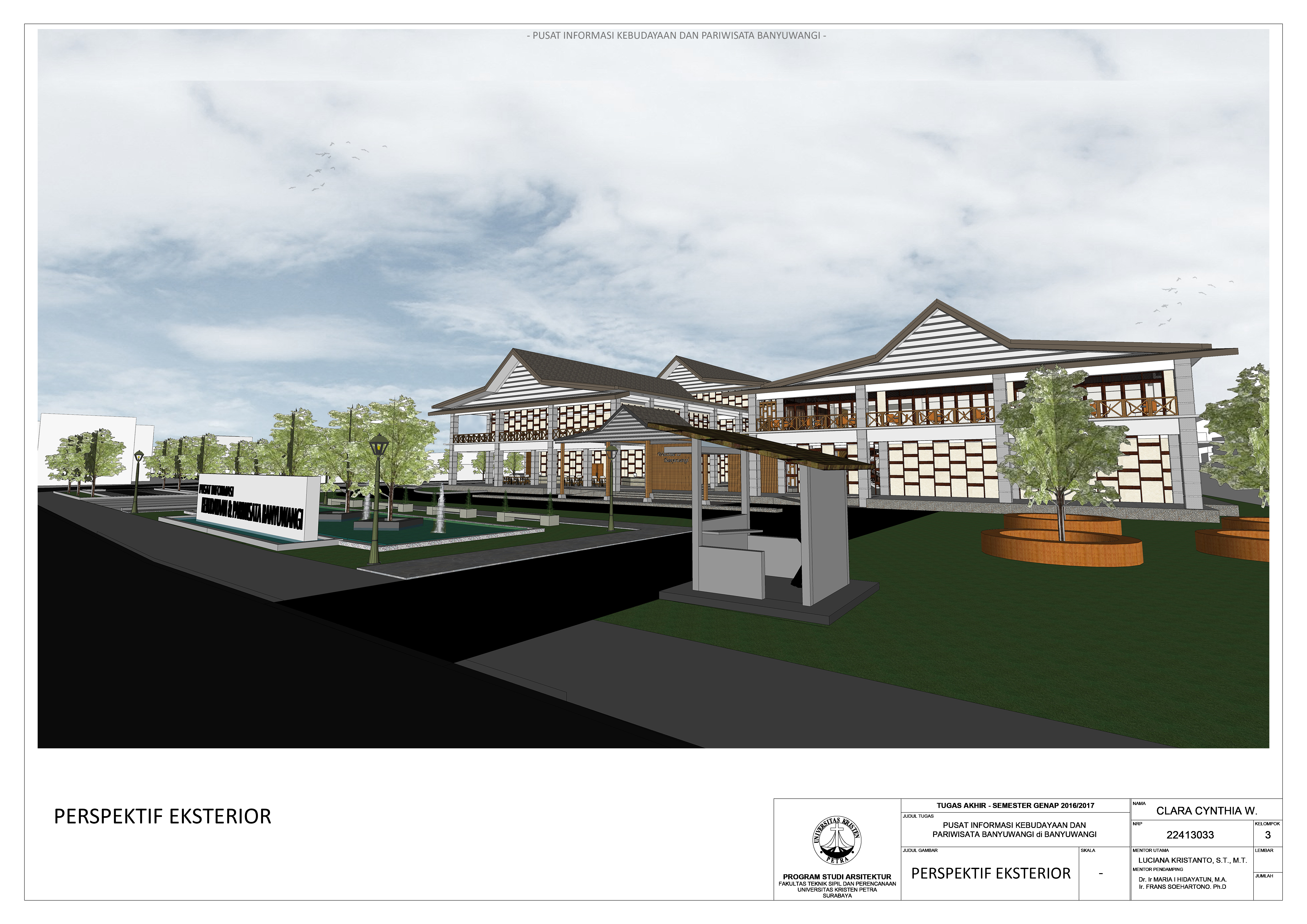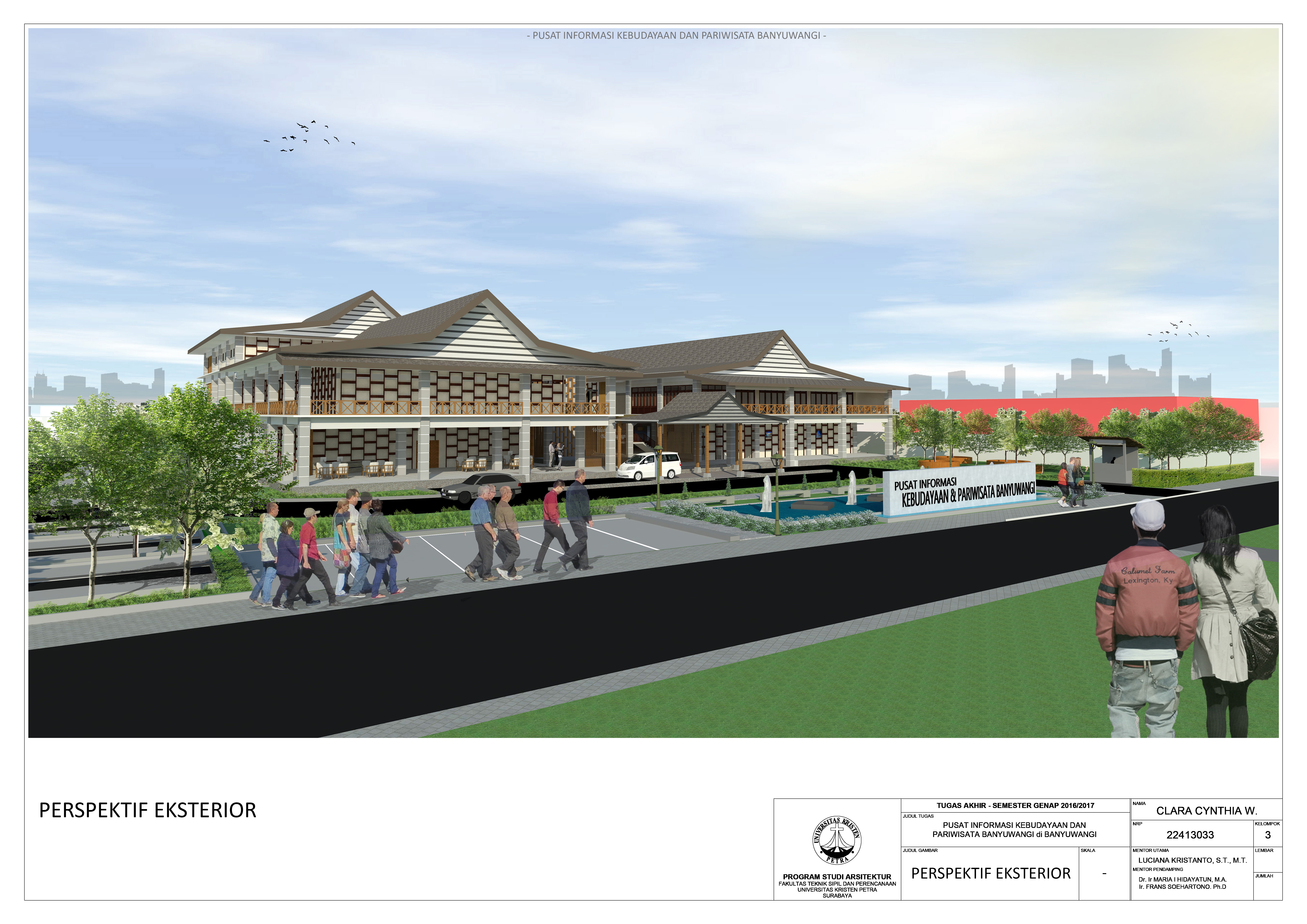 Pusat Informasi Kebudayaan dan Pariwisata Banyuwangi di Banyuwangi ini merupakan fasilitas yang dapat memberikan informasi untuk para wisatawan mengenai kebudayaan dan tempat wisata di Banyuwangi. Perkembangan Kabupaten Banyuwangi semakin meningkat, banyak kebudayaan yang menarik yang bisa dikenalkan kepada wisawatan domestik bahkan mancanegara yang berkunjung ke Banyuwangi. Oleh karena itu tujuan utama dari fasilitas ini adalah untuk memberikan informasi dan mengenalkan keanekaragaman kebudaayan Banyuwangi serta berbagai tempat wisata di Banyuwangi. Fasilitas pendukung lainnya terdapat ruang kelas untuk belajar kebudayaan Banyuwangi, toko souvenir, tempat kuliner khas Banyuwangi dan ruang serbaguna. Menggunakan pendekatan vernakular yang mengadopsi tampilan rumah adat suku Osing. Pendalaman karakter ruang yang diterapkan pada ruang-ruang dalam galeri informasi pariwisata dan area tengah panggung pertunjukan.