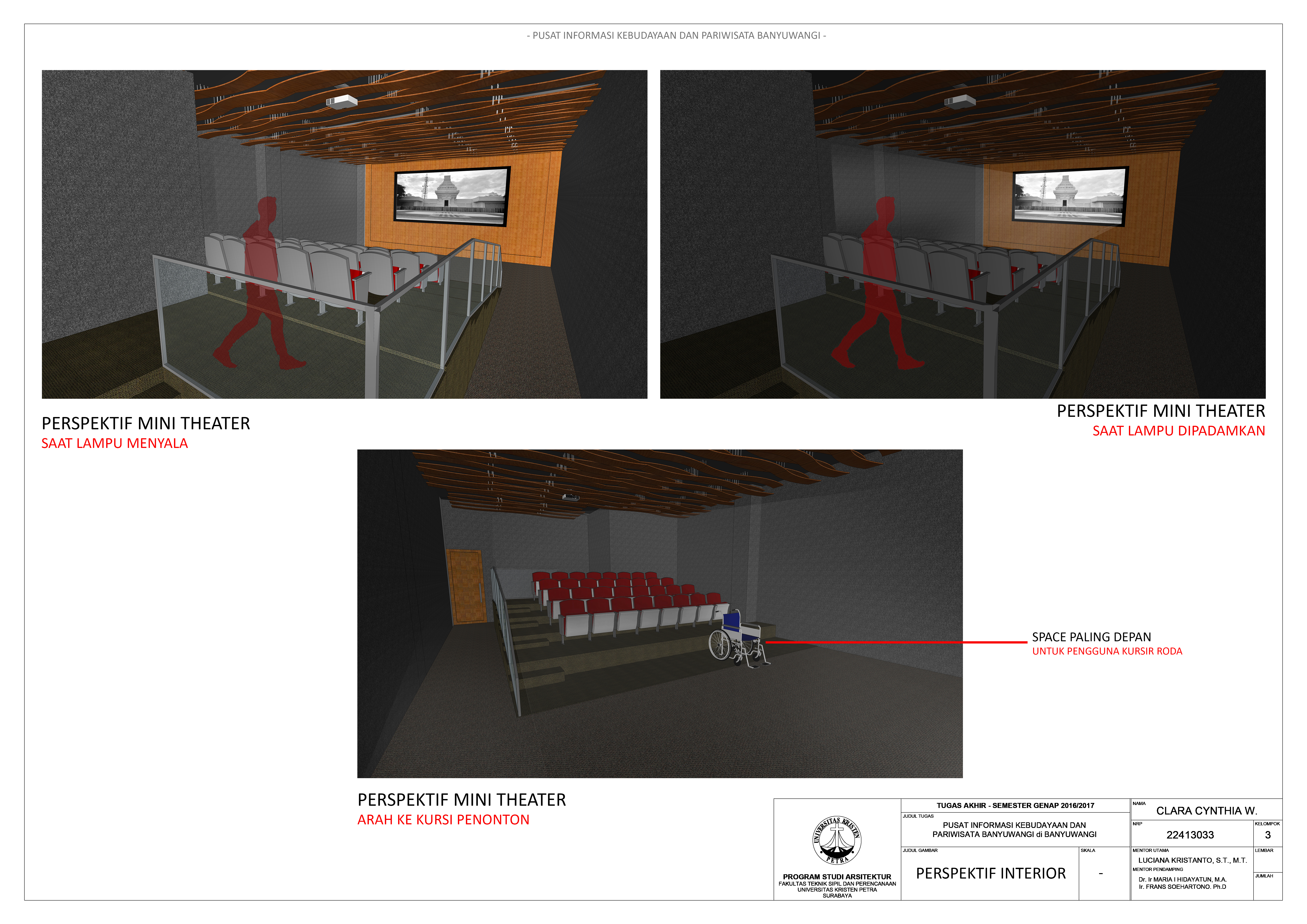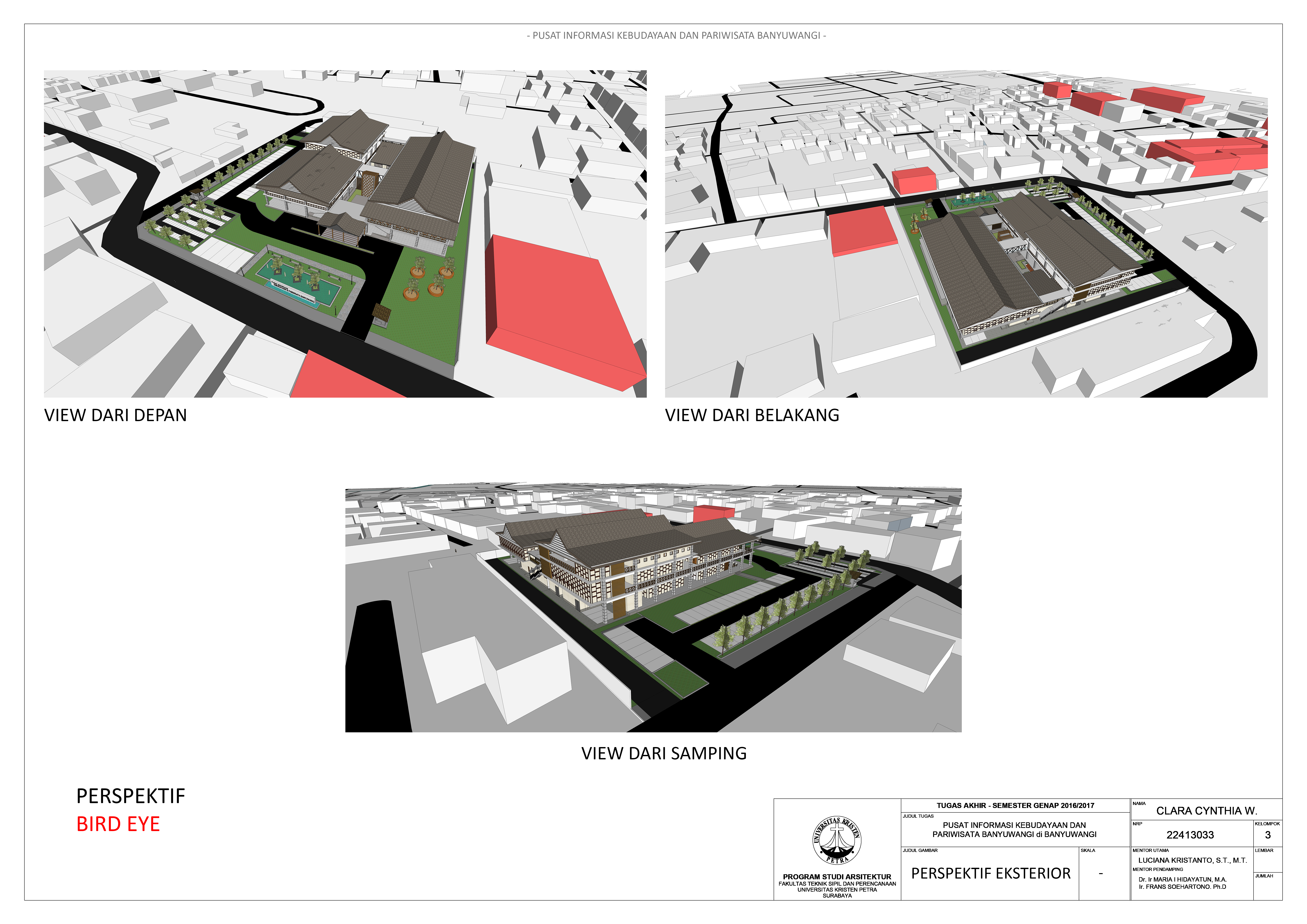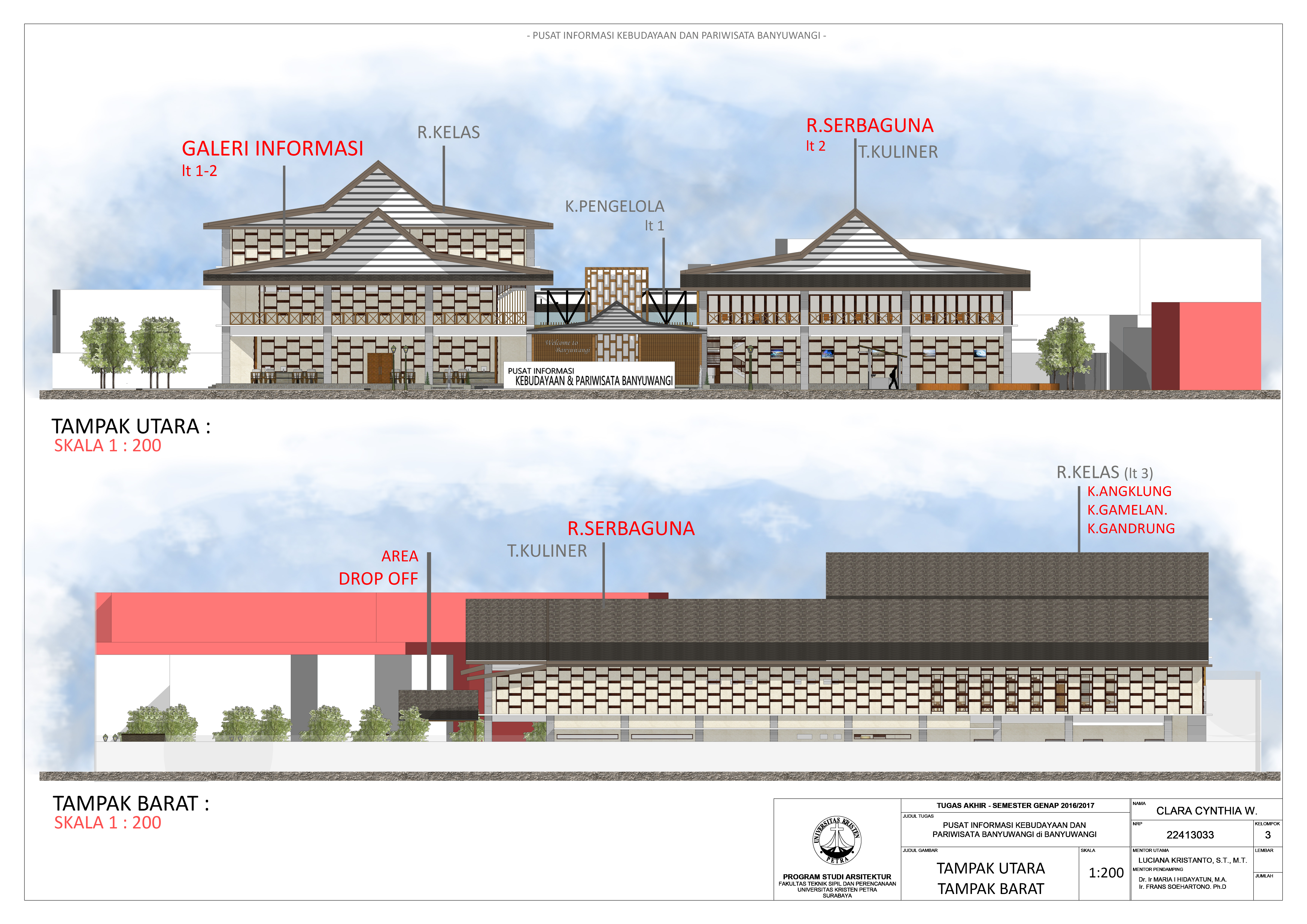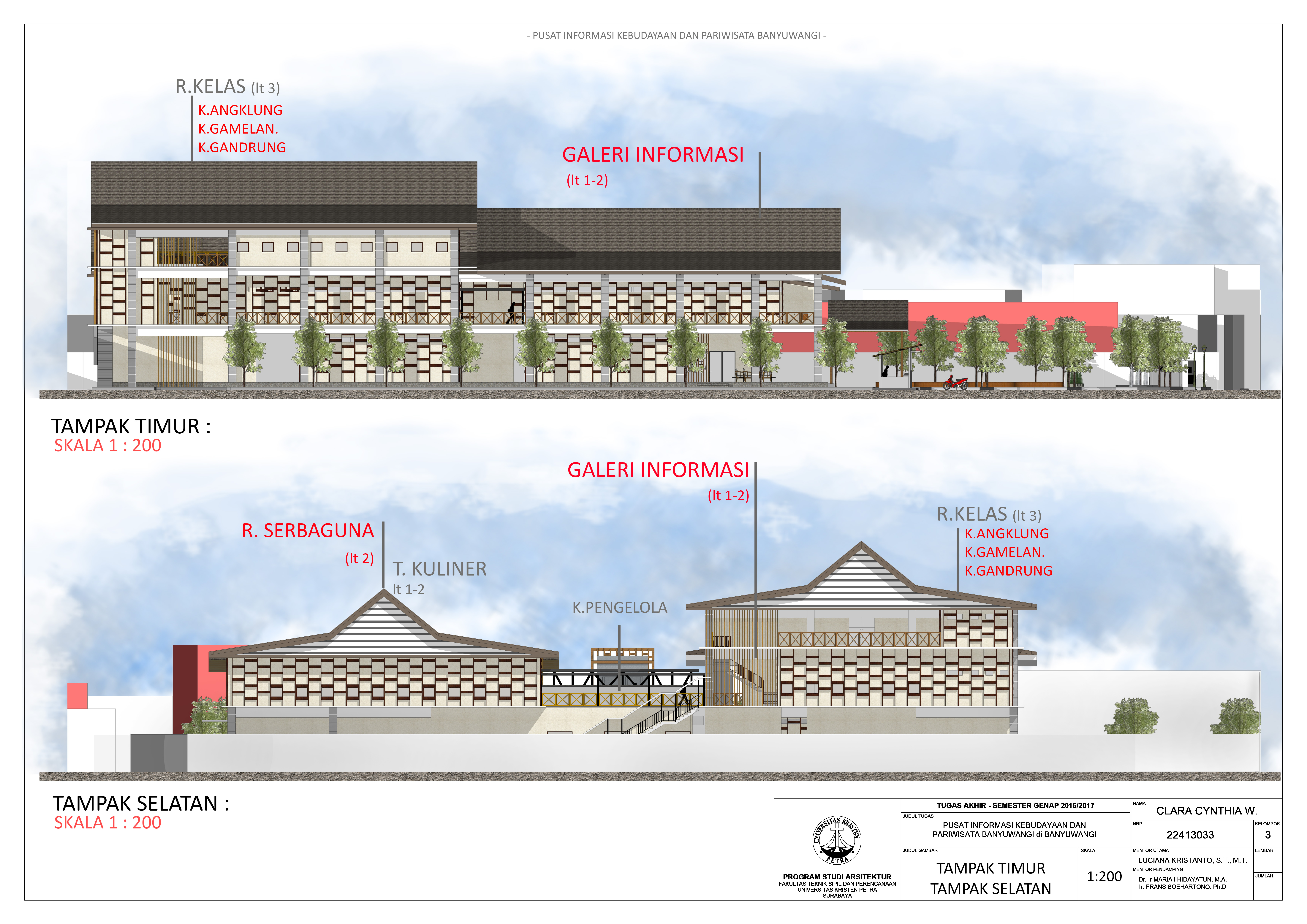 Pusat Informasi Kebudayaan dan Pariwisata Banyuwangi di Banyuwangi ini merupakan fasilitas yang dapat memberikan informasi untuk para wisatawan mengenai kebudayaan dan tempat wisata di Banyuwangi. Perkembangan Kabupaten Banyuwangi semakin meningkat, banyak kebudayaan yang menarik yang bisa dikenalkan kepada wisawatan domestik bahkan mancanegara yang berkunjung ke Banyuwangi. Oleh karena itu tujuan utama dari fasilitas ini adalah untuk memberikan informasi dan mengenalkan keanekaragaman kebudaayan Banyuwangi serta berbagai tempat wisata di Banyuwangi. Fasilitas pendukung lainnya terdapat ruang kelas untuk belajar kebudayaan Banyuwangi, toko souvenir, tempat kuliner khas Banyuwangi dan ruang serbaguna. Menggunakan pendekatan vernakular yang mengadopsi tampilan rumah adat suku Osing. Pendalaman karakter ruang yang diterapkan pada ruang-ruang dalam galeri informasi pariwisata dan area tengah panggung pertunjukan.