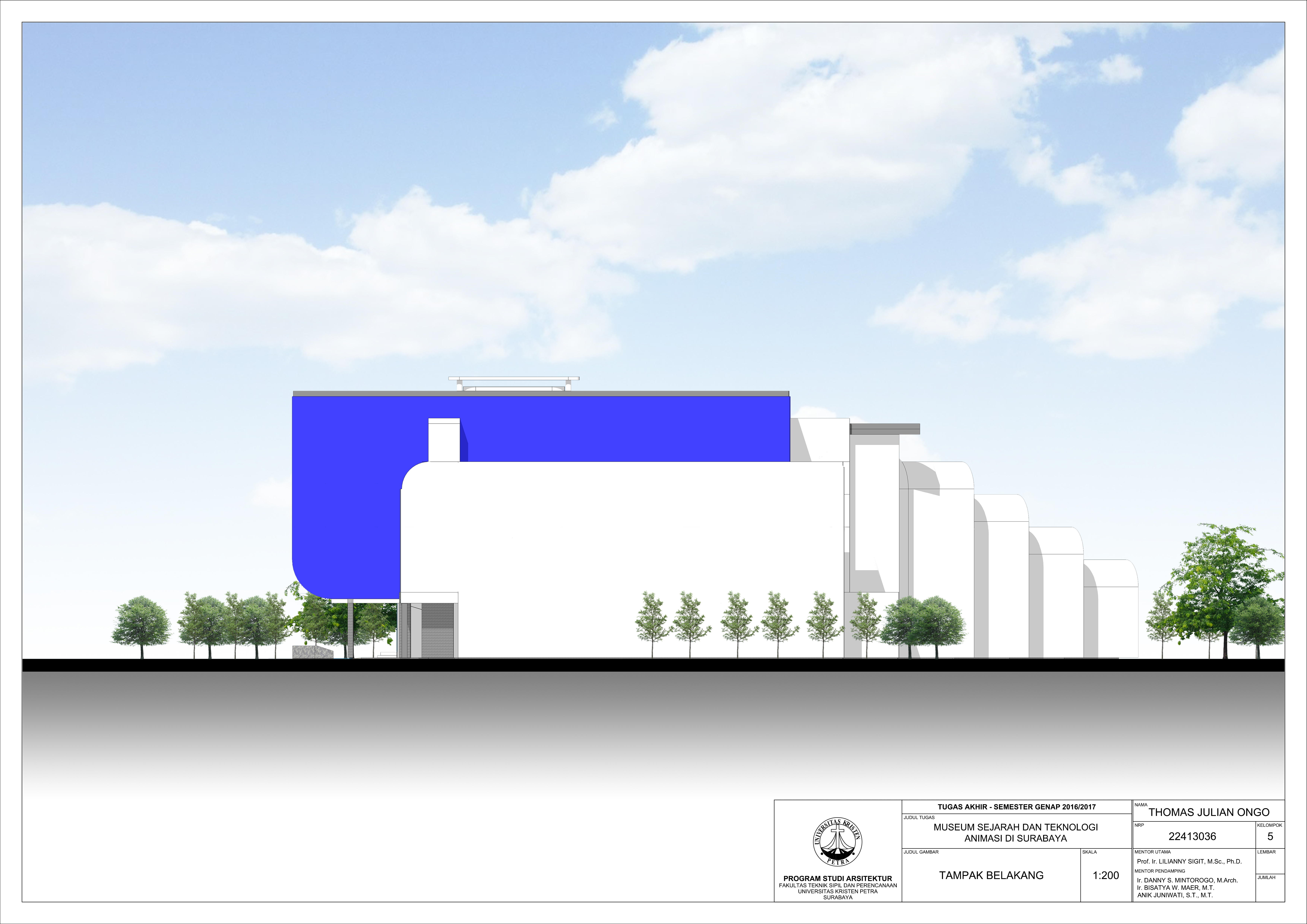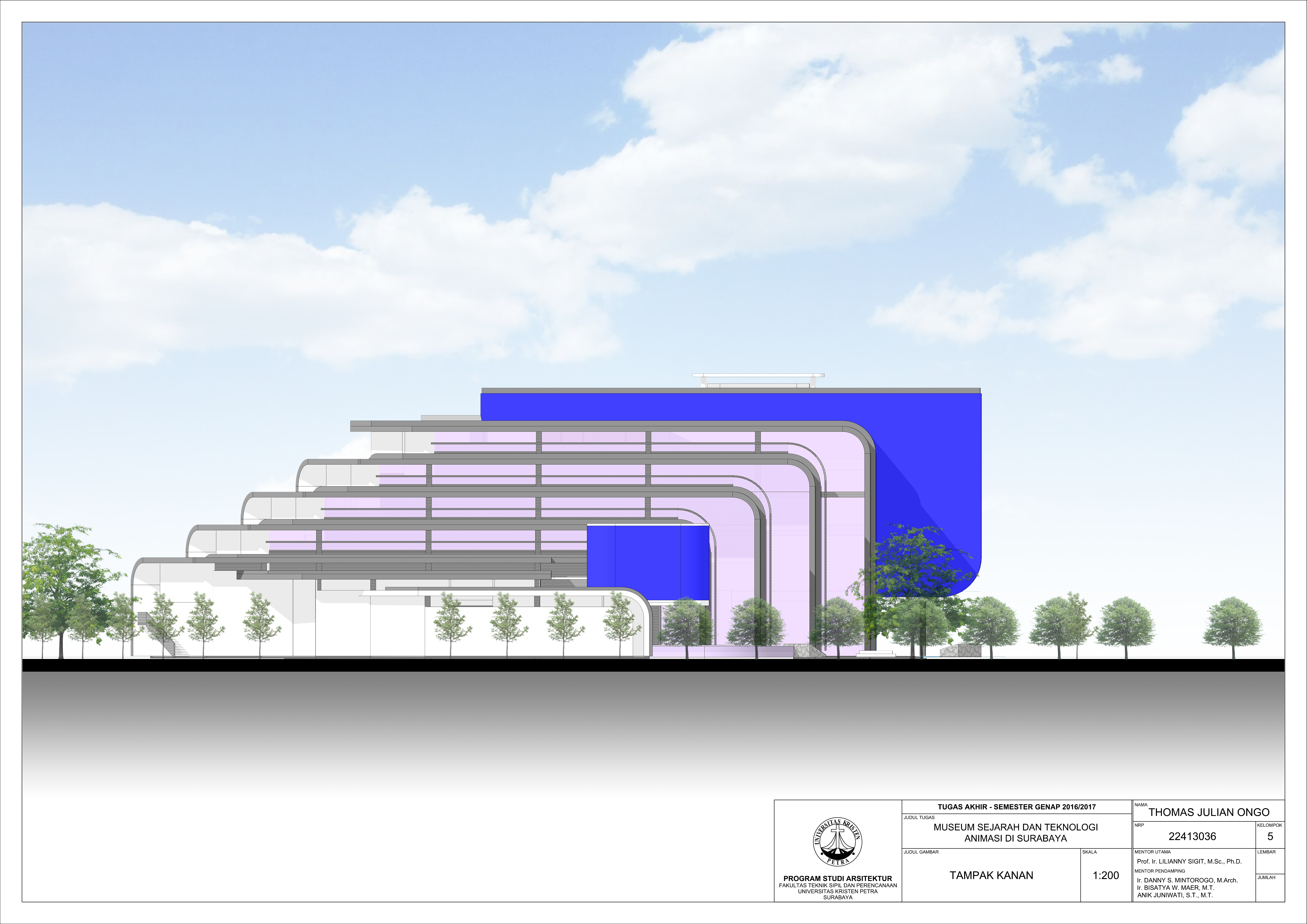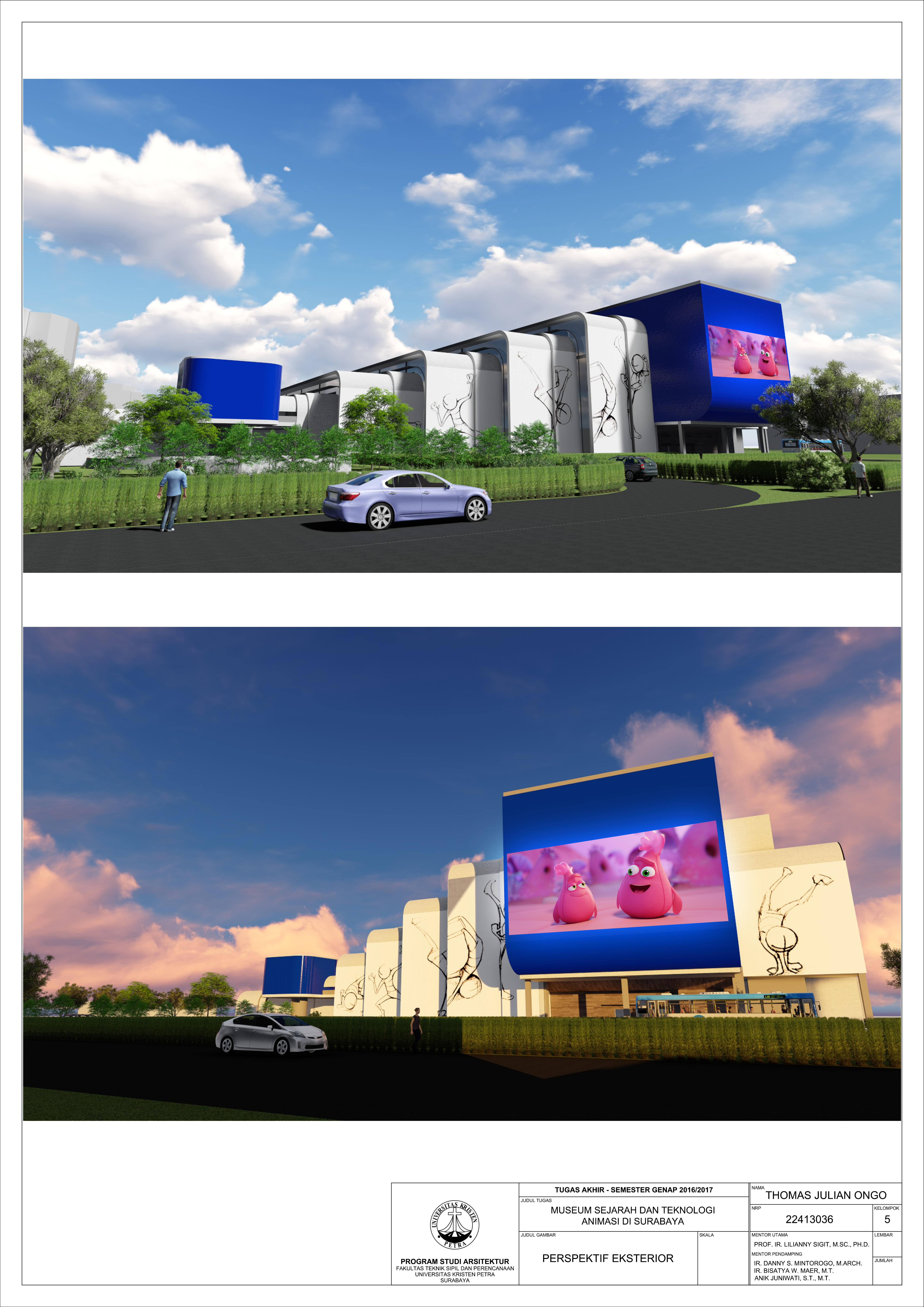 Museum Sejarah dan Teknologi Animasi di Surabaya” merupakan fasilitas umum milik swasta yang bukan hanya sebagai tempat menyimpan dan memaparkan bukti sejarah mengenai animasi di seluruh dunia namun juga menjadi fasilitas untuk memberikan edukasi dan inspirasi tentang animasi untuk banyak kalangan. Indonesia memiliki sejarah animasi yang tidak banyak masyarakat Indonesia ketahui. Animasi telah tergolong sebagai salah satu bidang ekonomi kreatif Indonesia yang sedang fokus dikembangkan oleh banyak lembaga. Pendekatan desain yang digunakan adalah pendekatan simbolik untuk menciptakan kesan animasi dalam arsitektur. Konsep perancangan menggunakan salah satu prinsip dasar animasi, “Timing and Spacing”. Zona museum dibagi menjadi 5 sesuai dengan eranya, yaitu The Origin of Animation, Film Animation: The Era of Experimentation, Film Animation: The Golden Age of Cartoon, The Television Age, dan The Digital Dawn. Museum ini dilengkapi dengan fasilitas publik, yaitu temporary exhibition yang dapat memberikan suasana baru dalam museum; ruang komunitas, perpustakaan, ruang kuliah untuk mewadahi aktivitas pengguna; restaurant, dan merchandise store untuk mendukung kenyamanan pengunjung.