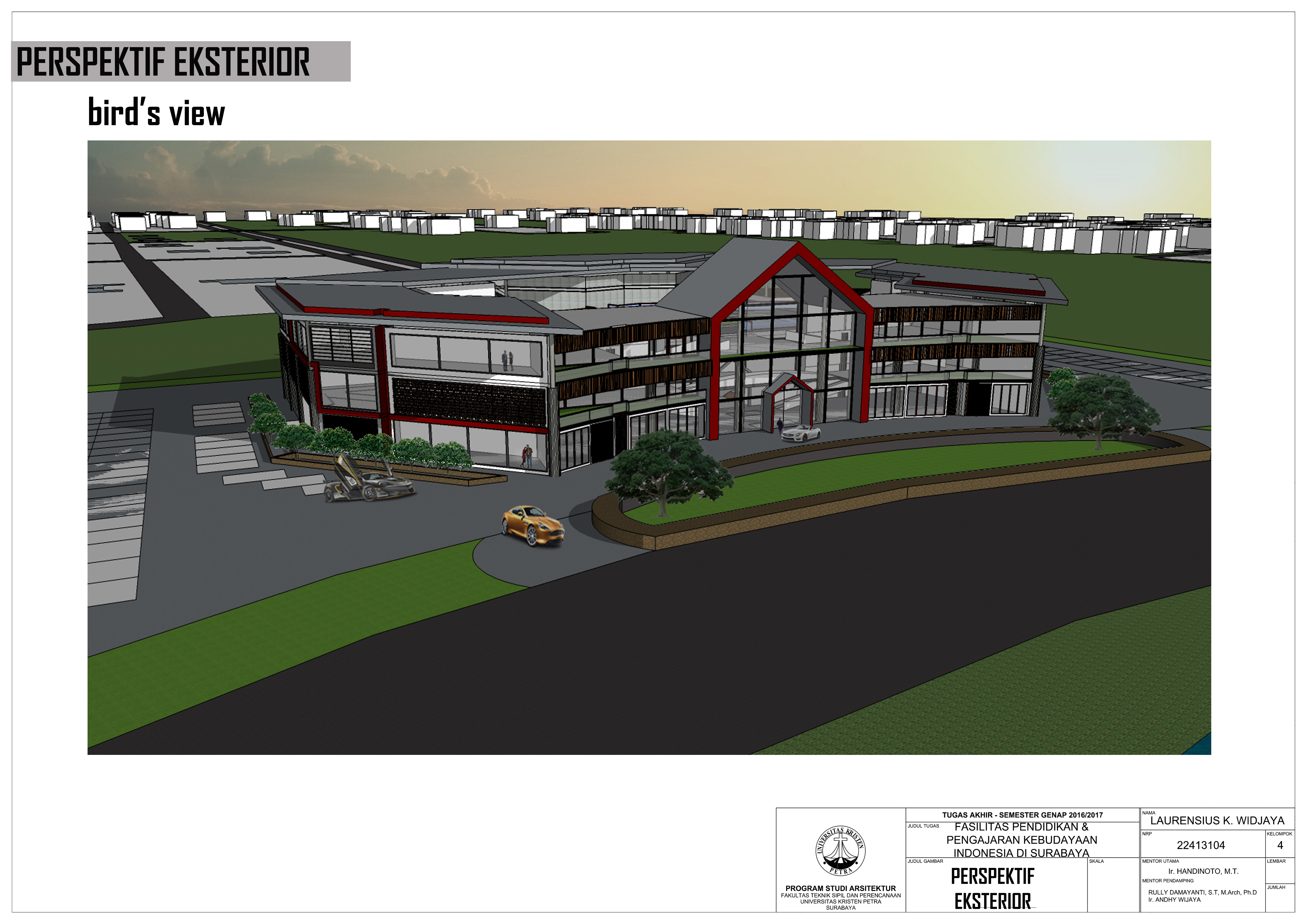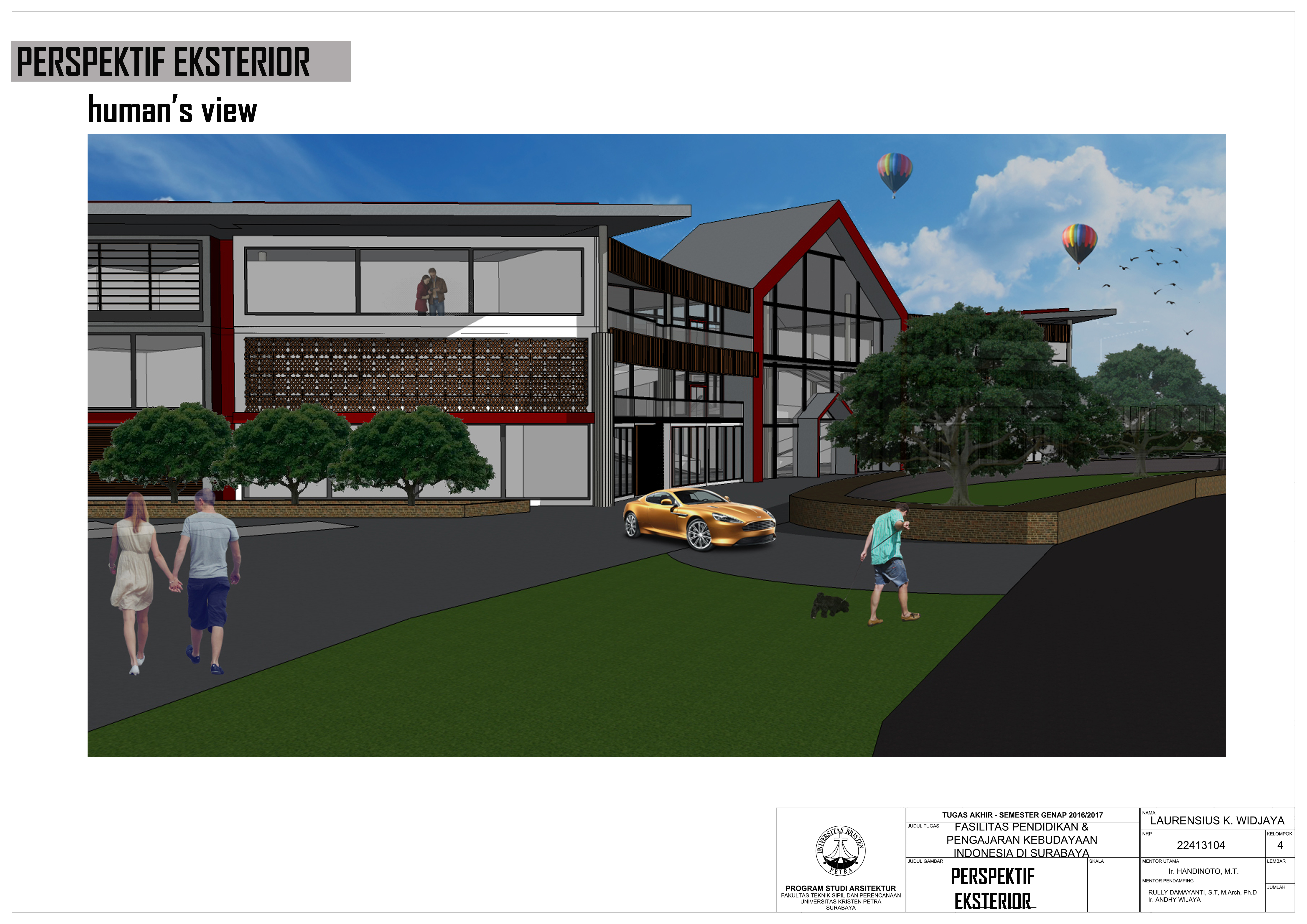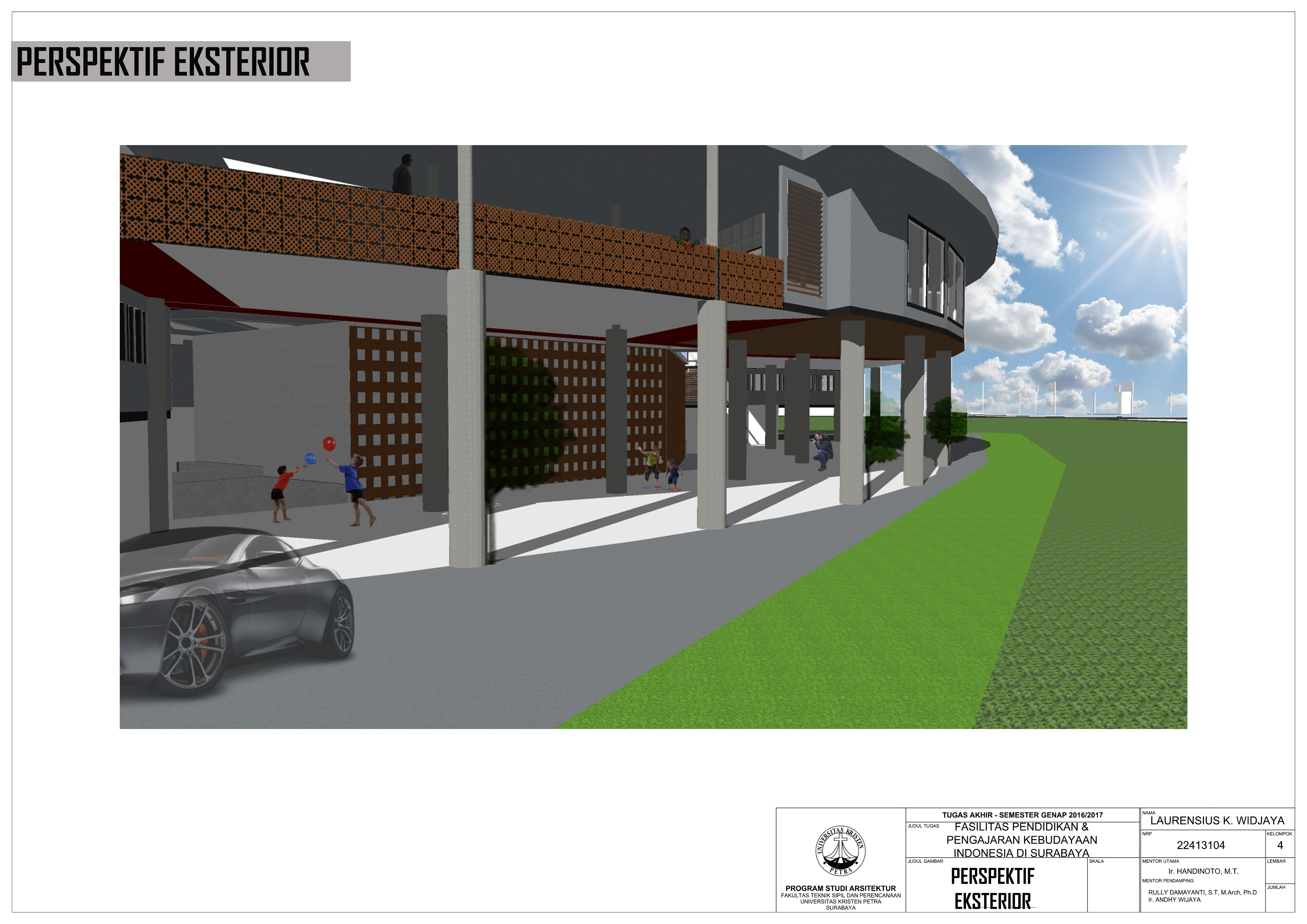 Fasilitas Pendidikan dan Pengajaran Kebudayaan Indonesia di Surabaya merupakan sebuah fasiitas untuk memberi wawasan tentang berbagai budaya yang ada di Indonesia. Serta ingin memberikan wawasan ulang mengenai kebudayaan yang sudah mulai ditinggalkan oleh masyarakat pada masa kini. Fasilitas ini juga dapat menjadi wadah bagi perkumpulan seniman-seniman untuk memamerkan karya-karyanya dengan tujuan agar masyarakat mengerti peranan dari budaya yang ada. Dengan ini, diharapkan agar masyarakat mau turut terlibat langusung dapat proses pembelajaran serta pelaksanaannya seperti disediakannya workshop di dalam fasilitas tersebut. Fasilitas ini akan dilengkapi fasilitas publik, yaitu commercial retail, communal space, entertainment center (ruang pameran indoor, ruang pameran terbuka, ruang multifungsi, dan perpustakaan), café/kantin, galeri, museum, souvenir shop, ruang audiovisual, ruang visual, ruang kinestetik, serta ruang diskusi. Pendekatan simbolik digunakan untuk memberikan area yang menarik sesuai dengan konsep yang ingin diterapkan yaitu, re-educate. Area tersebut diharapakan orang-orang dapat berinterkasi melalui area yang disediakan itu dengan pengertian bahwa belajar adalah suatu aktivitas yang tidak akan pernah berhenti dan belajar tidak hanya dilakukan secara individu tetapi dapat dilakukan secara bersama-sama.