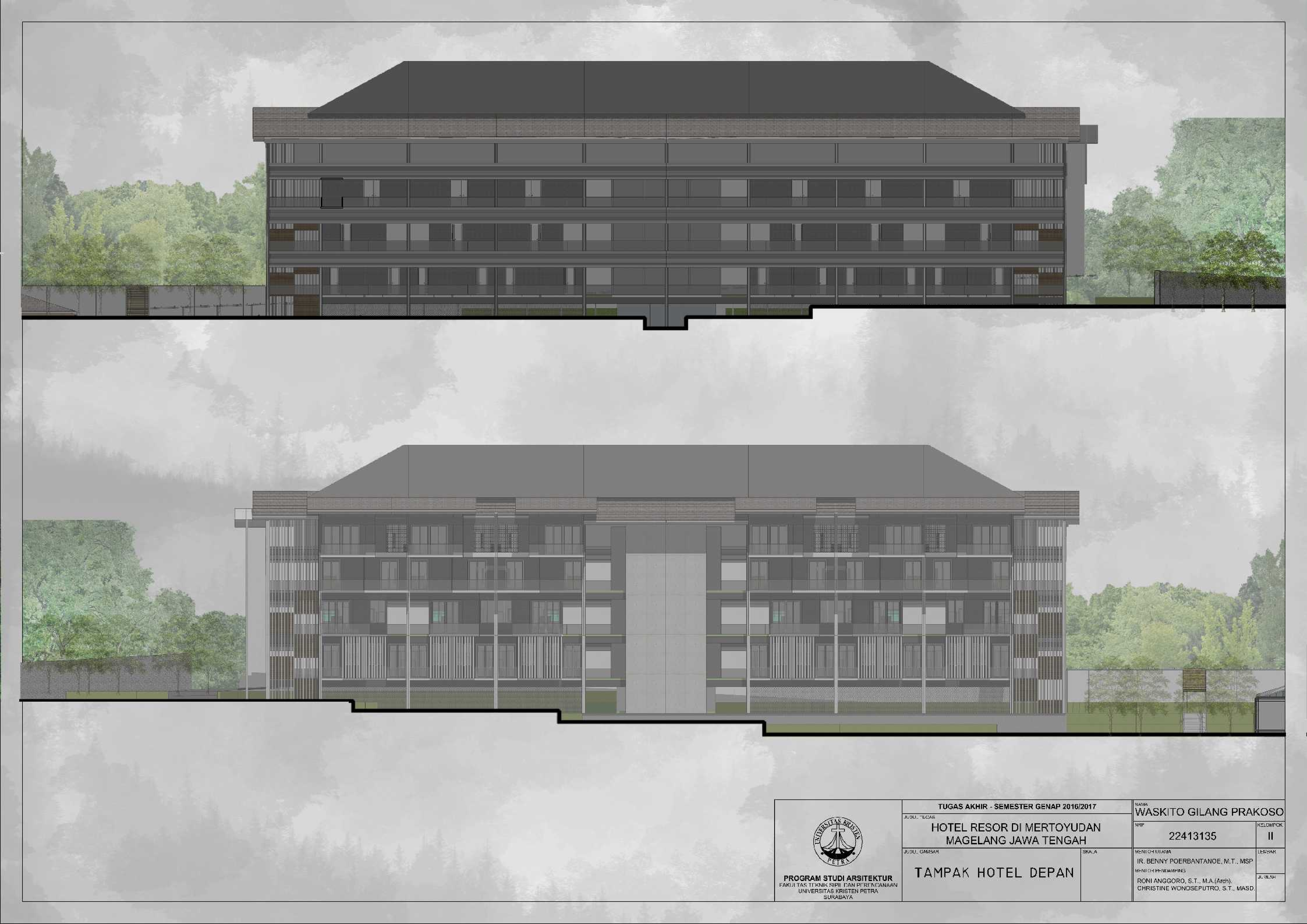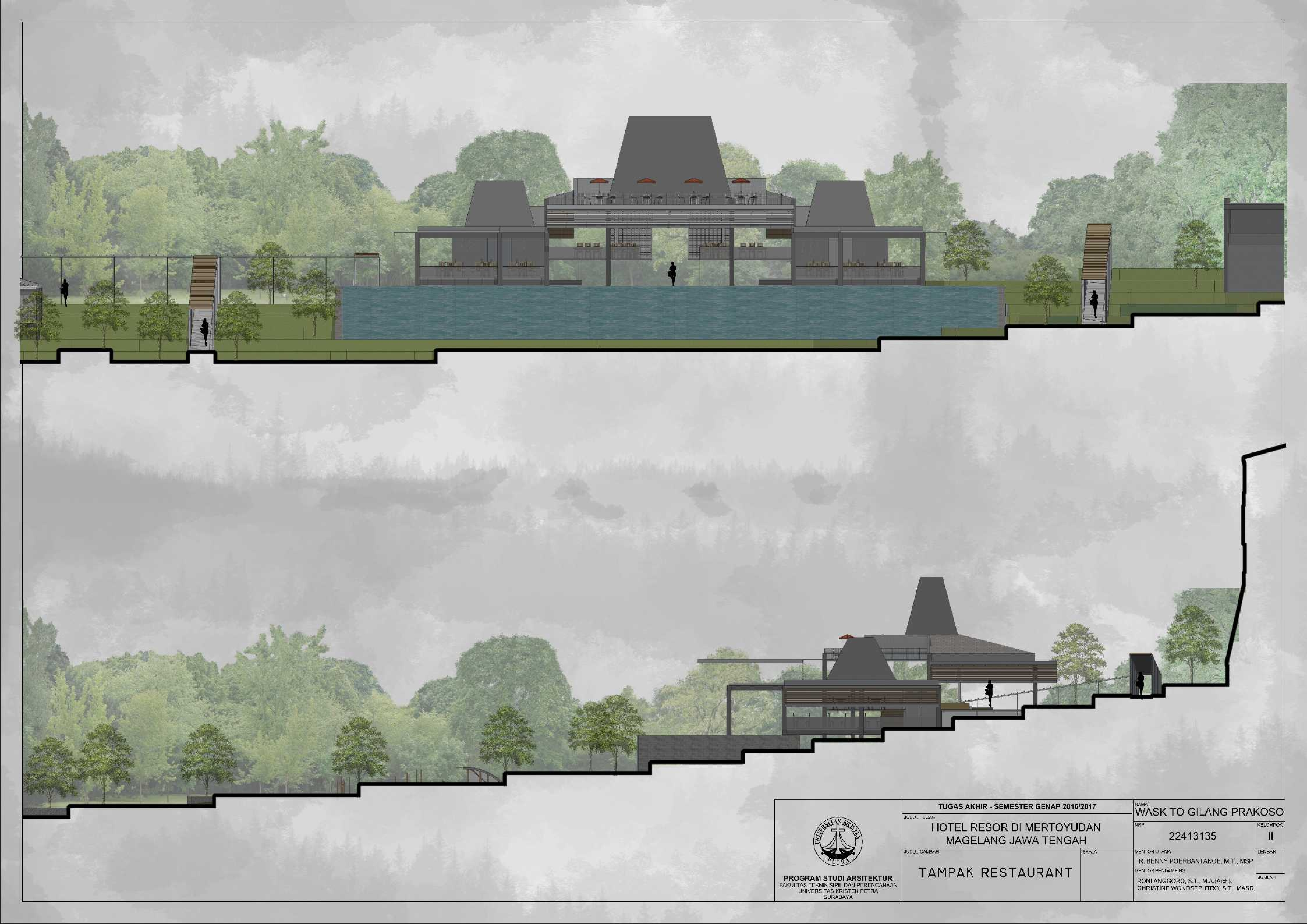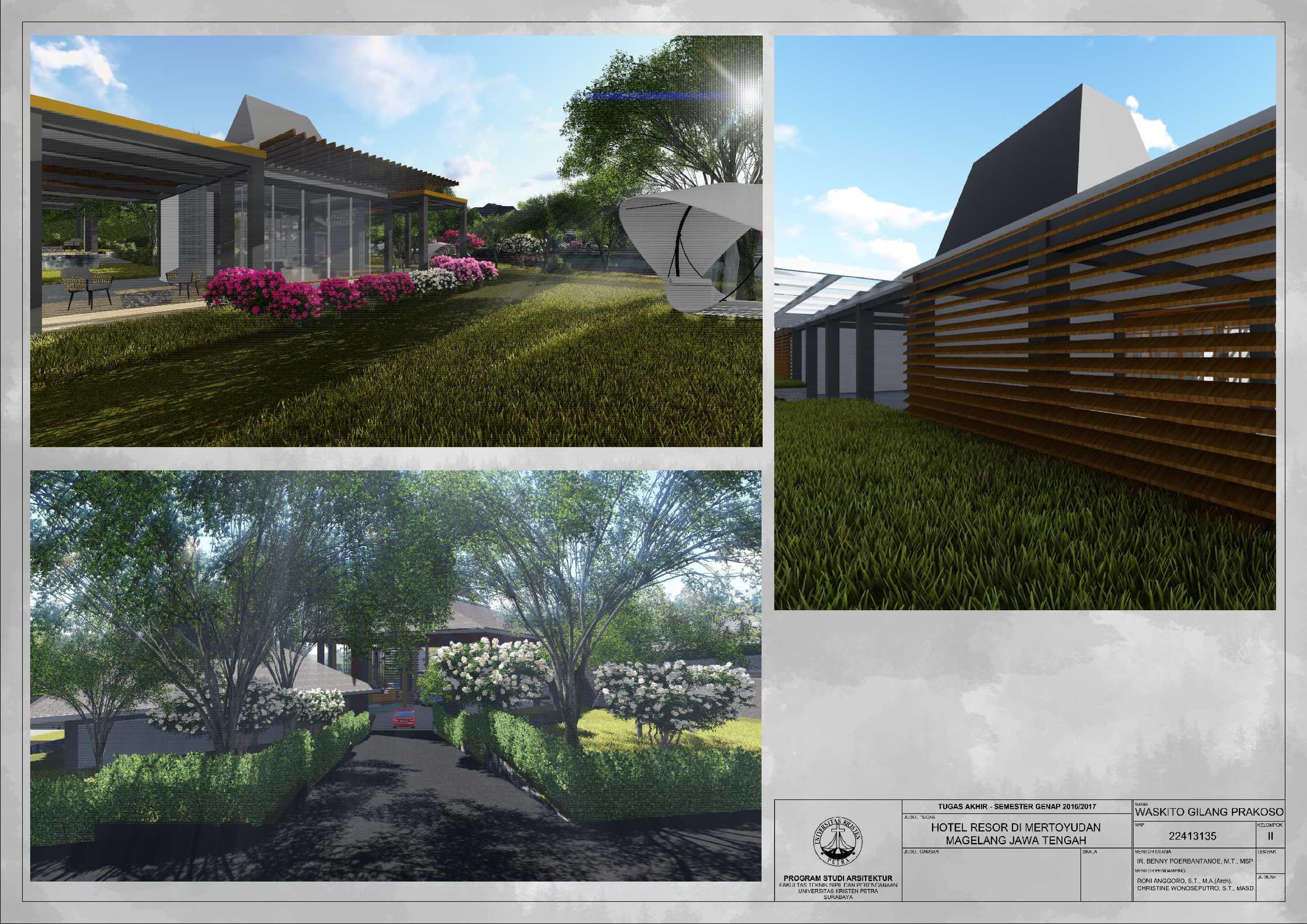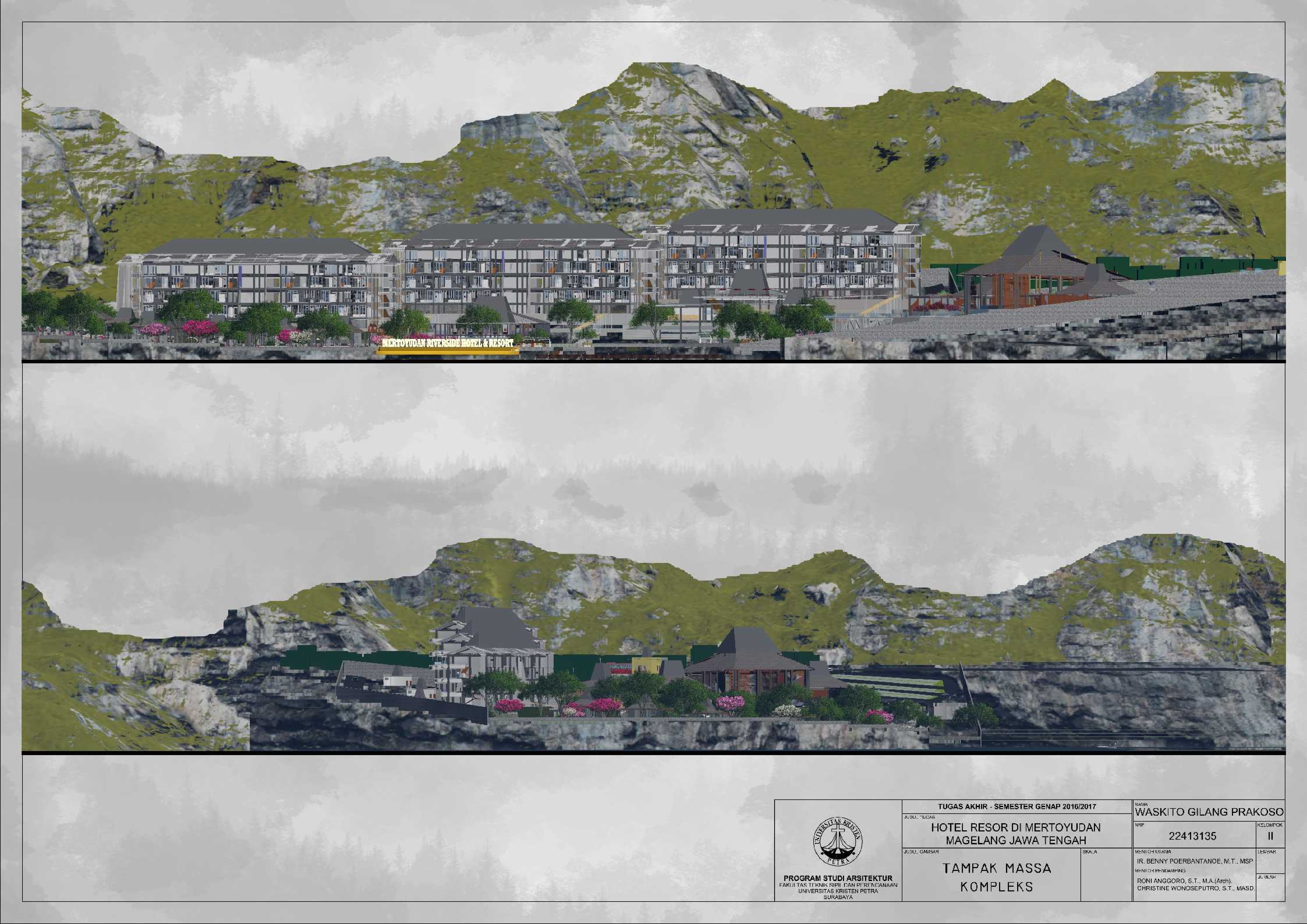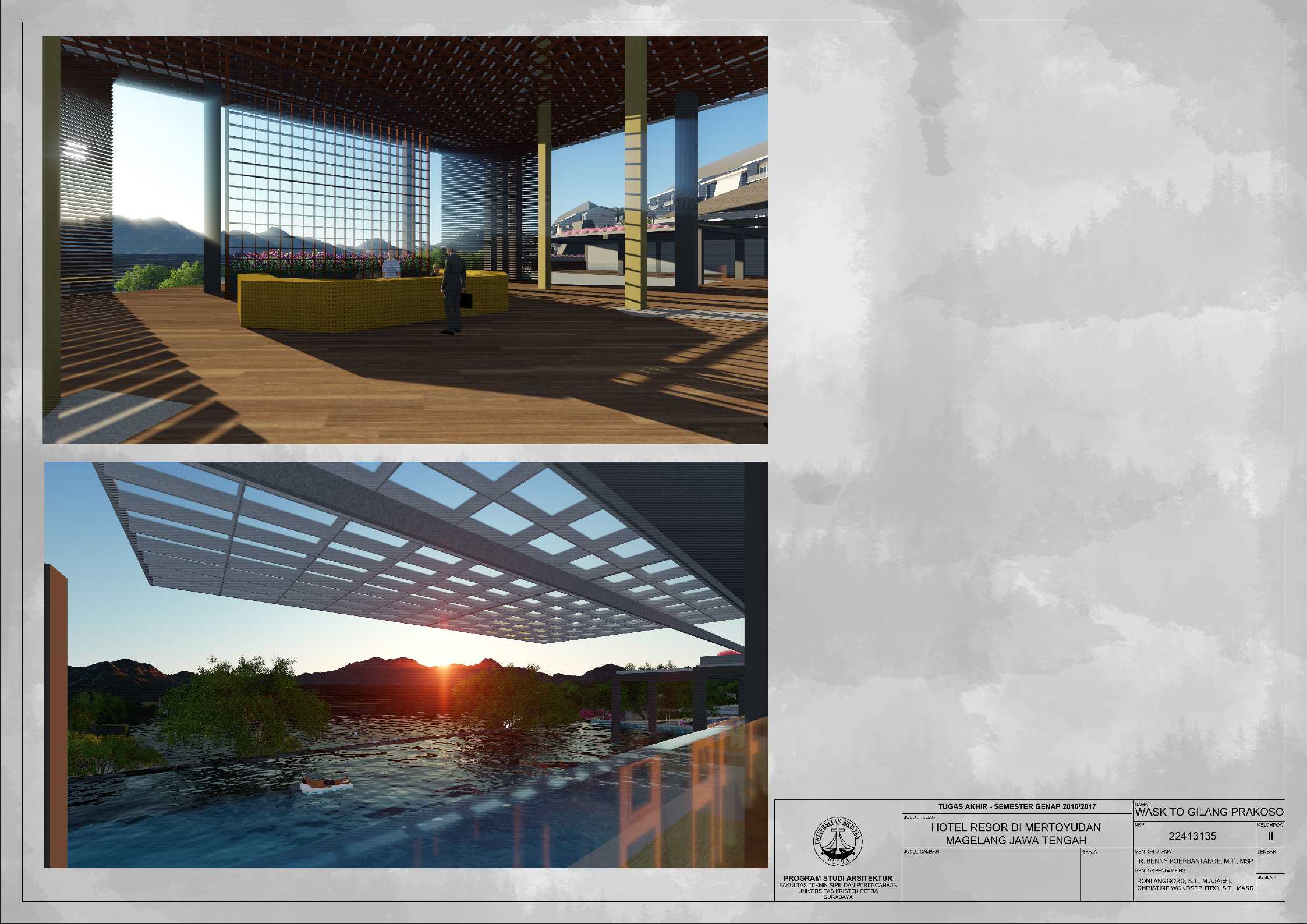 Hotel Resor di Mertoyudan Magelang Jawa Tengah merupakan fasilitas penginapan yang memperkenalkan budaya Jawa Tengah kepada masyarakat pendatang baik wisatawan nusantara maupun wisatawan mancanegara dan merupakan wadah bagi wisatawan kota Magelang untuk berinteraksi dan beristirahat serta bertukar pikiran satu sama lain. Kota Magelang sangat terkenal dengan adanya banyak Peninggalan Sejarah, hal ini menjadi salah satu daya Tarik bagi wisatawan untuk berkunjung dan menjadikan Kota Magelang sebagai salah satu kota dengan Banyak Peninggalan sejarah di Indonesia. Hotel Resor di Mertoyudan Magelang, Jawa Tengah akan menjadi tempat peristirahatan yang tetap mengusung konsep Borobudur sebagai salah satu Peninggalan sejarah di kota Magelang. Hotel Resor ini akan dilengkapi fasilitas publik, yaitu restaurant, amphitheatre, dan café. Pendekatan Vernakular digunakan untuk mengapresiasikan ciri khas dari daerah Magelang untuk memperkenalkan budaya kepada para wisatawan. Suasana interior bangunan juga mengekspresikan karakter tiap bentukan rumah adat melalui pendalaman karakter ruang sehingga pengunjung dapat mengenal dan merasakan ciri khas budayanya.