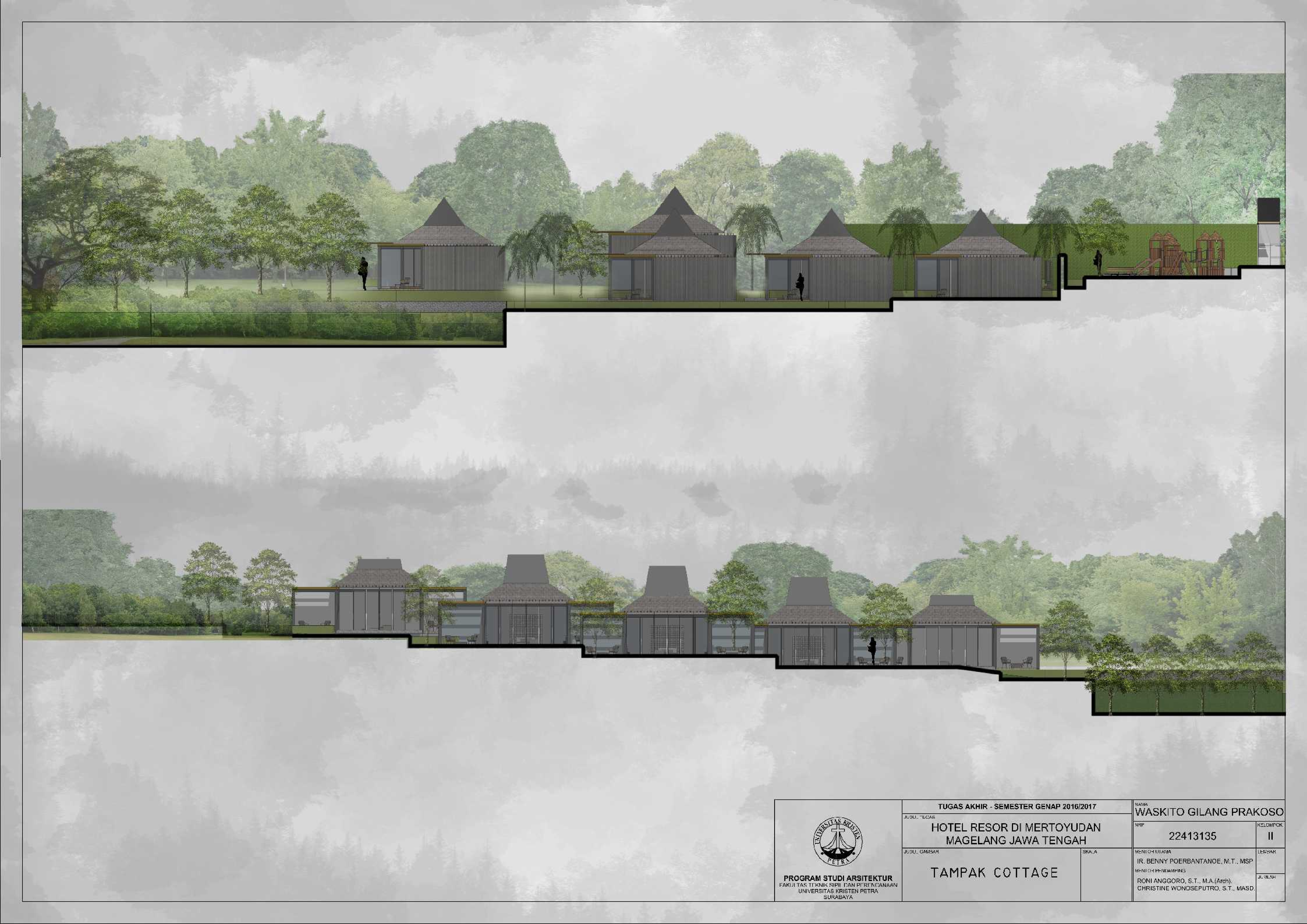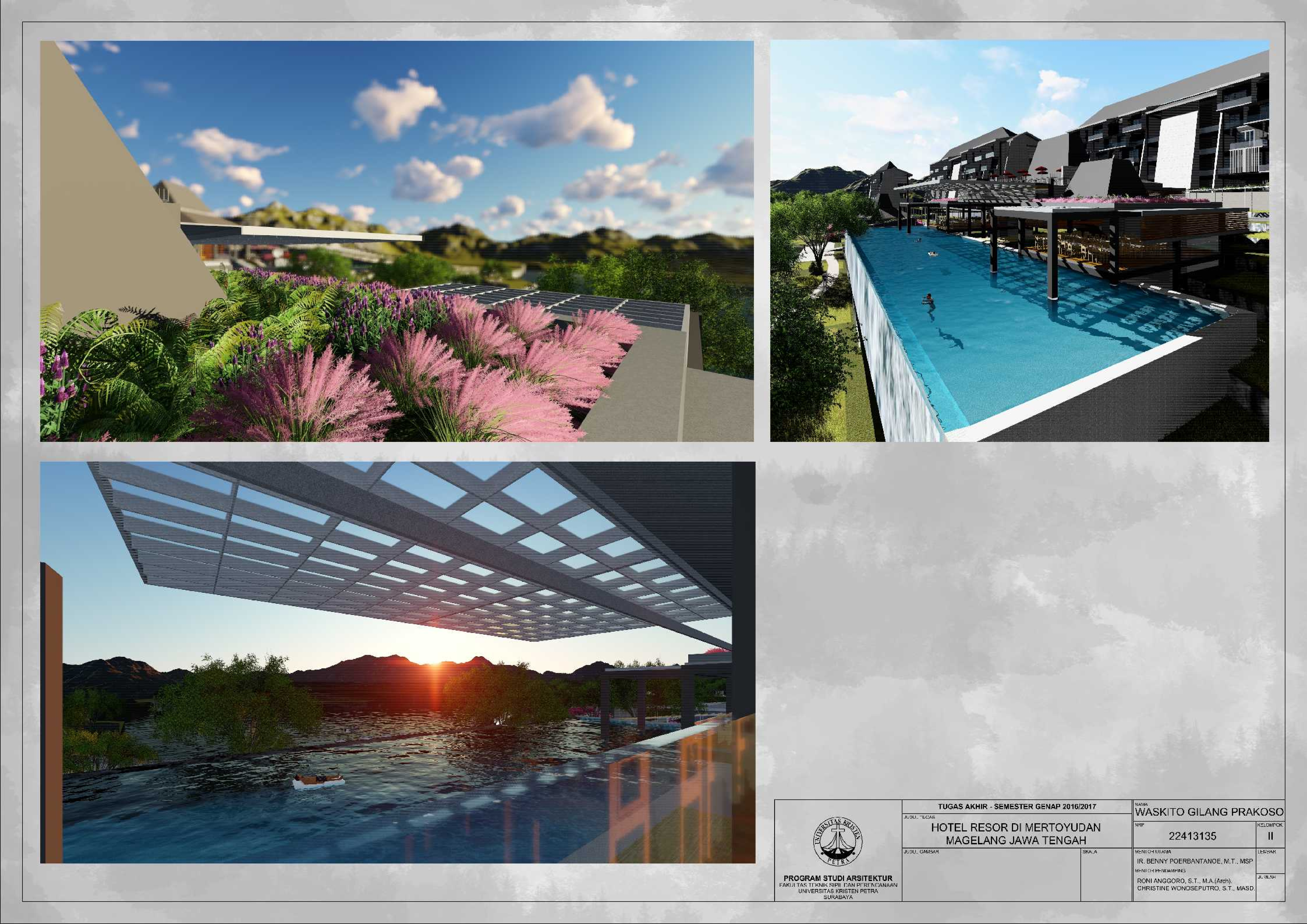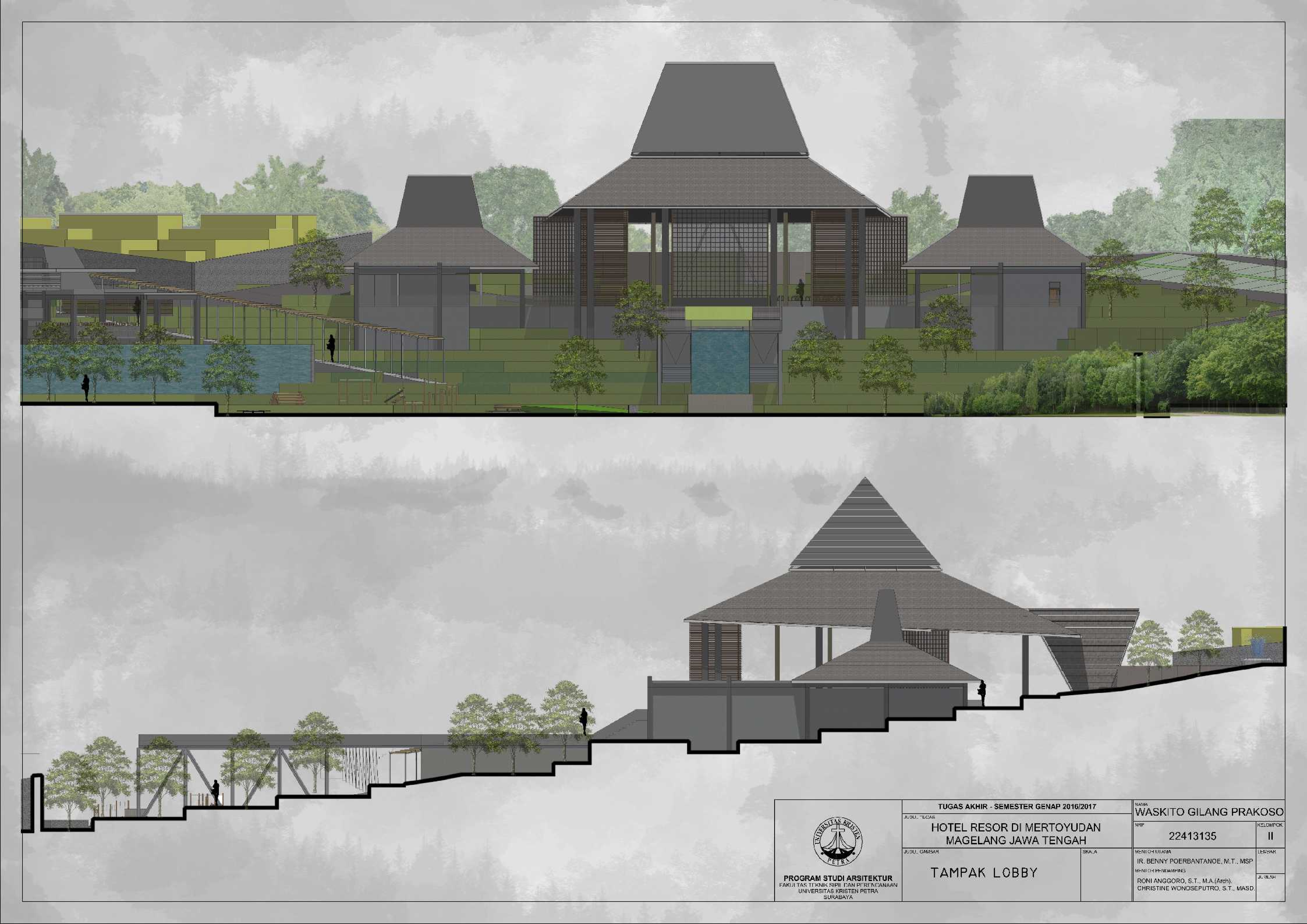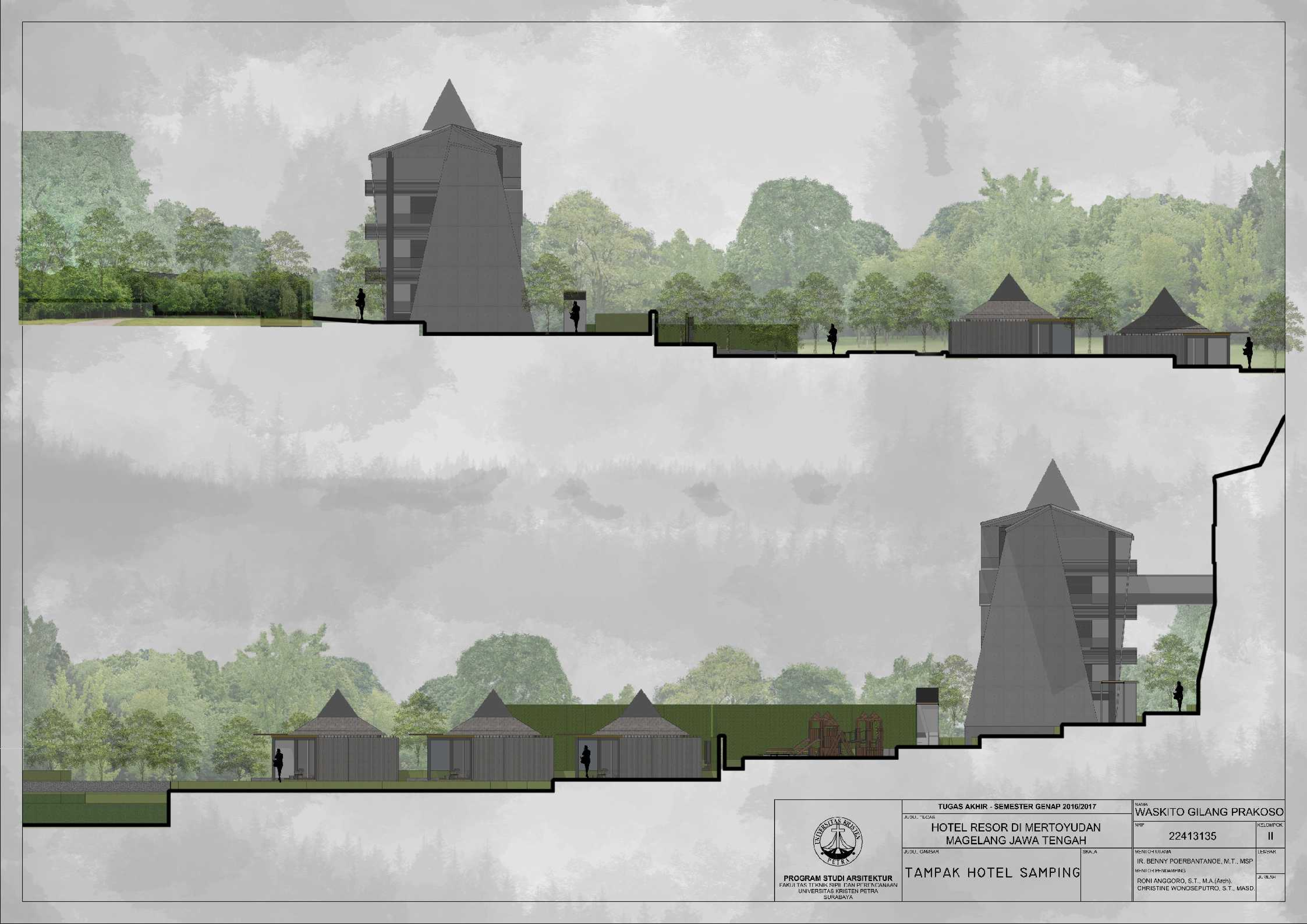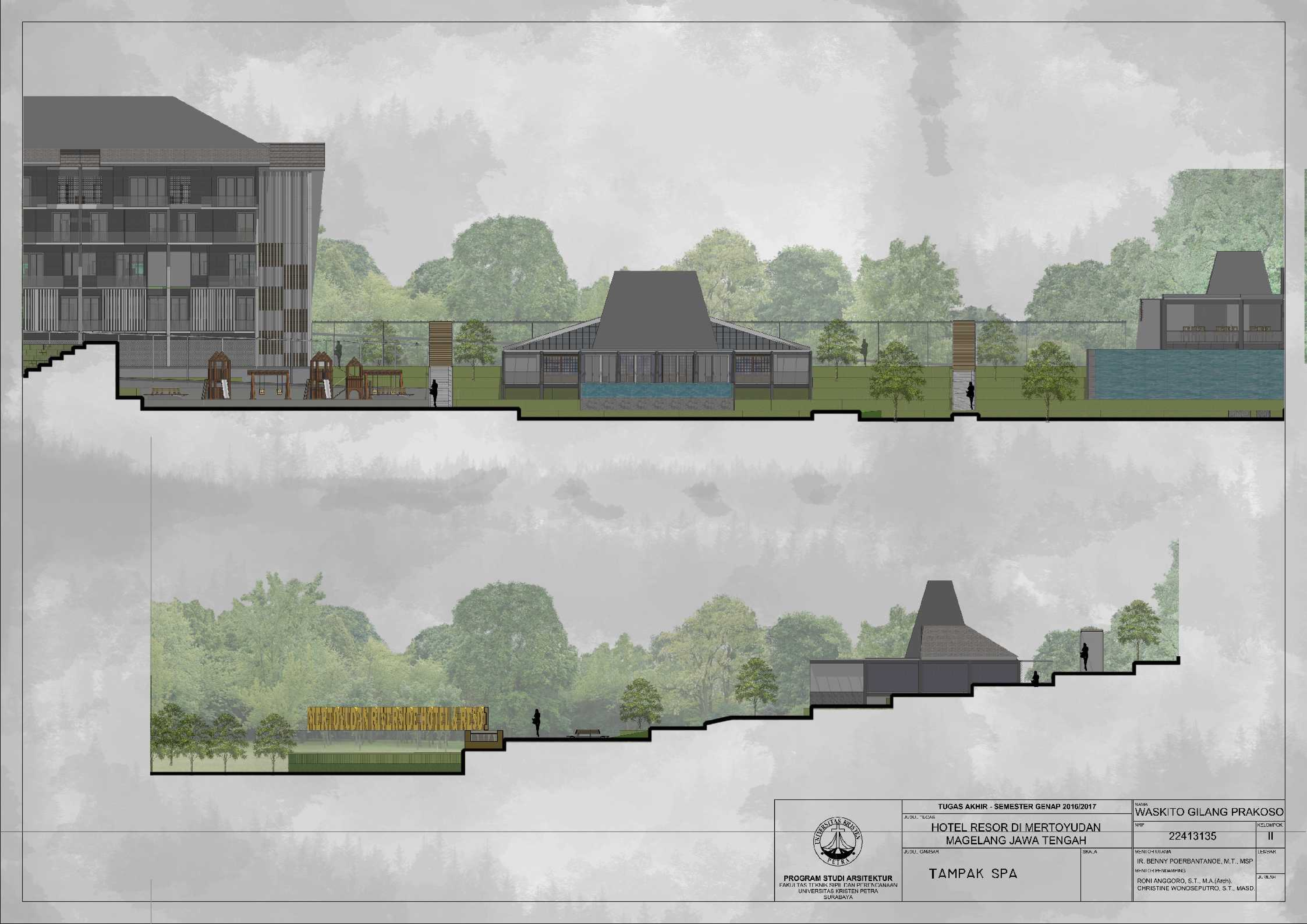 Hotel Resor di Mertoyudan Magelang Jawa Tengah merupakan fasilitas penginapan yang memperkenalkan budaya Jawa Tengah kepada masyarakat pendatang baik wisatawan nusantara maupun wisatawan mancanegara dan merupakan wadah bagi wisatawan kota Magelang untuk berinteraksi dan beristirahat serta bertukar pikiran satu sama lain. Kota Magelang sangat terkenal dengan adanya banyak Peninggalan Sejarah, hal ini menjadi salah satu daya Tarik bagi wisatawan untuk berkunjung dan menjadikan Kota Magelang sebagai salah satu kota dengan Banyak Peninggalan sejarah di Indonesia. Hotel Resor di Mertoyudan Magelang, Jawa Tengah akan menjadi tempat peristirahatan yang tetap mengusung konsep Borobudur sebagai salah satu Peninggalan sejarah di kota Magelang. Hotel Resor ini akan dilengkapi fasilitas publik, yaitu restaurant, amphitheatre, dan café. Pendekatan Vernakular digunakan untuk mengapresiasikan ciri khas dari daerah Magelang untuk memperkenalkan budaya kepada para wisatawan. Suasana interior bangunan juga mengekspresikan karakter tiap bentukan rumah adat melalui pendalaman karakter ruang sehingga pengunjung dapat mengenal dan merasakan ciri khas budayanya.
