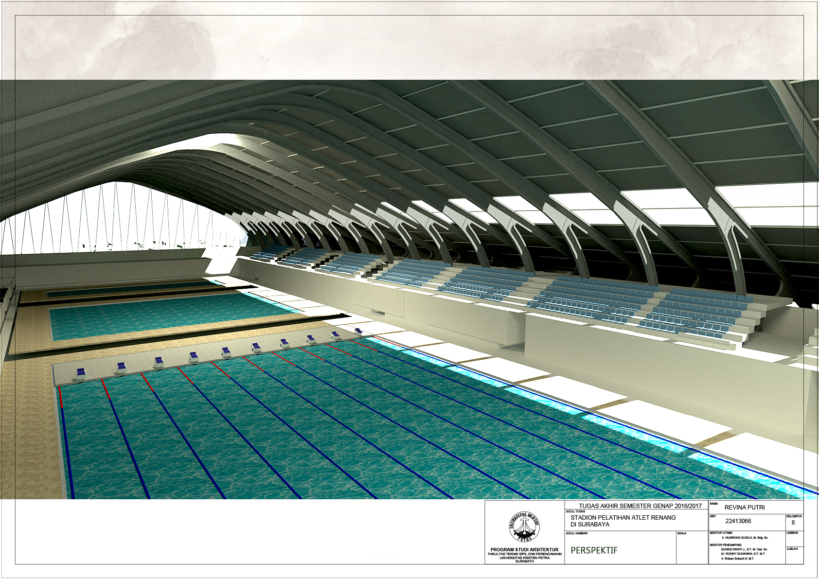 Fasilitas Pelatihan Atlet Renang di Surabaya merupakan wadah yang disediakan dengan tujuan mempopulerkan olahraga renang di Kota Surabaya. Dengan adanya fasilitas ini diharapkan olahraga renang dapat berkembang dengan pesat sehingga mampu menghasilkan calon atlet renang yang berpotensi di Surabaya. Fasilitas ini dilengkapi dengan fasilitas dengan kolam berstandar internasional berdasarkan ketentuan dari Federation international de natation (FINA) sehingga mampu mewadahi kegiatan kompetisi renang tingkat internasional. Fasilitas ini juga dilengkapi dengan fasilitas publik dan komersial yaitu outdoor commercial area, café, restaurant, toko souvenir, galeri, loket tiket. Pendekatan struktur menggunakan dua sistem struktur yang berbeda diterapkan pada bangunan untuk memecahkan masalah pembagian penyaluran beban air kolam dan beban tribun penonton.