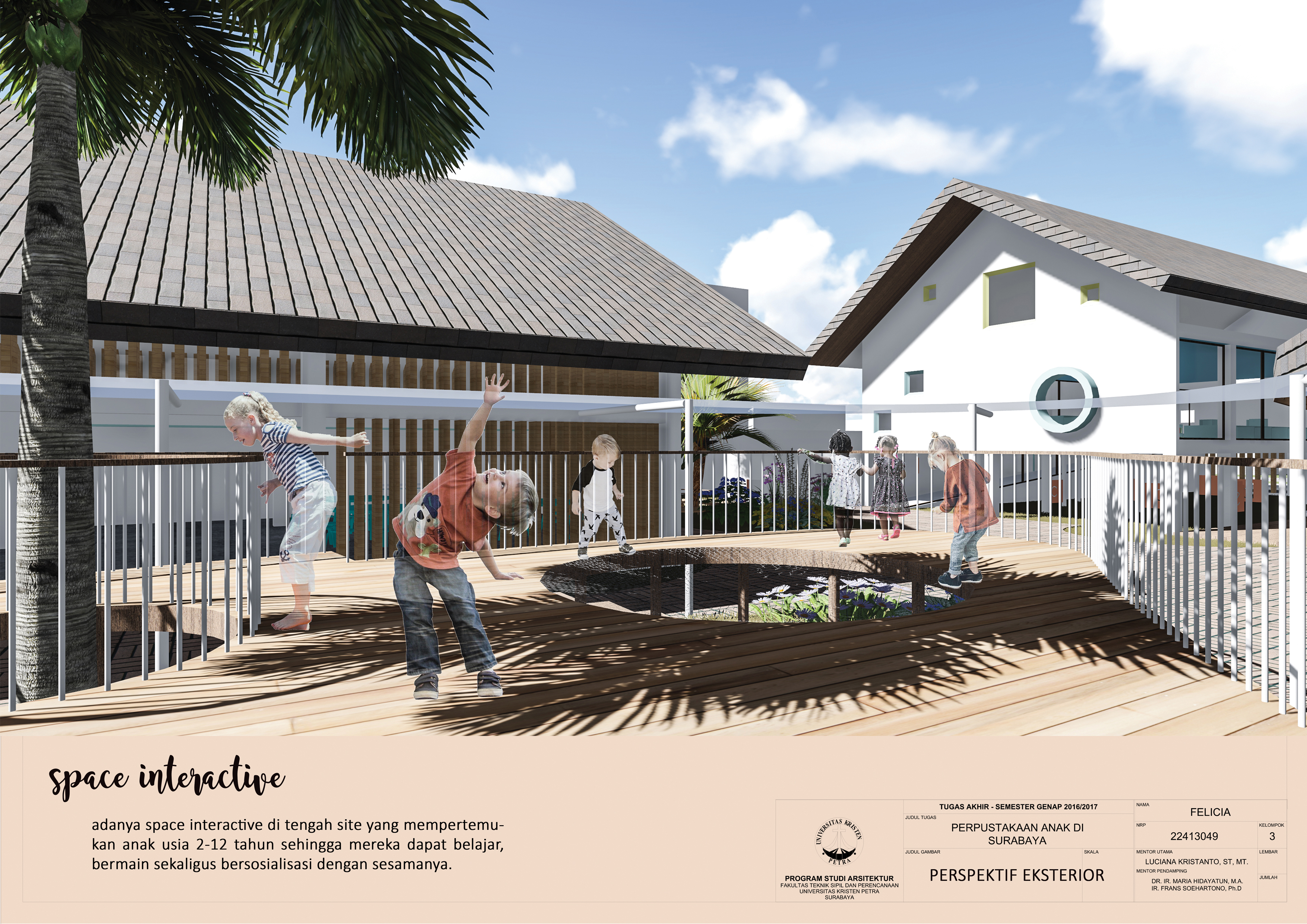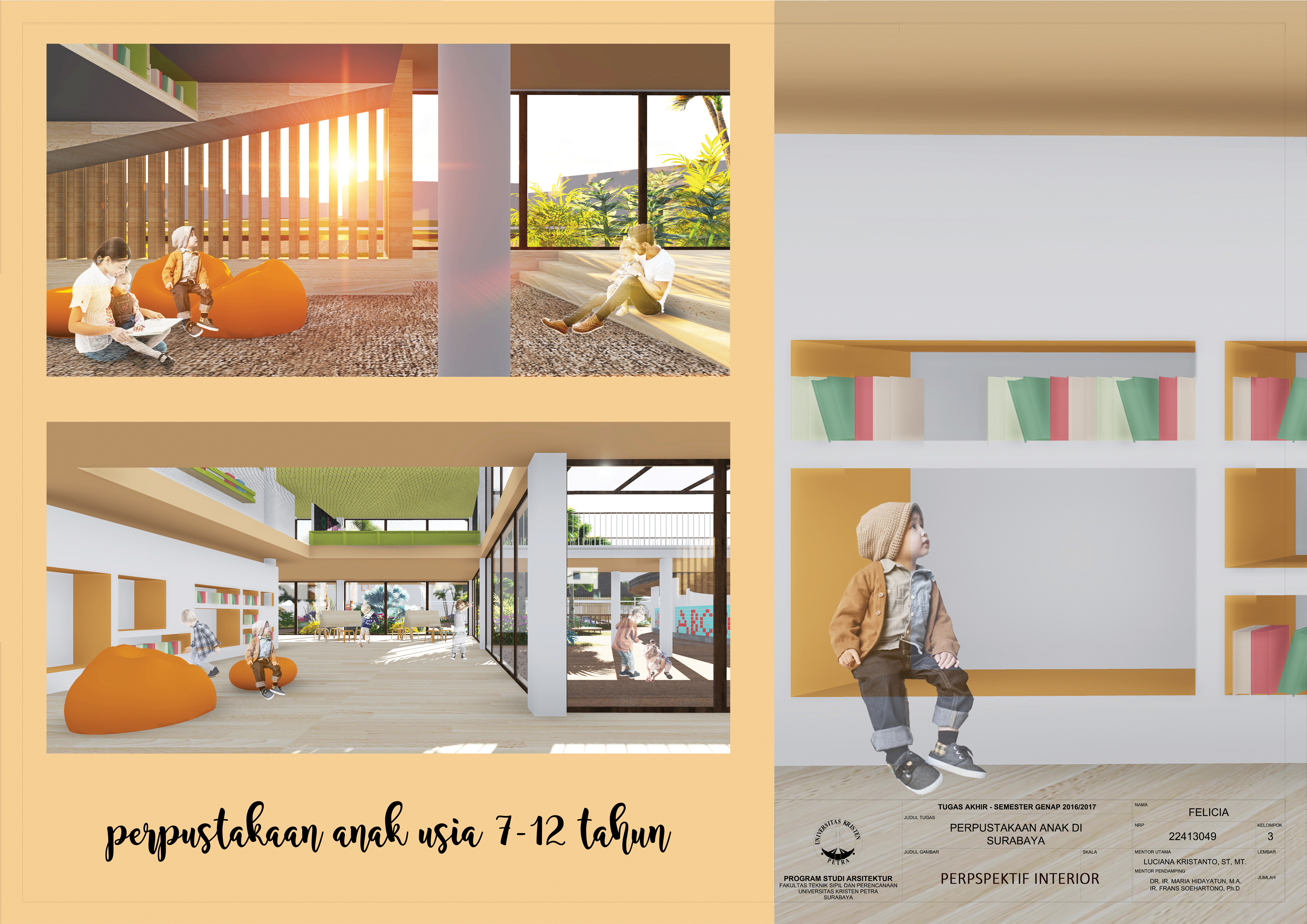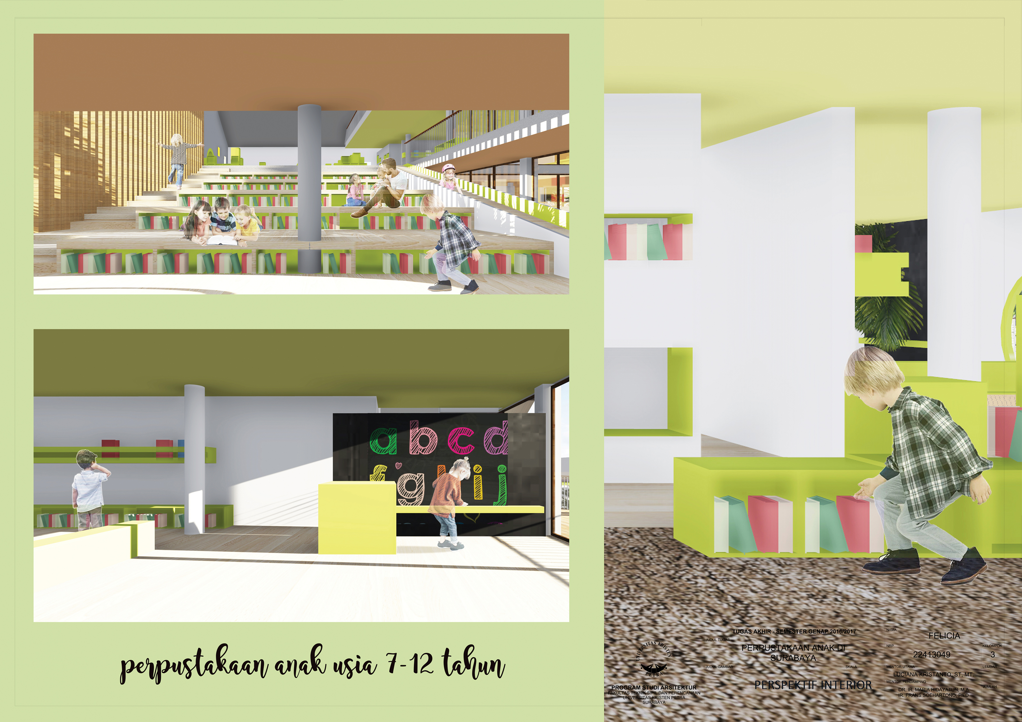 Perpustakaan Anak di Surabaya merupakan sebuah fasilitas yang bersifat edukatif namun rekreatif sehingga anak dapat belajar, berekreasi, sekaligus bersosialisasi dengan sesamanya. Fasilitas ini diharapkan dapat memberikan ketertarikan tersendiri bagi anak-anak untuk dapat belajar dan mengumpulkan informasi sambil bermain tanpa merasakan kebosanan. Perpustakaan Anak di Surabaya didesain dan diprioritaskan bagi komunitas anak-anak khususnya usia 2-12 tahun yang akan dilengkapi fasilitas publik, yaitu kantin dan gedung serbaguna.