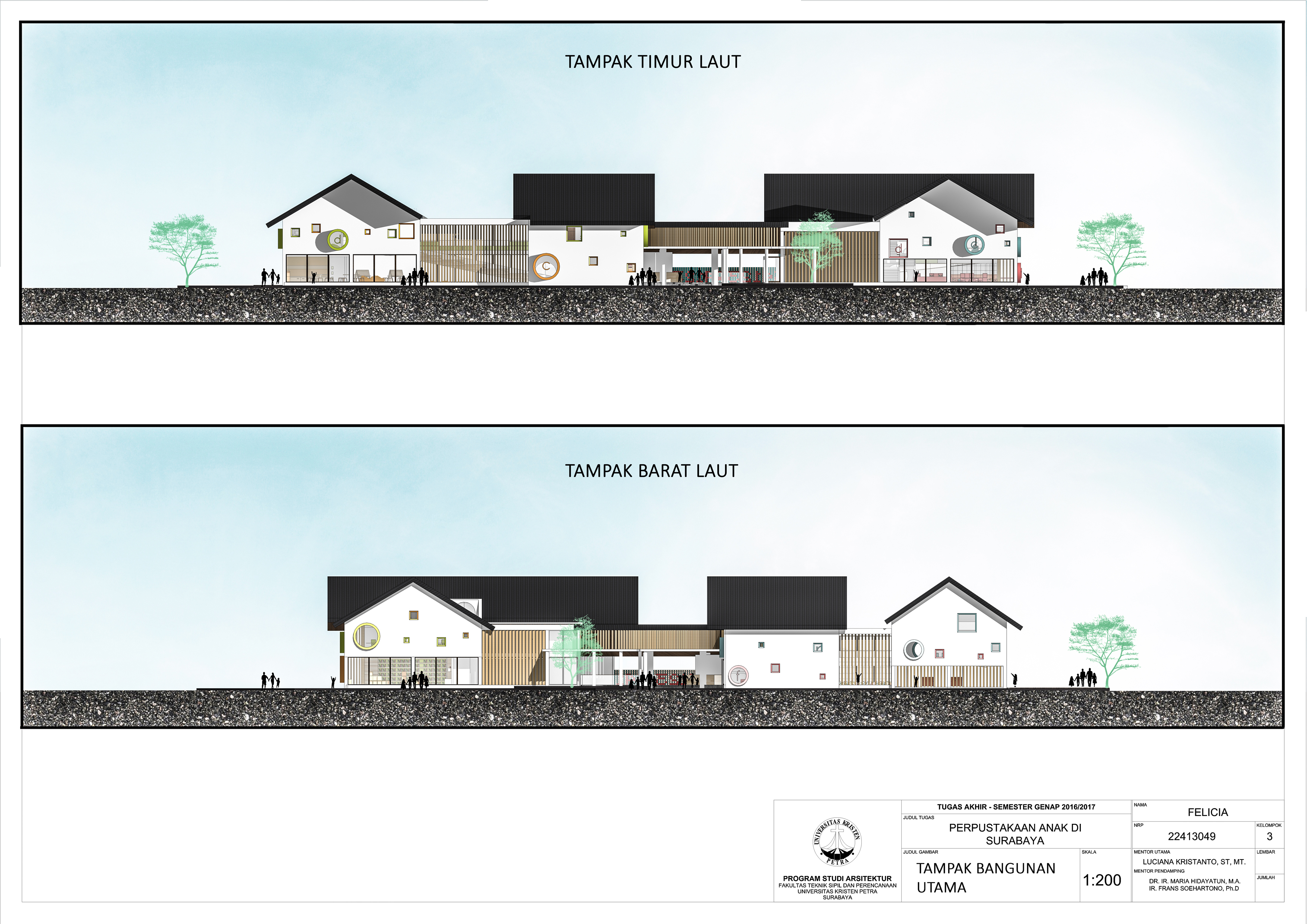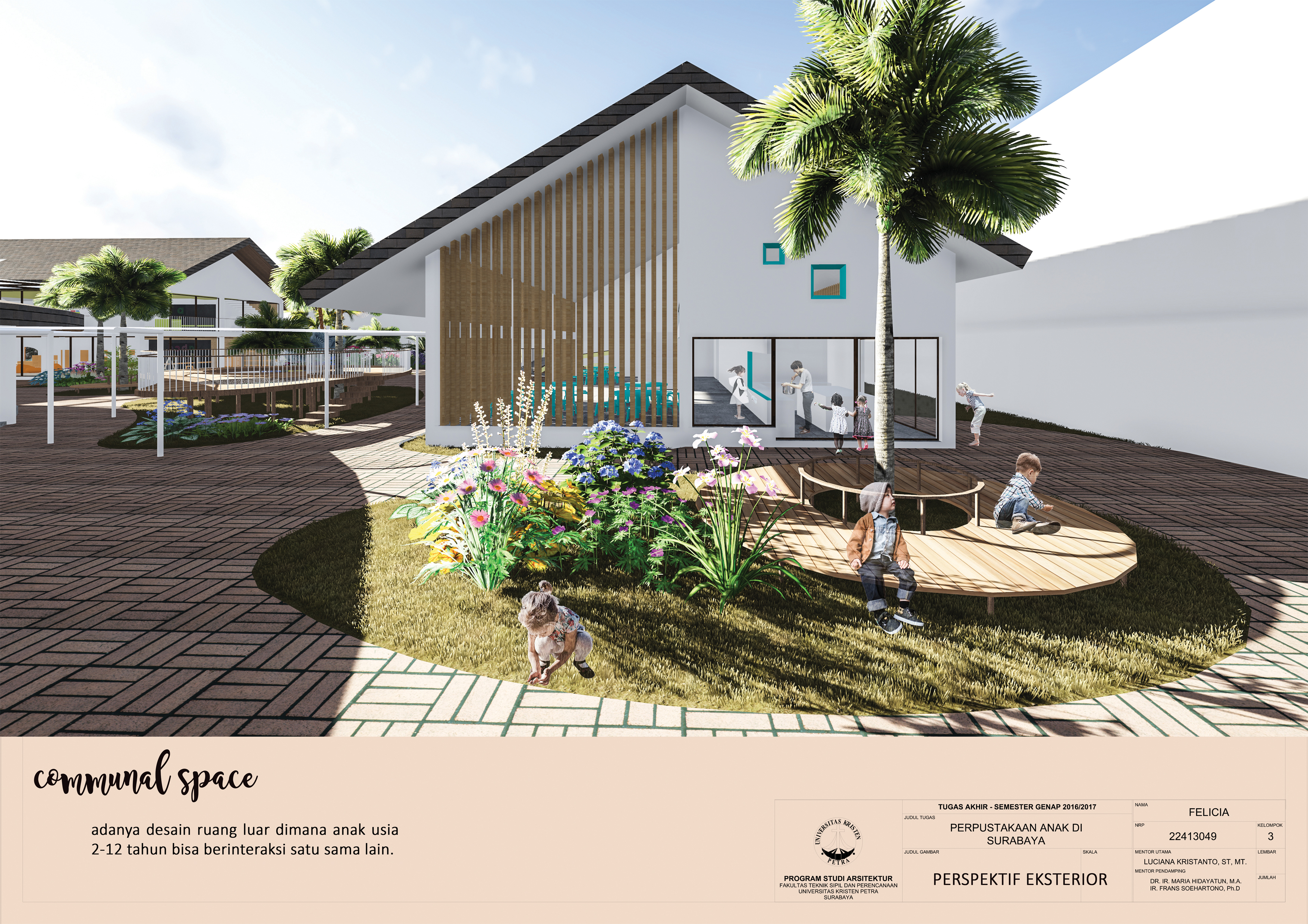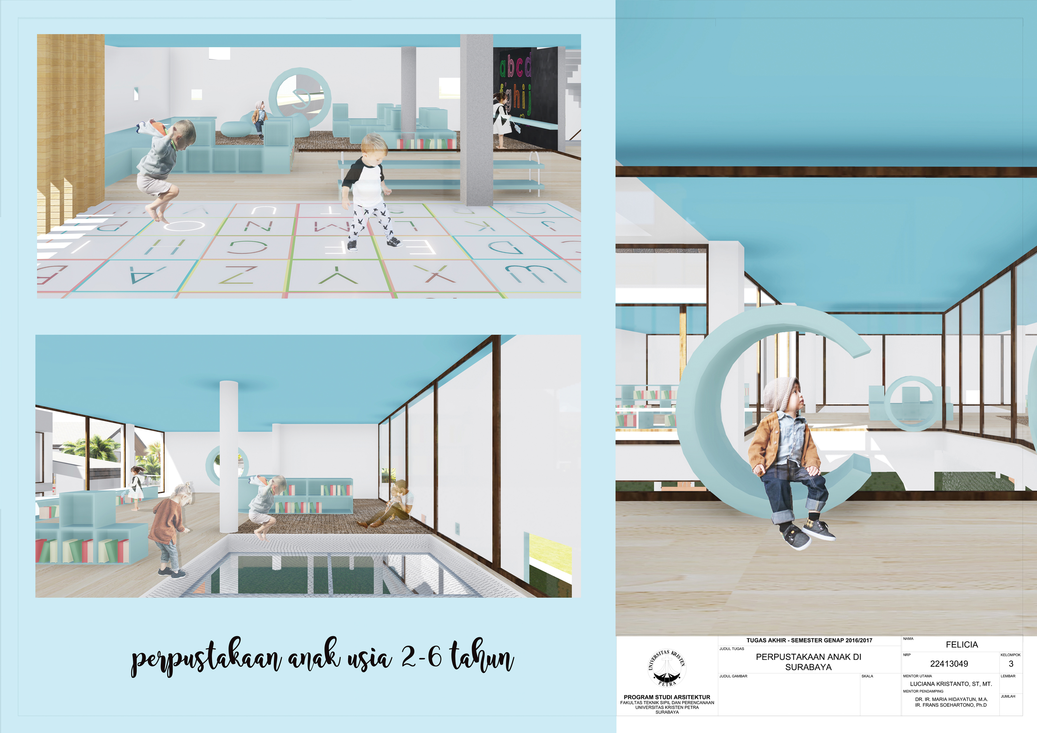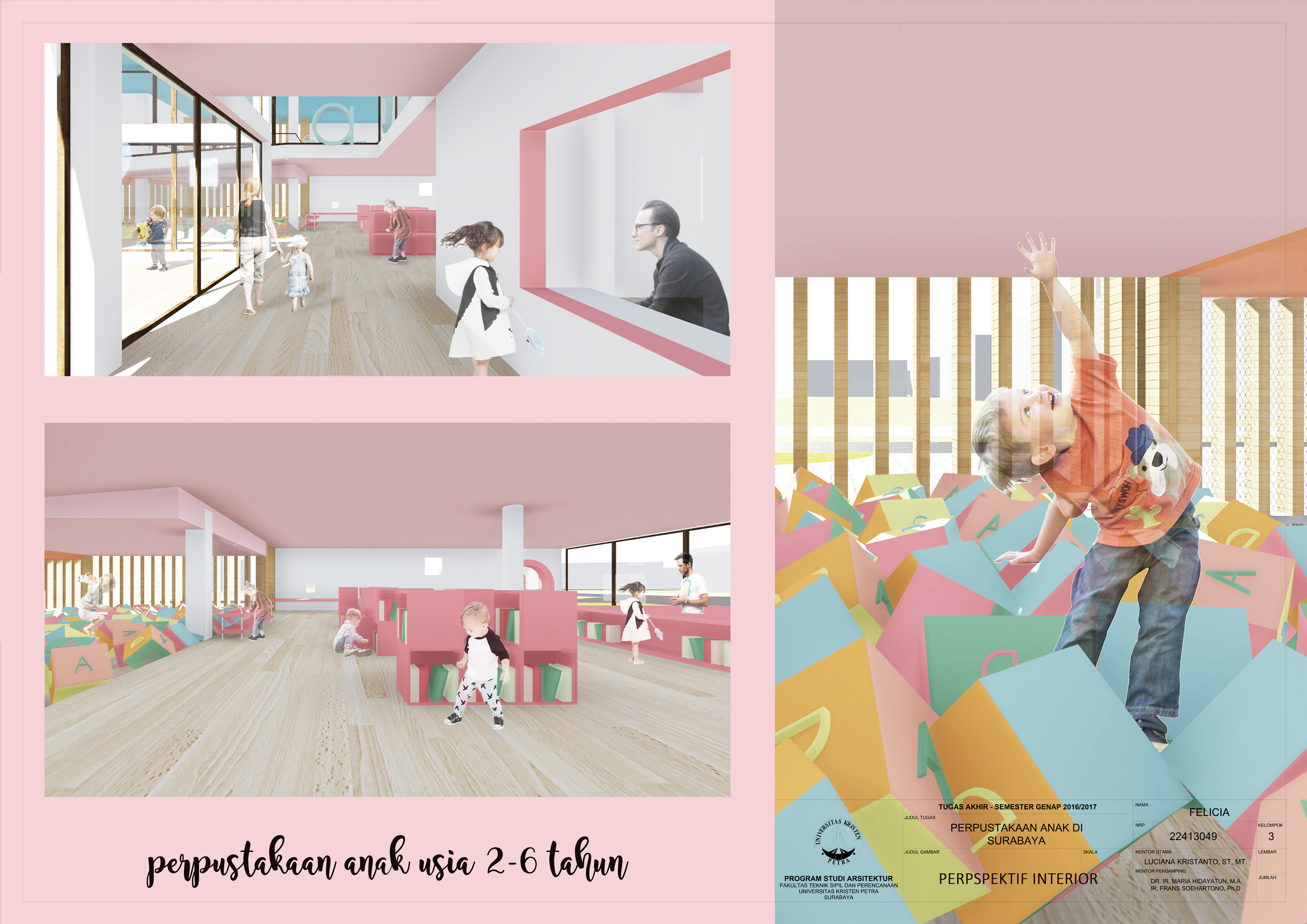 Perpustakaan Anak di Surabaya merupakan sebuah fasilitas yang bersifat edukatif namun rekreatif sehingga anak dapat belajar, berekreasi, sekaligus bersosialisasi dengan sesamanya. Fasilitas ini diharapkan dapat memberikan ketertarikan tersendiri bagi anak-anak untuk dapat belajar dan mengumpulkan informasi sambil bermain tanpa merasakan kebosanan. Perpustakaan Anak di Surabaya didesain dan diprioritaskan bagi komunitas anak-anak khususnya usia 2-12 tahun yang akan dilengkapi fasilitas publik, yaitu kantin dan gedung serbaguna.
