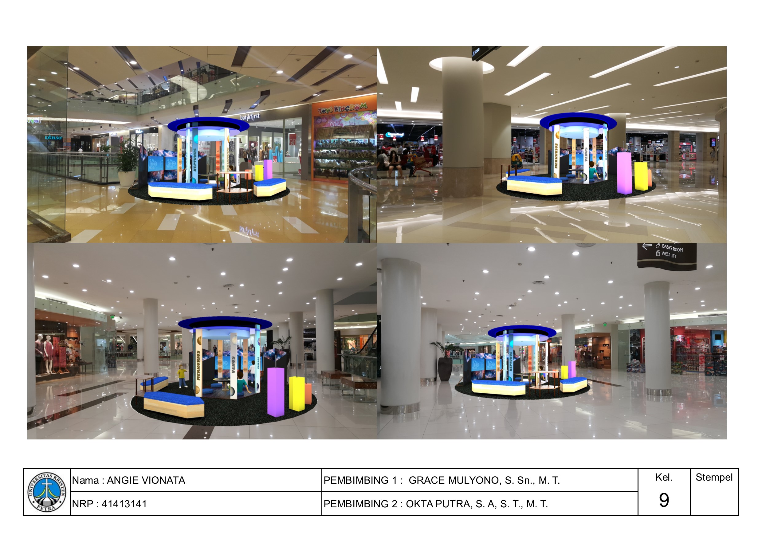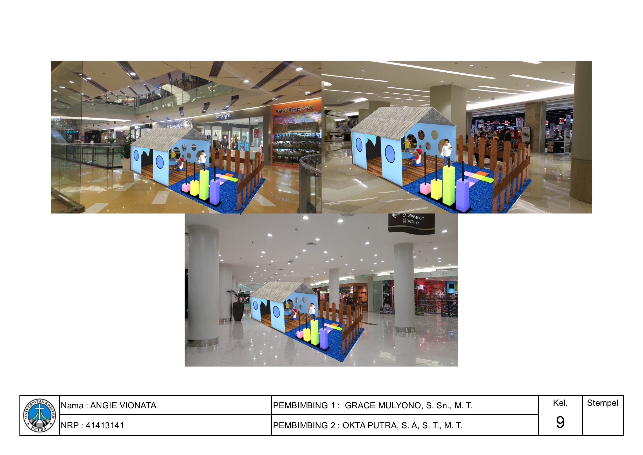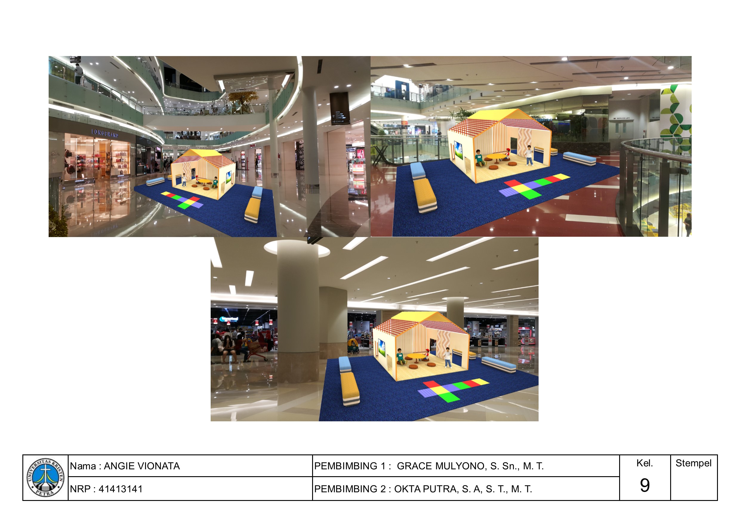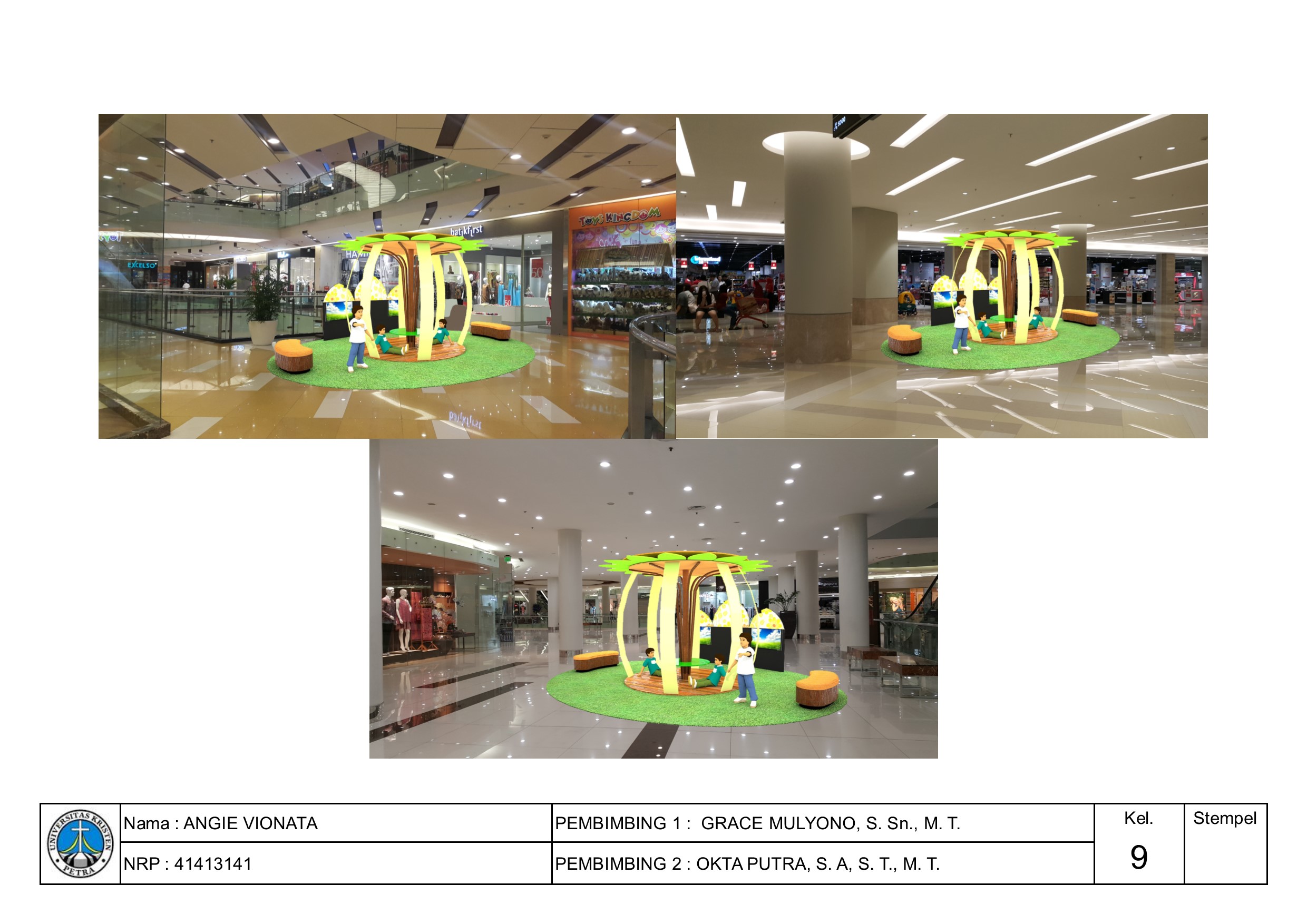 Salah satu kebutuhan yang masih belum terpenuhi di dalam mall, yaitu kebutuhan ruang untuk anak-anak dapat duduk dan beristirahat. Seringkali anak-anak akan merasa letih berjalan dan membutuhkan tempat duduk, tetapi hanya bisa duduk di area pinggir toko mall saat menunggu orangtuanya berbelanja. Namun, dengan adanya ruang tunggu khusus untuk anak-anak dapat mengatasi permasalahan ruang tersebut. Area tunggu untuk anak-anak ini dibuat dengan pertimbangan kebutuhan aktivitas dan ruang untuk anak, yang dirancang agar menarik dan nyaman untuk anak-anak. Metode perancangan yang digunakan melalui beberapa langkah, yaitu merumuskan masalah, kajian literatur dan tipologi, observasi, programming, pengembangan desain, dan desain akhir (dibuat prototype 1:1). Set area tunggu menggunakan tema-tema tertentu yang menarik untuk anak-anak dengan memberikan edukasi berdasarkan tema yang diusung masing-masing set area tunggu. Bentukan yang tercipta diambil dari karakteristik tiap tema, sehingga memberikan kesan tema yang kuat pada tiap set-nya. Kombinasi warna yang digunakan dominan warna-warna pastel, yang merupakan pilihan warna hasil survey yang paling diminati masyarakat Surabaya.