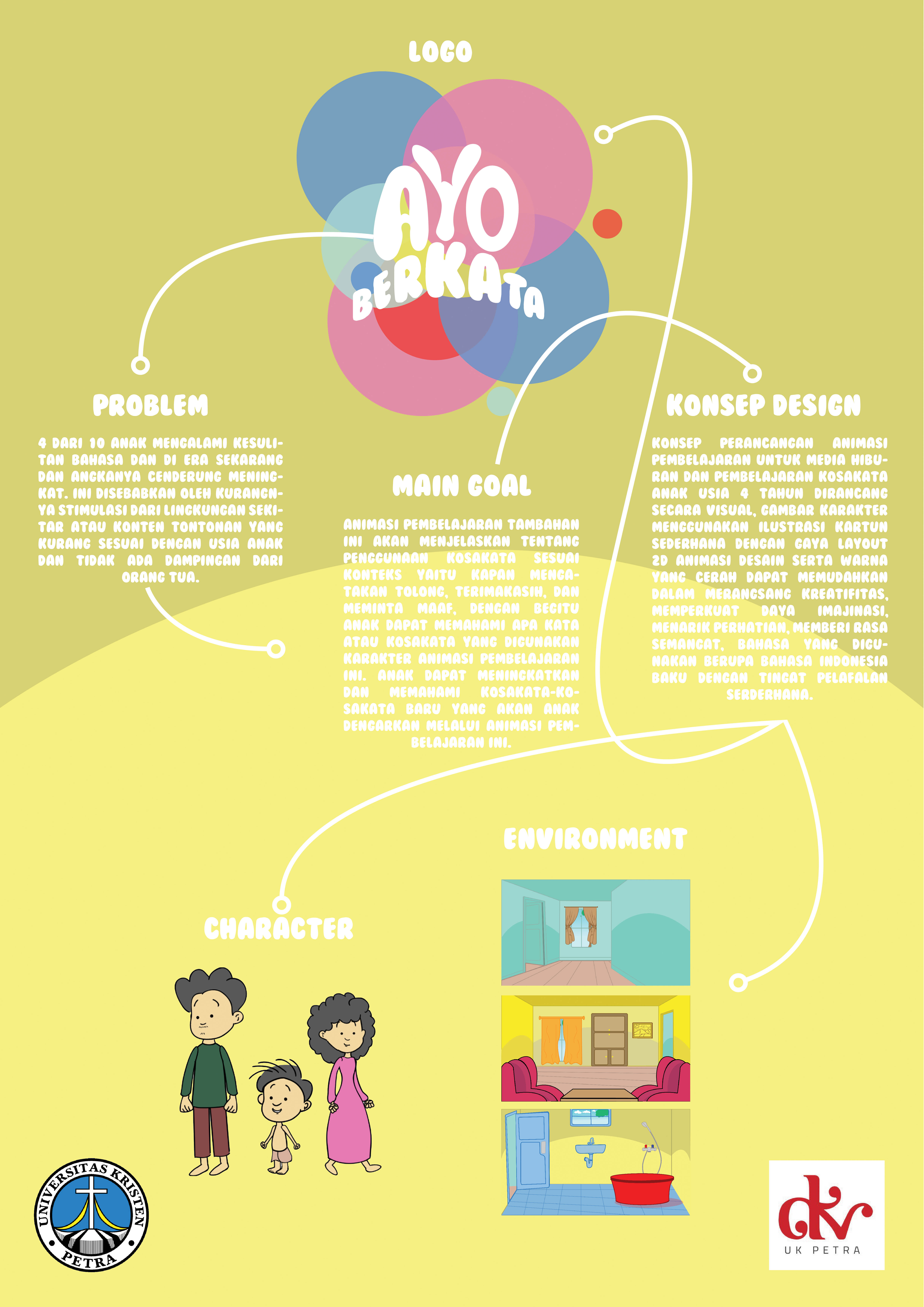 Salah satu dari sekian banyak metode yang digunakan untuk menambah perbendaharaan kosakata anak yaitu video animasi pembelajaran. Penulis akan menghasilkan karya perancangan video animasi pembelajaran untuk menambah kosakata anak usia empat tahun yang disesuaikan dengan fakta pertumbuhan anak saat ini melalui wawancara yang dilakukan kepada para ahli anak. Video animasi pembelajaran ini akan dirancang secara visual dengan gambar karakter menggunakan ilustrasi kartun sederhana dan gaya layout dua dimensi animasi desain.