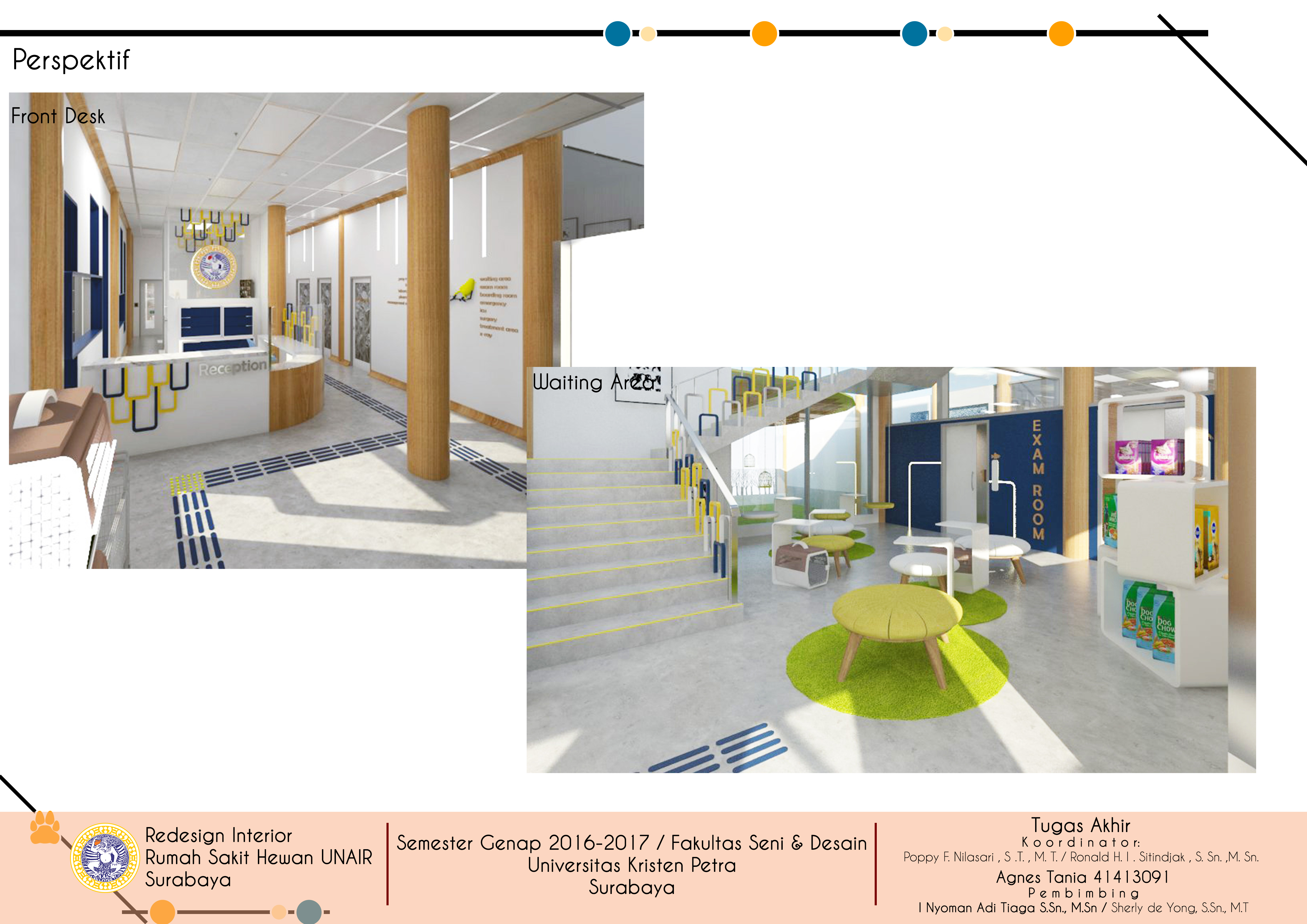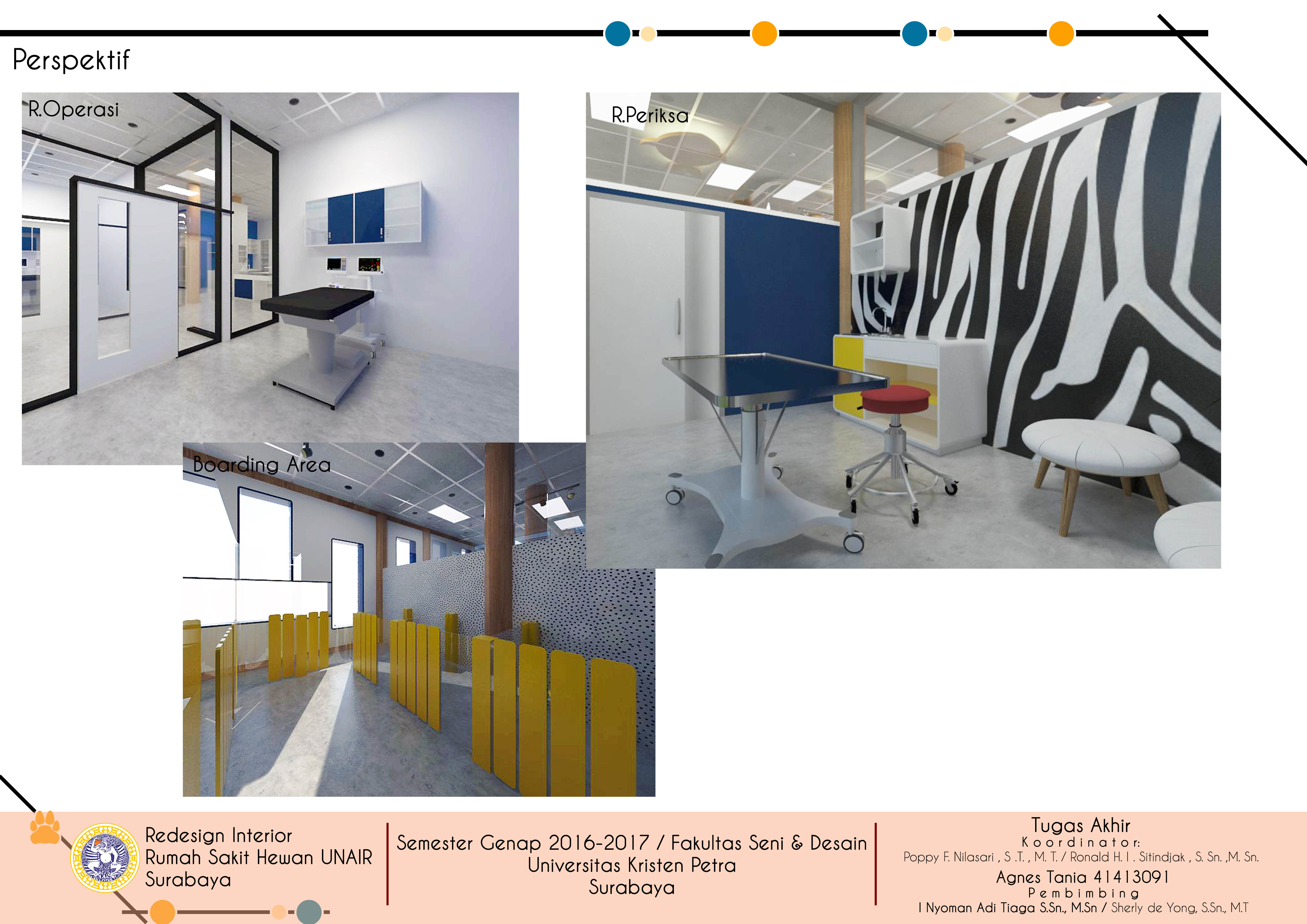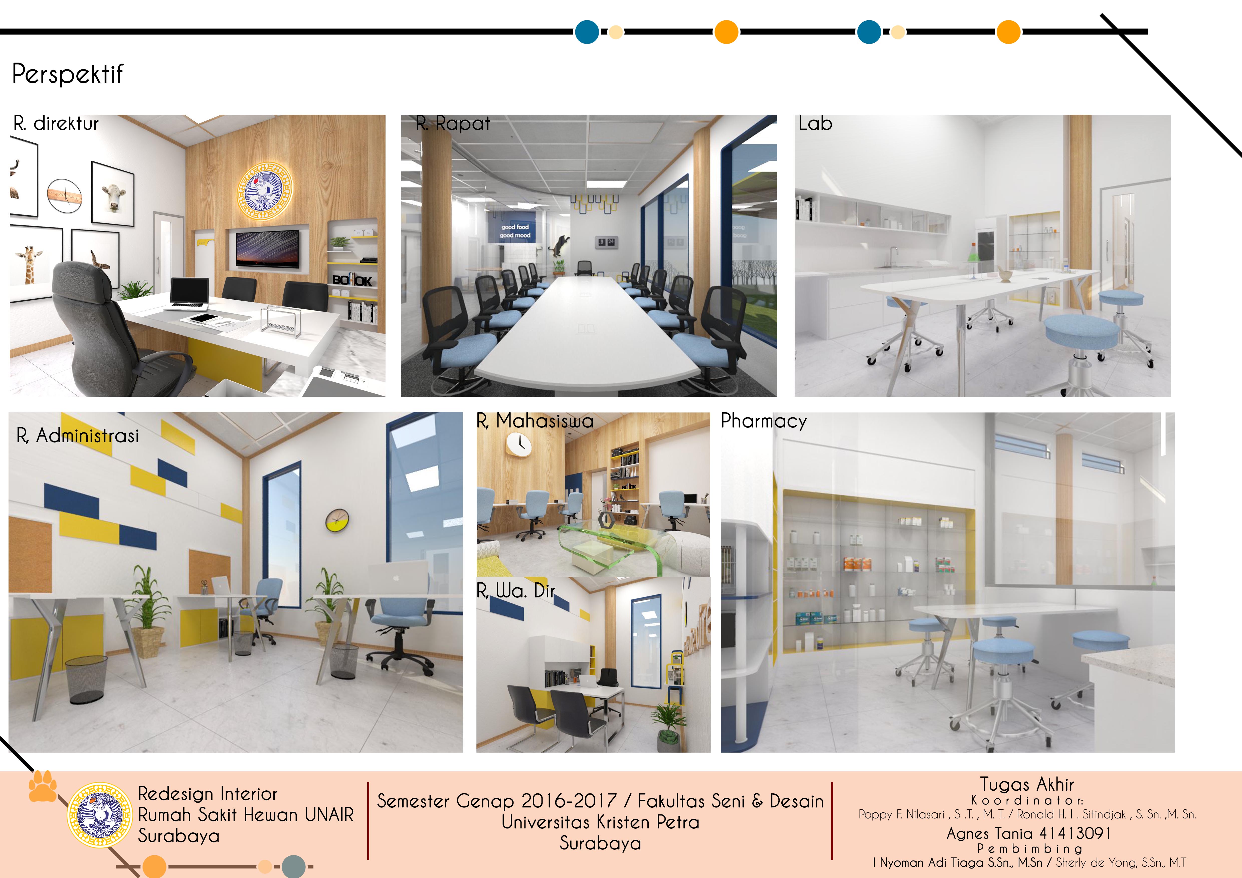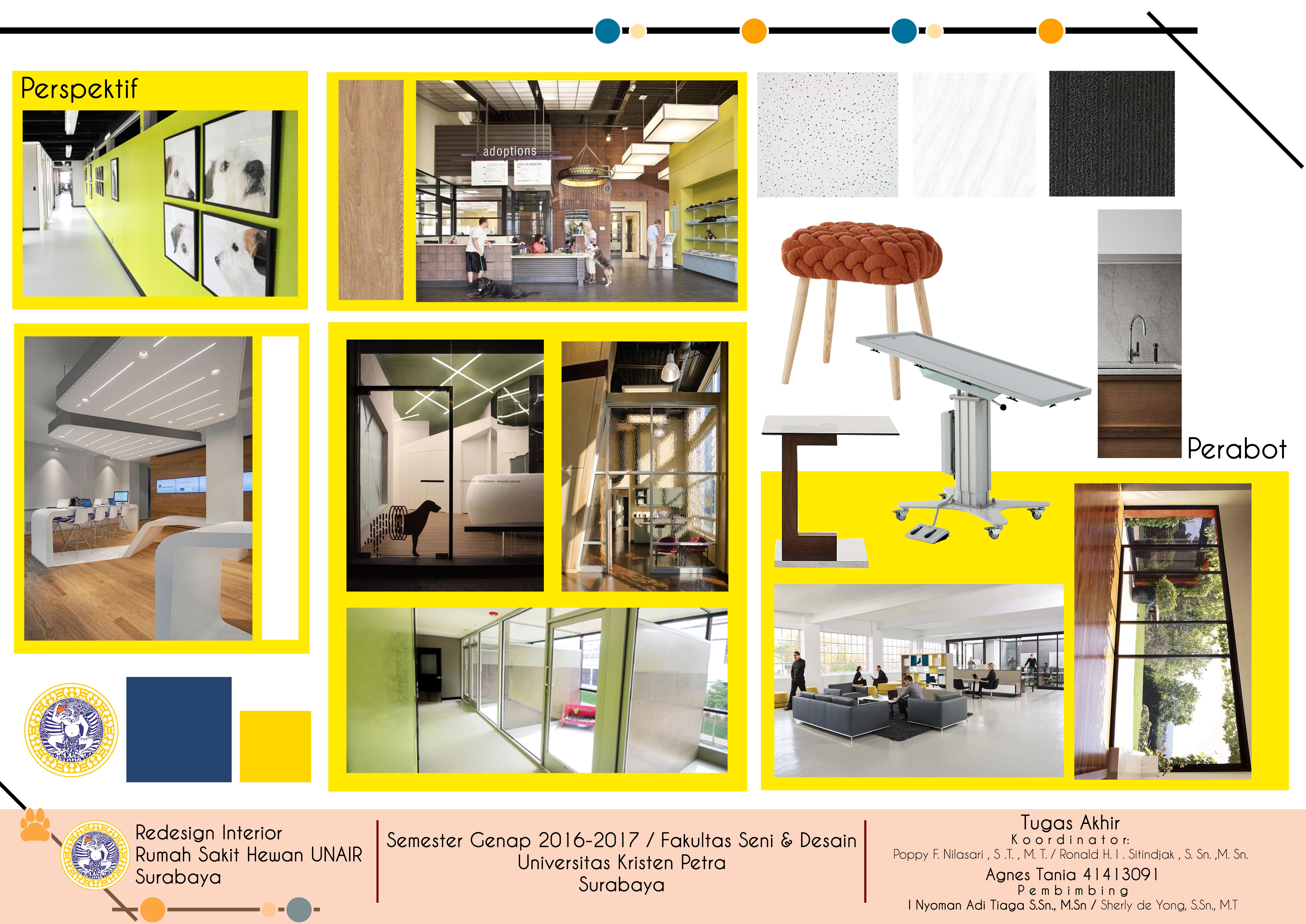 Hewan yang dirawat dan disayangi dengan sepenuh hati dapat juga mengalami sakit dan membutuhkan perawatan khusus. Salah satu solusi terbaik dari kondisi ini adalah mengunjungi Rumah Sakit Hewan. Rumah sakit hewan adalah pusat penanganan kesehatan hewan di mana ruangan dan fasilitas di dalamnya harus lengkap sesuai dengan ketentuan yang berlaku. Rumah Sakit Hewan Fakultas Kedokteran Hewan Universitas Airlangga (UNAIR) merupakan salah satu rumah sakit yang melayani masyarakat di bidang kesehatan hewan. Sayangnya, keberadaan rumah sakit hewan ini masih jarang diketahui oleh masyarakat Surabaya karena lokasinya yang tidak terletak di jalan umum. Selain itu, sejumlah ruangan di Rumah Sakit Hewan UNAIR-pun perlu untuk didesain ulang karena disebabkan oleh penampilan dan performanya yang rendah seperti kondisi ruangan yang nampak suram, kurangnya pencahayaan, kerusakan pada beberapa elemen interior serta desain yang tidak sesuai dengan fungsi masing-masing ruang. Dengan menata kembali letak dan fungsi ruangan tersebut dan juga desain yang menggunakan warna dan bentuk sesuai dengan brand image rumah sakit yaitu warna biru dan kuning pada elemen interior dan perabot yang melambangkan kepercayaan dan kehangatan sesuai dengan visi rumah sakit dan penerapan konsep profesional dan modern. Desain ulang dan rebranding diharapkan dapat meningkatkan kualitas rumah sakit hewan UNAIR, efisiensi kerja staff, dan minat masyarakat. Metode perancangan yang digunakan adalah melalui pola pikir desain yang meliputi observasi, brainstorm, prototipe, dan implementasi.