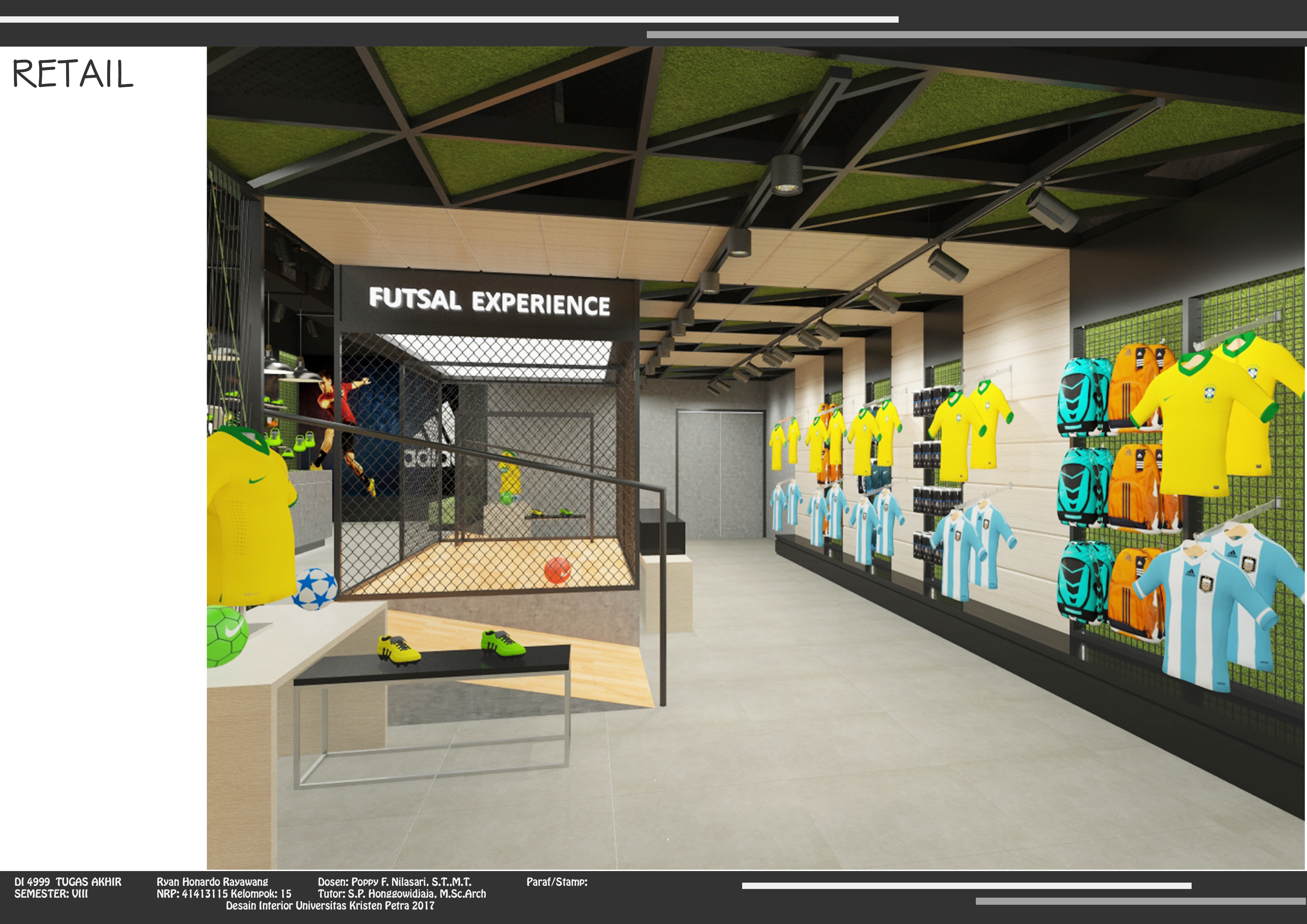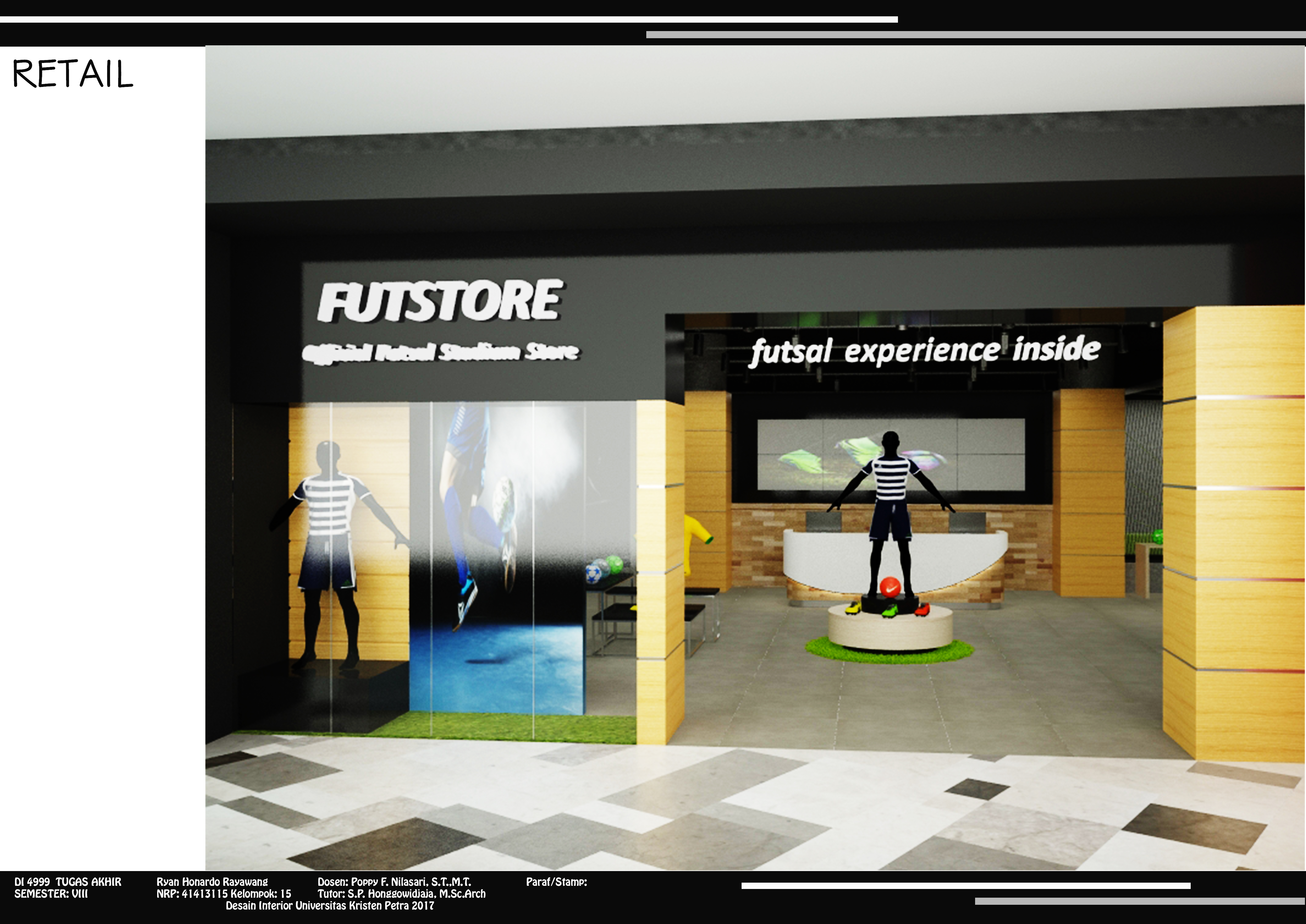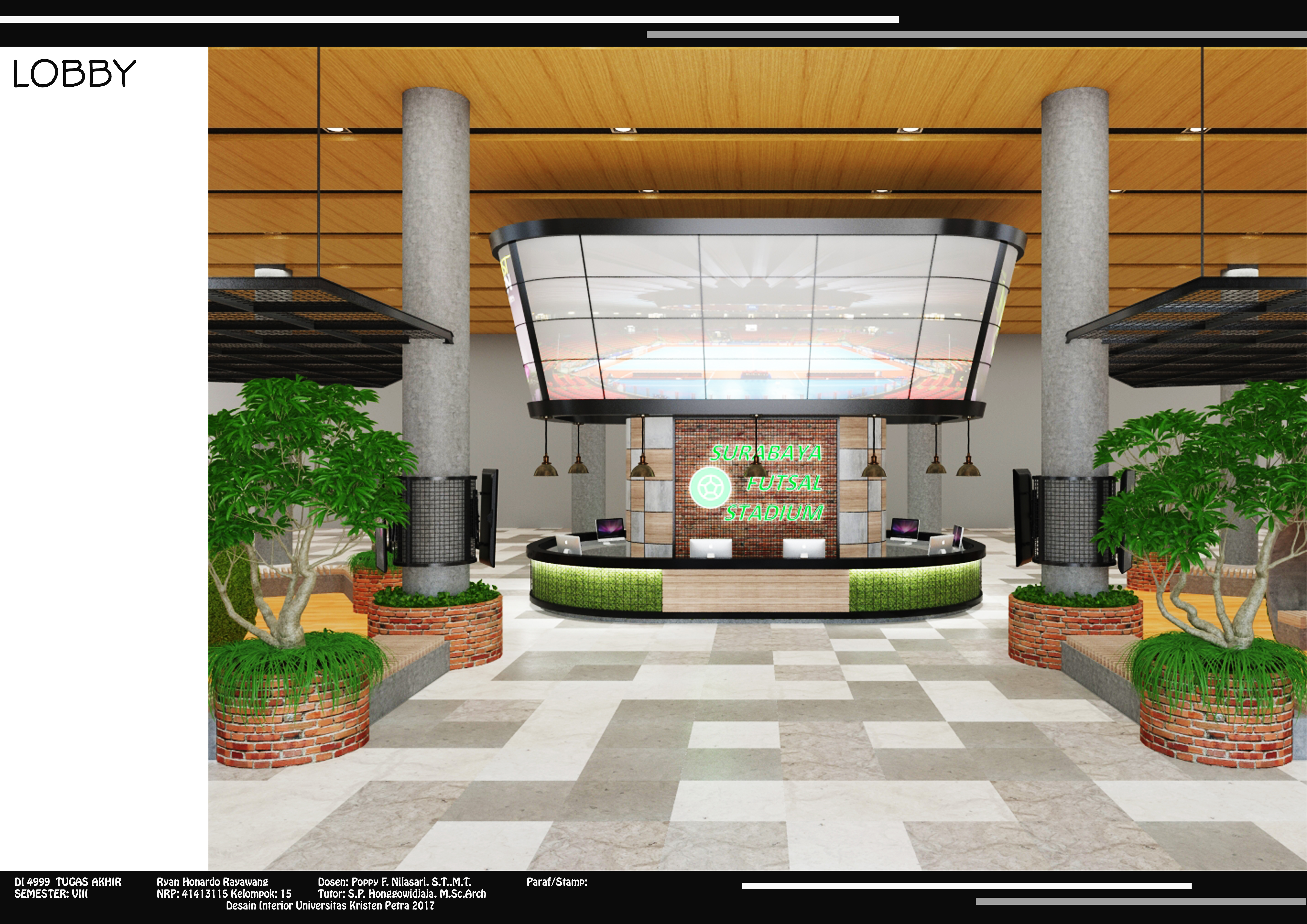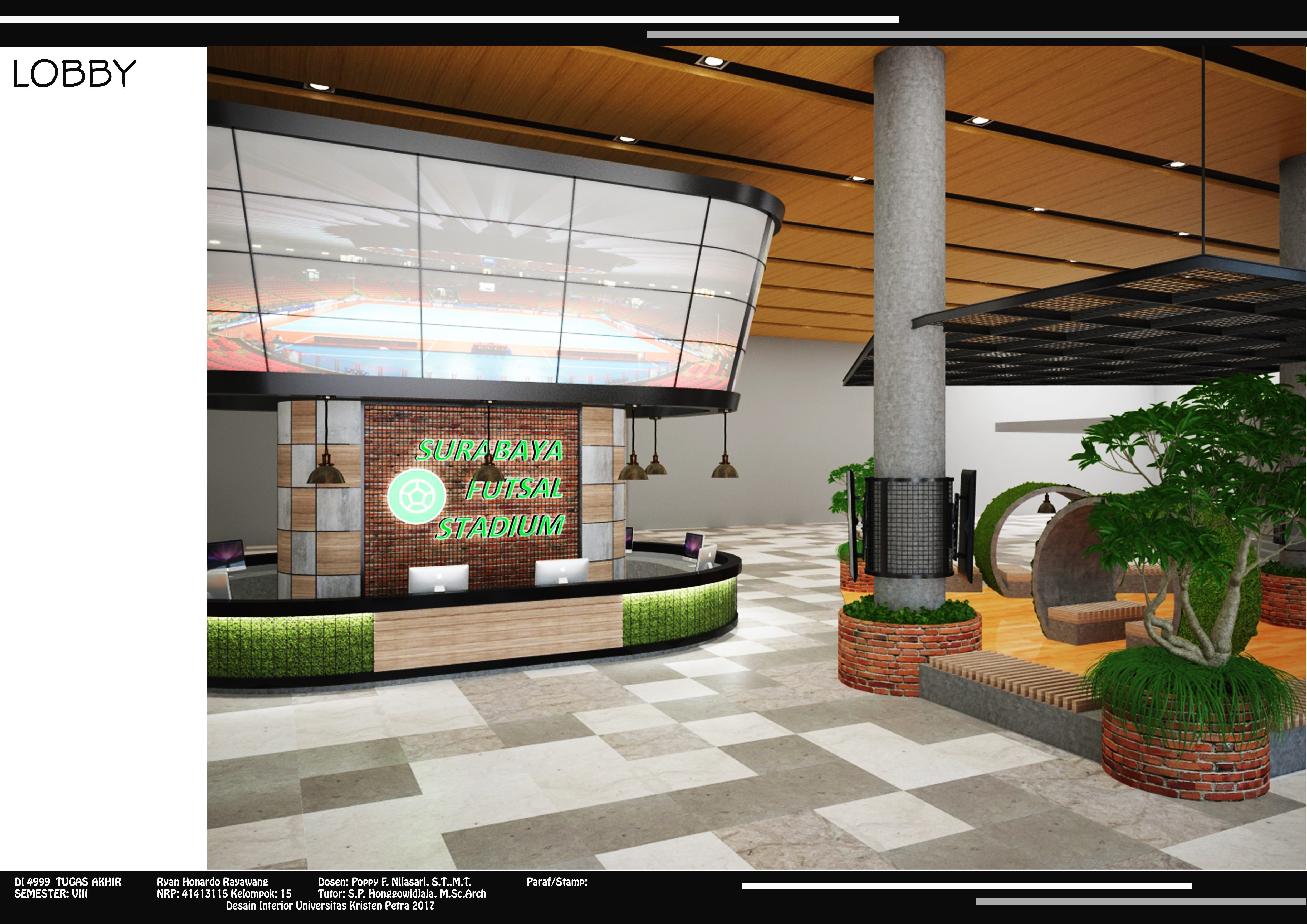 Perancangan Interior Lobby, Café dan Retail Stadion Futsal di Surabaya didasarkan pada realita keadaan olahraga futsal di Indonesai di mana olahraga ini sudah cukup popular di masyarakat namun hanya sebatas bermain dengan teman dan mengisi waktu pada saat malam minggu. Kenyataannya futsal masih kurang terekspos dari segi kompetisi professional maupun prestasi dari Timnas Indonesia yang memiliki potensi yang cukup baik dengan masuk peringkat 10 besar di Asia. Dengan fakta ini sudah seharusnya olahraga futsal mendapatkan perhatian dan dukungan yang lebih dari masyarakat, salah satunya dengan pembangunan Stadion Futsal. Selanjutnya, Stadion Futsal, dapat berkesempatan menjadi ikon dari suatu kota dan dapat menarik minat masyarakat perkotaan terhadap futsal. Perancangan ini bertujuan sebagai fasilitas pendukung stadion agar dapat menyelenggarakan kompetisi hingga tingkat international dan meningkatkan antusias masyarakat terdapat futsal karena dengan bertambahnya dukungan masyarakat diharapkan dapat meningkatkan prestasi dari Timnas Futsal Indonesia.