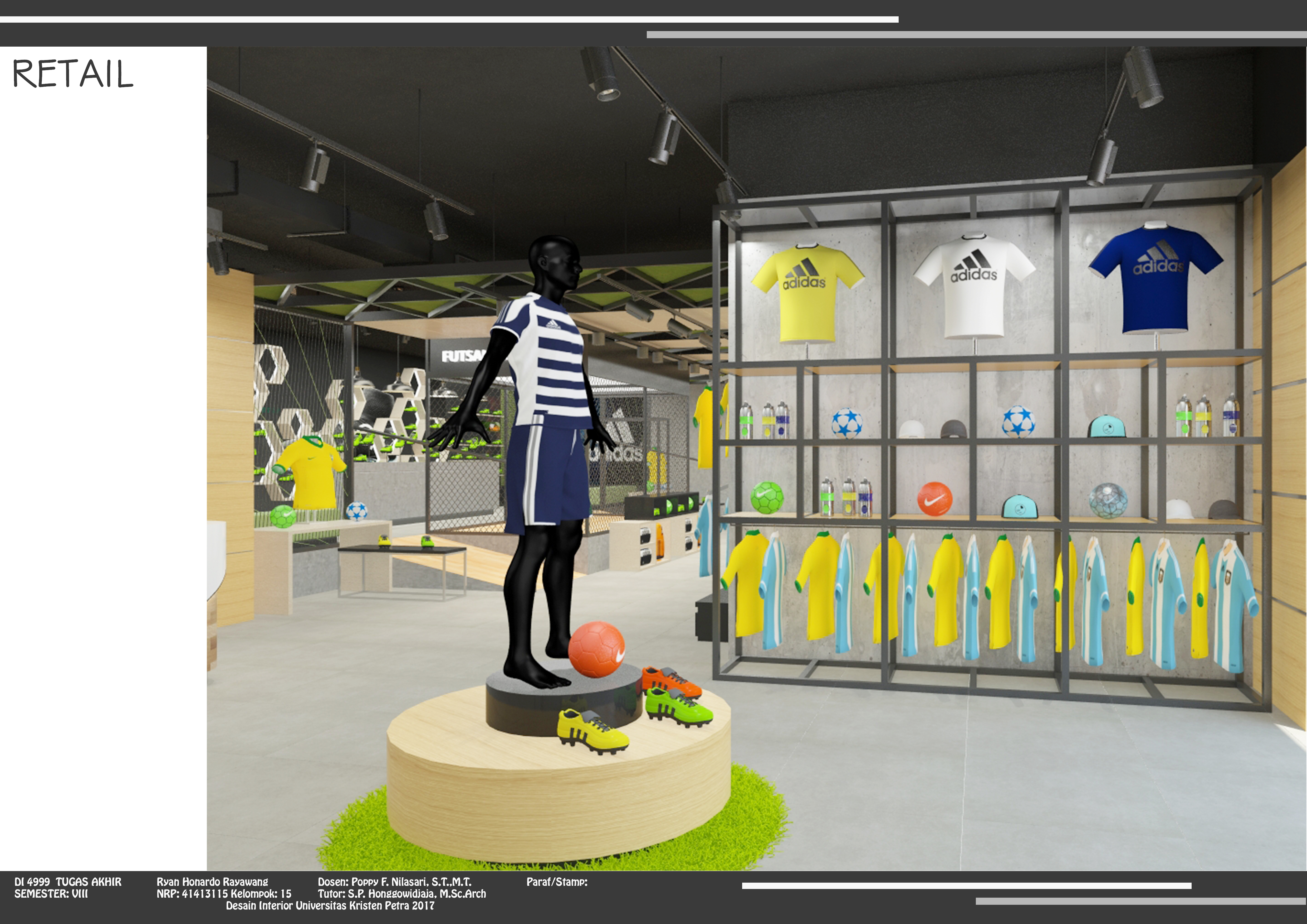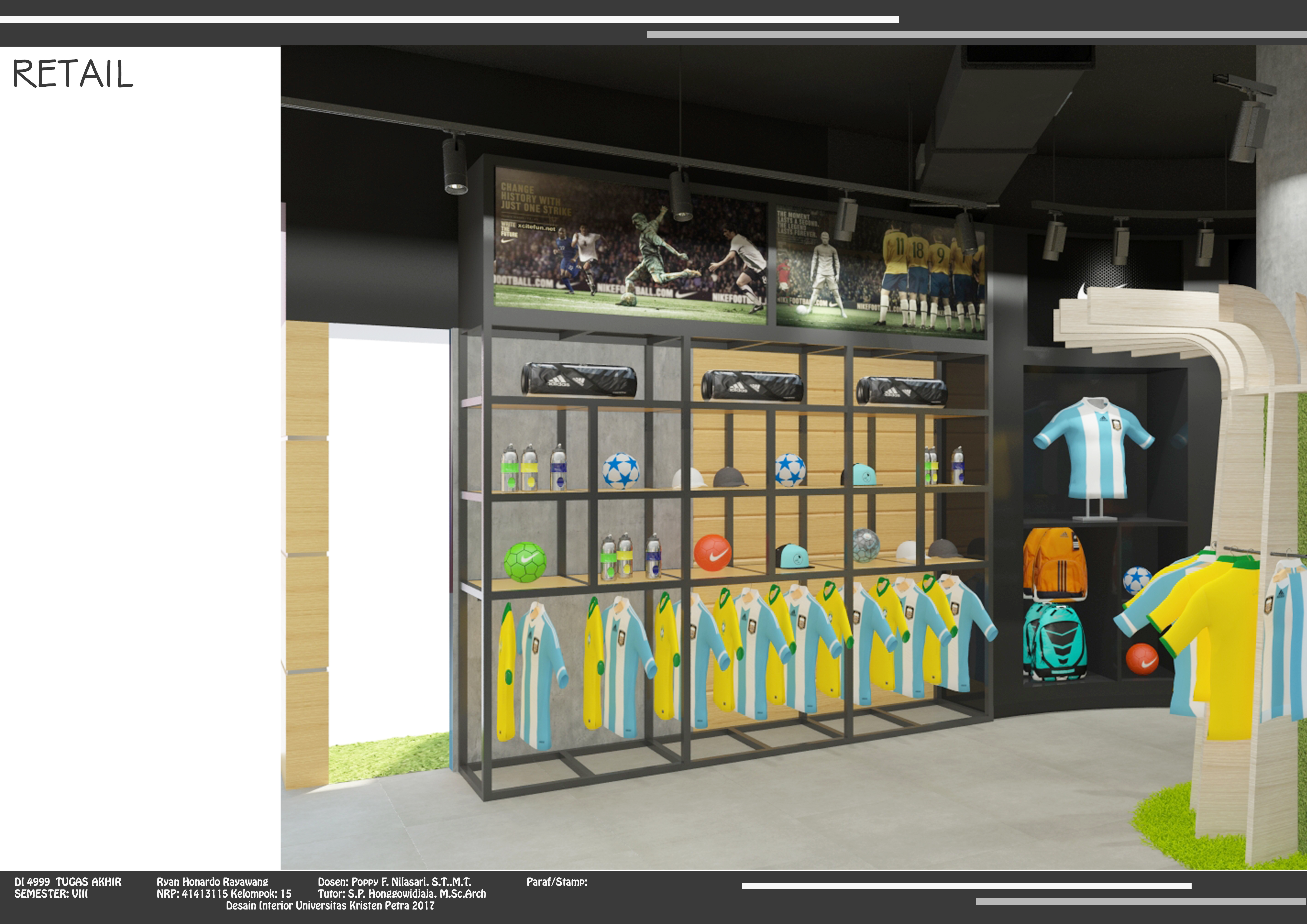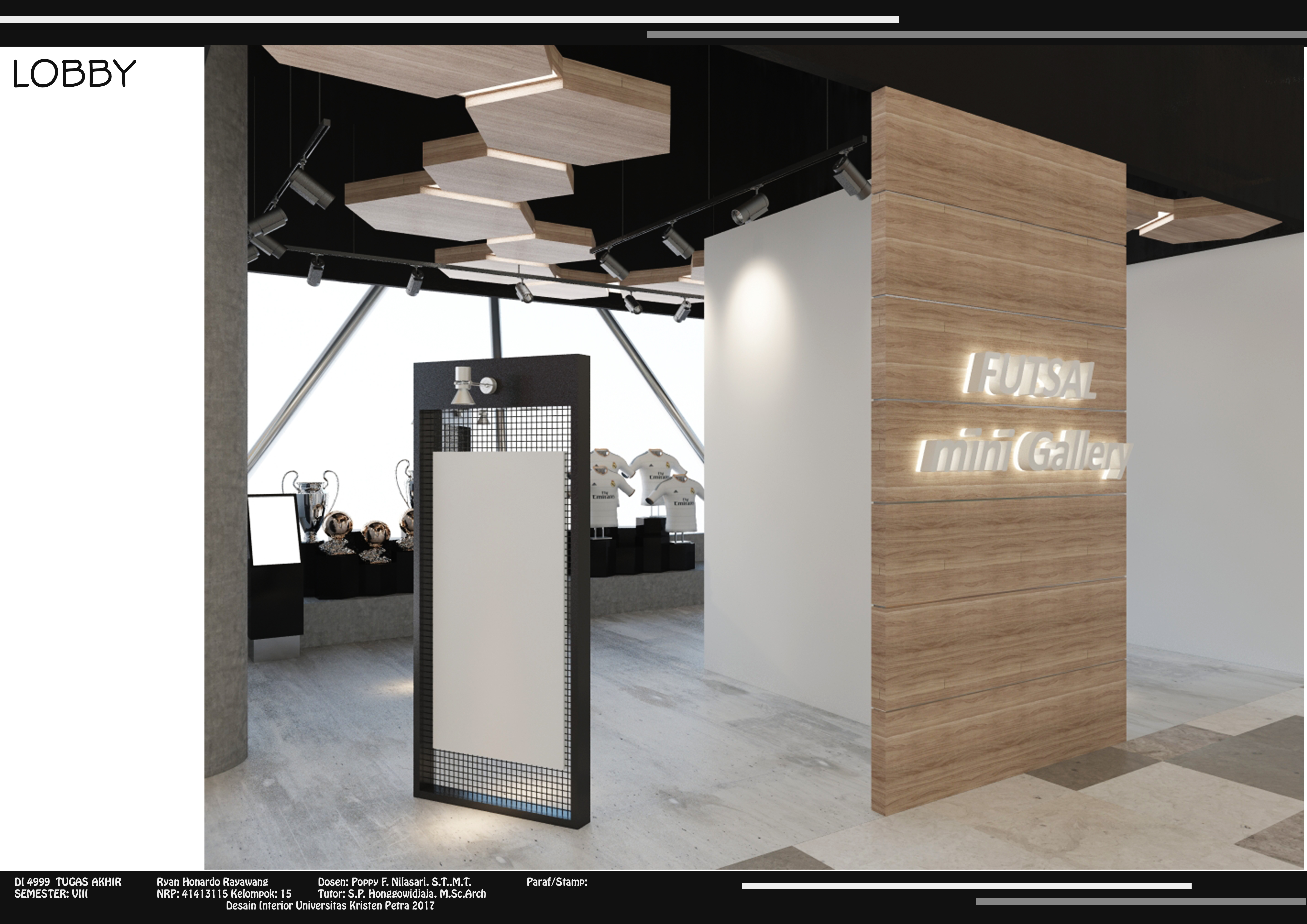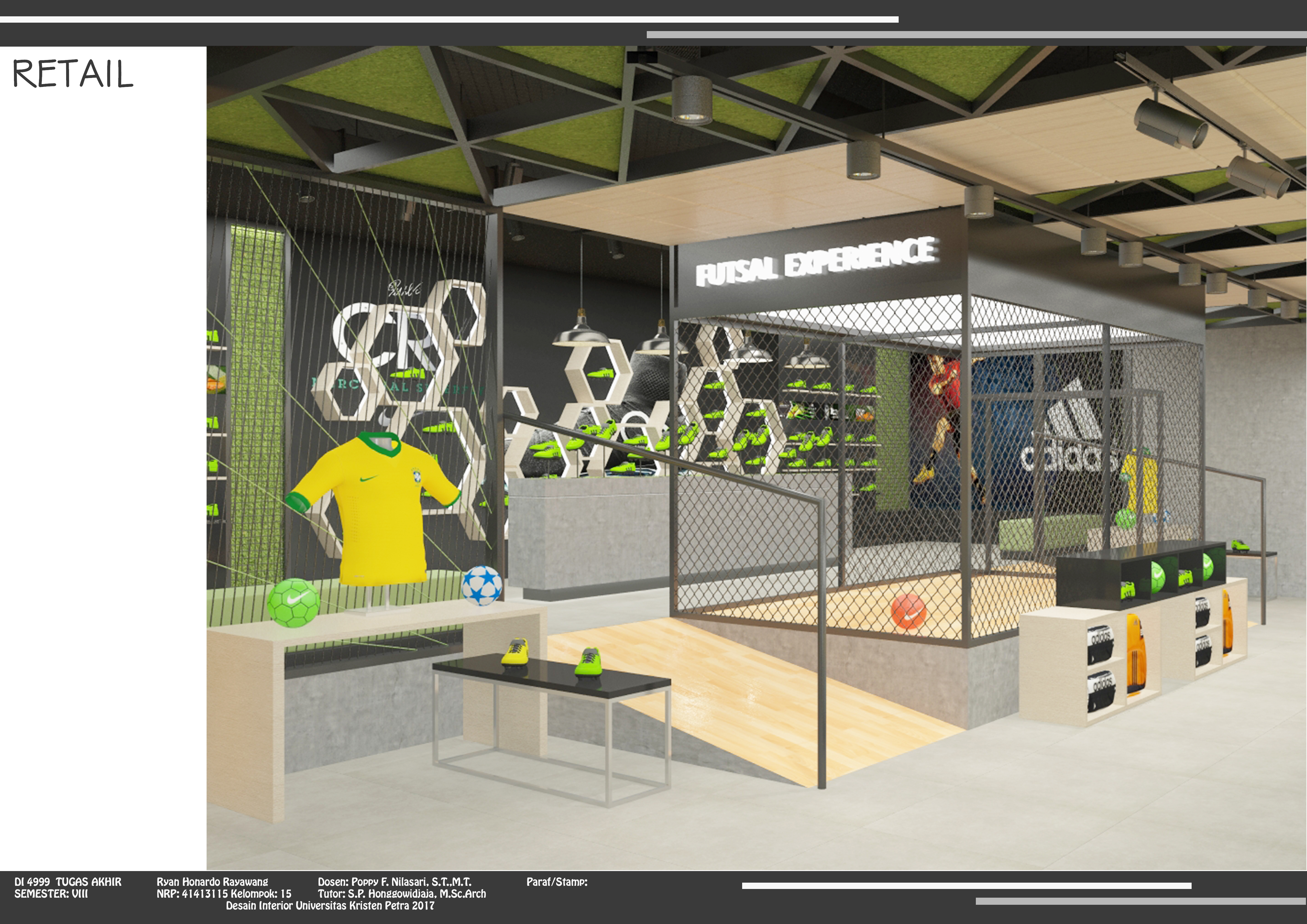 Perancangan Interior Lobby, Café dan Retail Stadion Futsal di Surabaya didasarkan pada realita keadaan olahraga futsal di Indonesai di mana olahraga ini sudah cukup popular di masyarakat namun hanya sebatas bermain dengan teman dan mengisi waktu pada saat malam minggu. Kenyataannya futsal masih kurang terekspos dari segi kompetisi professional maupun prestasi dari Timnas Indonesia yang memiliki potensi yang cukup baik dengan masuk peringkat 10 besar di Asia. Dengan fakta ini sudah seharusnya olahraga futsal mendapatkan perhatian dan dukungan yang lebih dari masyarakat, salah satunya dengan pembangunan Stadion Futsal. Selanjutnya, Stadion Futsal, dapat berkesempatan menjadi ikon dari suatu kota dan dapat menarik minat masyarakat perkotaan terhadap futsal. Perancangan ini bertujuan sebagai fasilitas pendukung stadion agar dapat menyelenggarakan kompetisi hingga tingkat international dan meningkatkan antusias masyarakat terdapat futsal karena dengan bertambahnya dukungan masyarakat diharapkan dapat meningkatkan prestasi dari Timnas Futsal Indonesia.