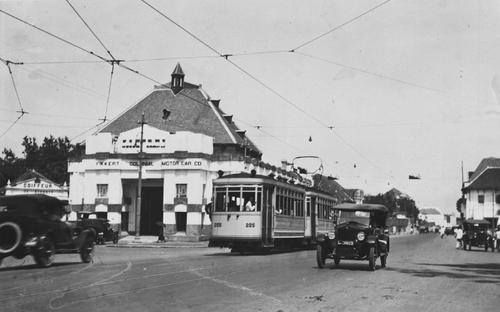 Mobil dan trem di jalan Toenjoengan Surabaya