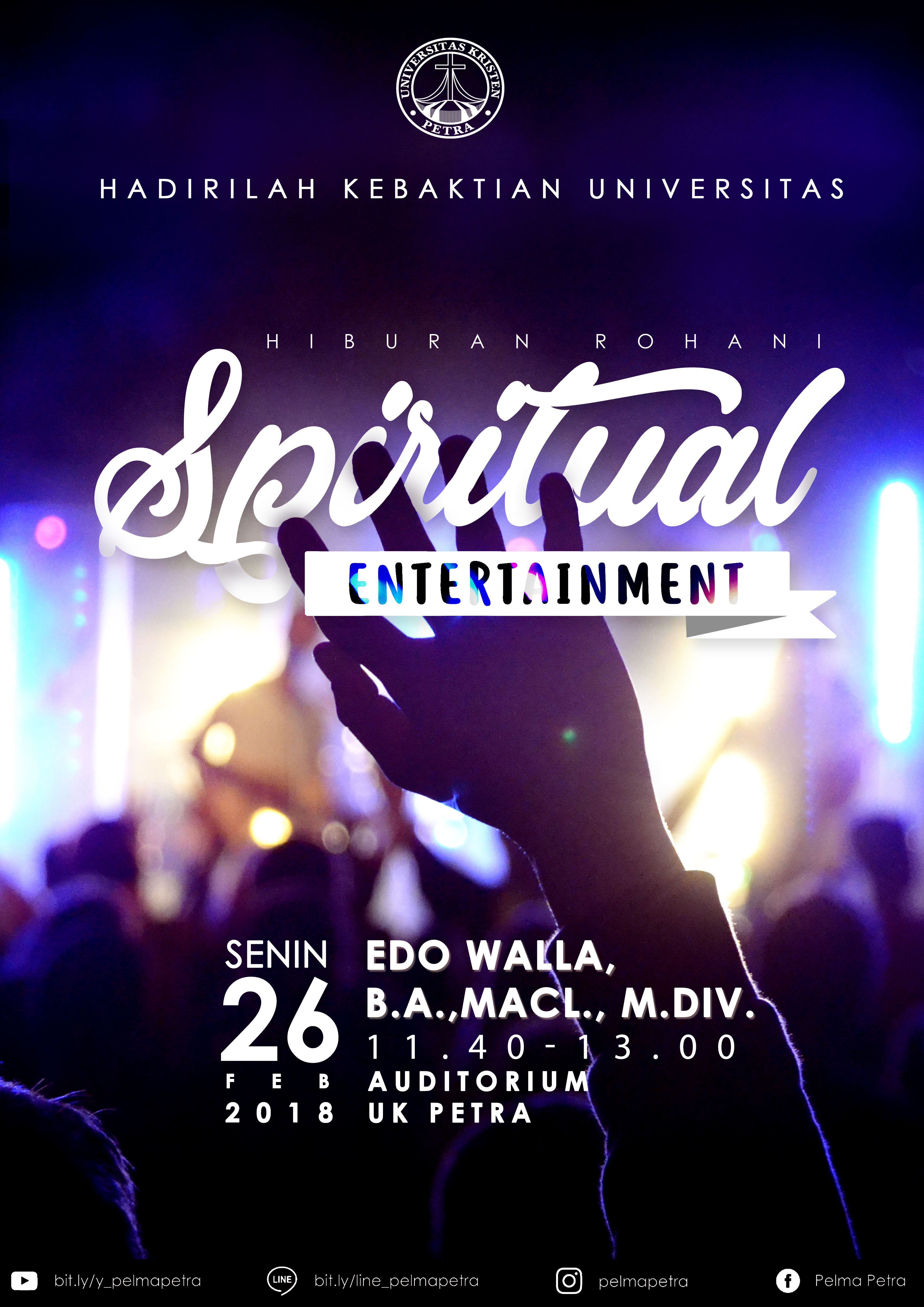 Universitas Kristen Petra Surabaya mengundang civitas UK Petra untuk hadir dalam kebaktian universitas yang diadakan pada Senin, 26 Februari 2018 bertempat di Auditorium UK Petra. Kebaktian ini mengangkat tema Spiritual Entertainment (hiburan rohani) dengan menghadirkan pengkhotbah Edo Walla.