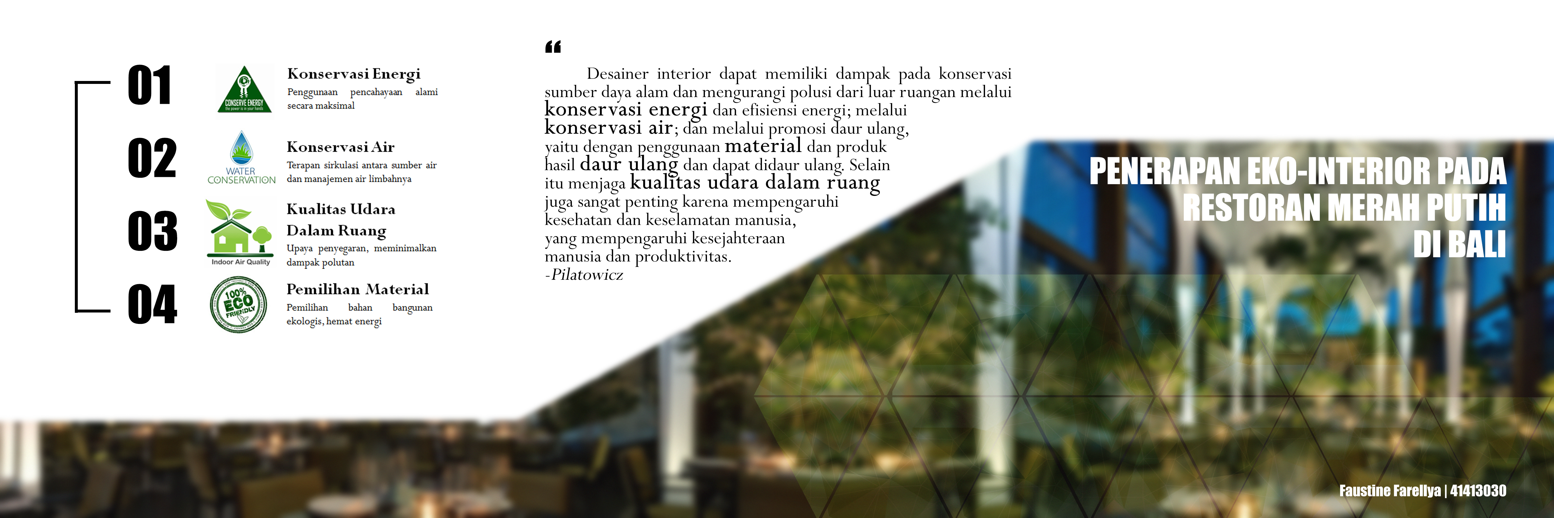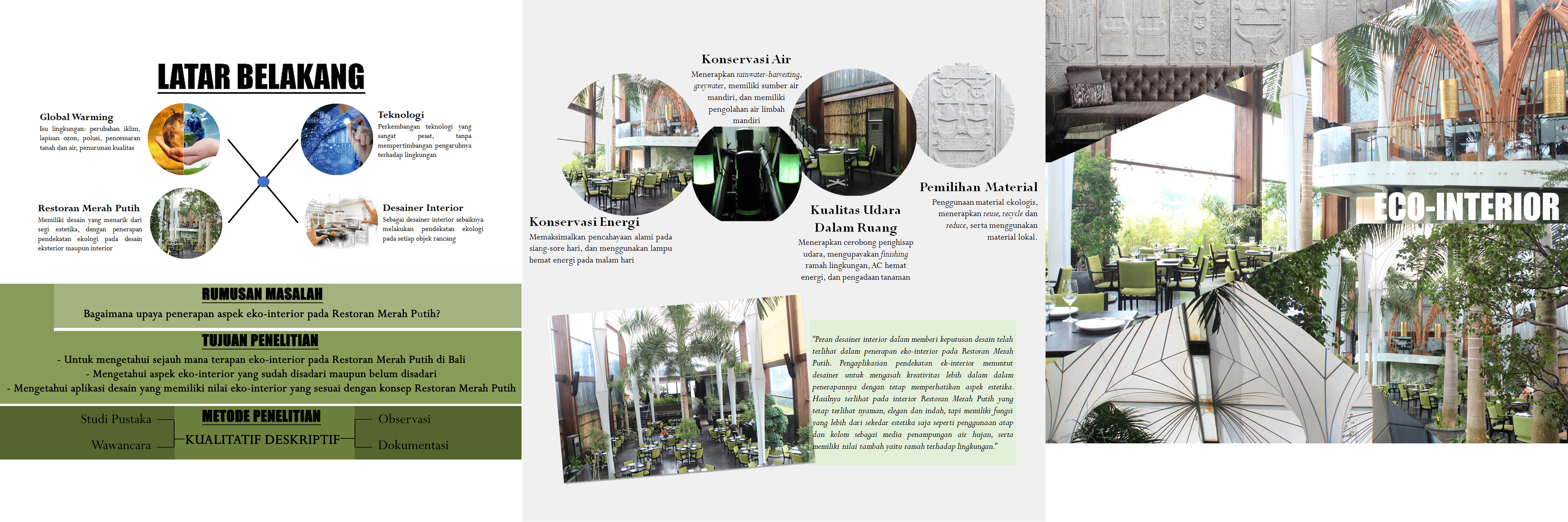 Salah satu upaya yang dapat dilakukan oleh desainer interior dalam mengatasi isu-isu lingkungan adalah dengan menerapkan pendekatan eko-interior pada konsep perancangannya. Penerapan eko-interior sangat diperlukan untuk menanamkan sikap bertanggung jawab terhadap lingkungan. Selain itu, penerapan eko-interior dapat membantu mewujudkan ruang yang sehat, ramah lingkungan, dan meningkatkan kenyamanan serta produktivitas. Aspek-aspek eko-interior yang meliputi konservasi energi, konservasi air, kualitas udara dalam ruang, dan pemilihan material, akan digunakan sebagai tolok ukur analisis pada penelitian ini. Restoran Merah Putih dipilih sebagai objek penelitian karena restoran ini telah menerapkan prinsip ramah lingkungan pada bangunannya, baik dari segi eksterior maupun interior. Penelitian ini bertujuan untuk mengetahui penerapan aspek eko-interior pada bangunan Restoran Merah Putih di Bali. Metode penelitian yang digunakan adalah pendekatan kualitatif dengan metode analisis deskriptif. Hasil dari penelitian ini adalah restoran telah menerapkan aspek-aspek eko-interior secara maksimal pada aspek konservasi energi dan konservasi air. Penggunaan pencahayaan alami telah dimaksimalkan sepanjang hari pada setiap area pada restoran, serta menggunakan pencahayaan buatan hemat energi pada malam hari. Pada aspek konservasi air, restoran telah menerapkan sistem penampungan air hujan dan pengolahan air limbah. Sedangkan pada aspek kualitas udara dalam ruang dan pemilihan material masih belum diterapkan secara optimal pada area-area restoran secara keseluruhan, seperti kurangnya ventilasi serta material dan finishing pada elemen pembentuk ruang (lantai, dinding, plafon), elemen pengisi ruang maupun elemen dekoratif yang tidak sepenuhnya ramah lingkungan.
