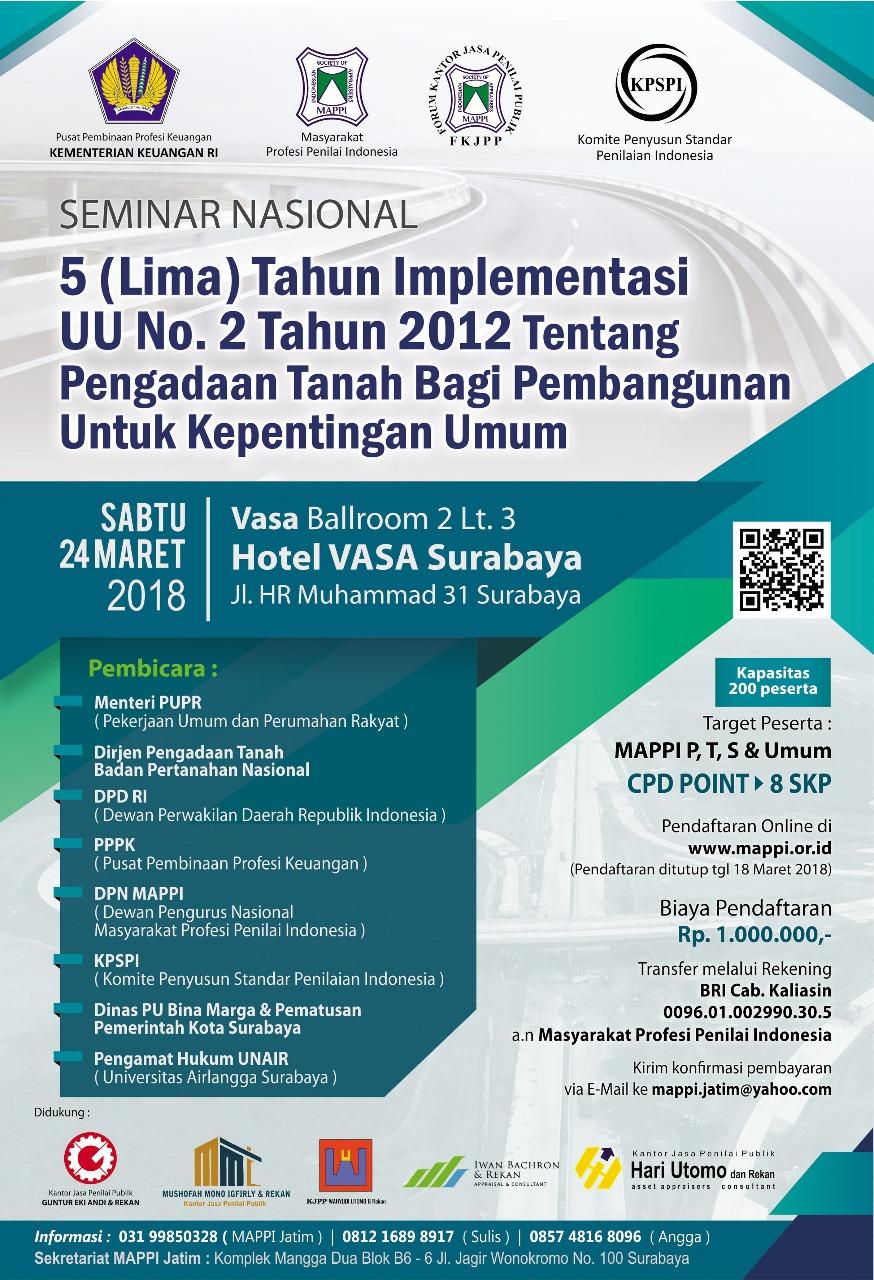 Masyarakat Profesi Penilai Indonesia bekerjasama dengan Departemen Keuangan RI, mengadakan seminar nasional yang bertemakan "5 tahun implementasi UU no.2 tahun 2012 tentang pengadaaan tanah bagi pembangunan untuk kepentingan umum". Seminar ini diadakan pada Sabtu, 28 Maret 2018 bertempat di Vasa Ballrom 2 lt 3. Hotel Vasa Surabaya. Dengan biaya pendaftaran 1.000.000 rupiah.