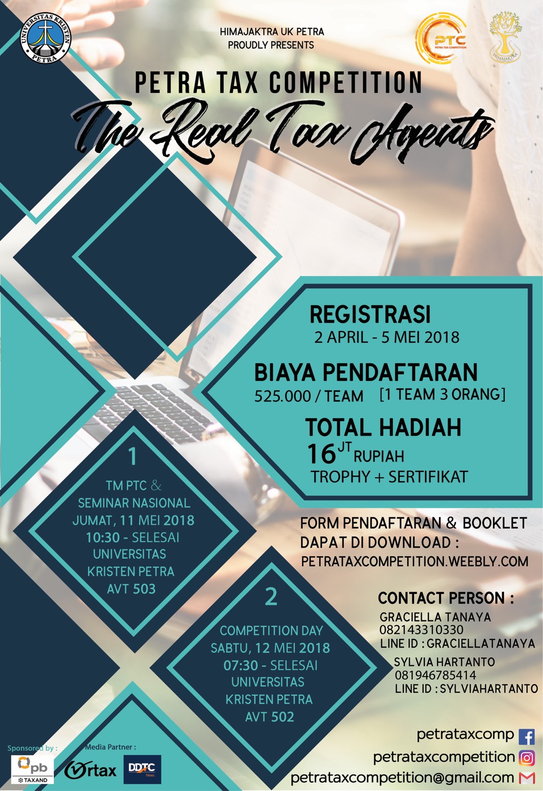 Program Studi Akuntansi Pajak Universitas Kristen Petra Surabaya, mengadakan acara Petra Tax Competition 2018. Seminar dan lomba tentang pajak menjadi rangkaian acara ini. Kegiatan ini dilaksanakan pada 11-12 Mei 2018. Bertempat di Kampus UK Petra.