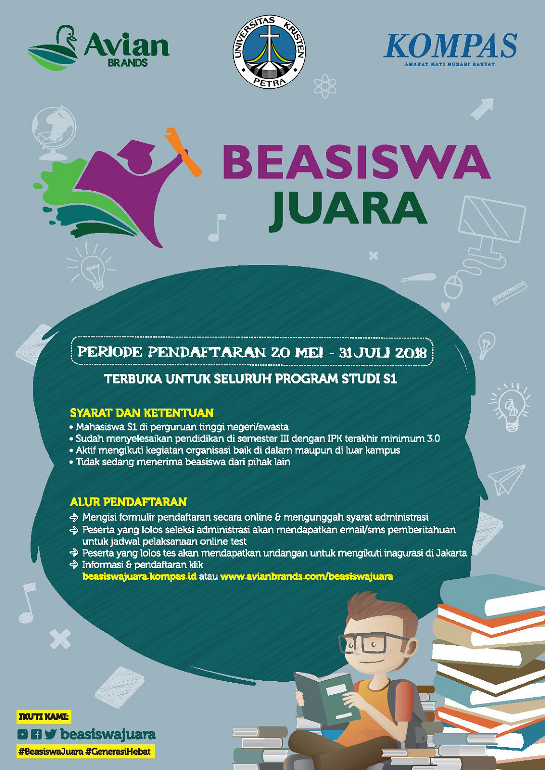 Kompas dan Avian Brands memberikan beasiswa bagi mahasiswa perguruan tinggi negeri dan swasta di Indonesia. Pendaftaran seleksi beasiswa ini di buka pada 20 Mei hingga 31 Juli 2018. untuk keterangan yang lengkap bisa dilihat di beasiswajuara.juara.co.id atau www.avianbrands.com/beasiswajuara