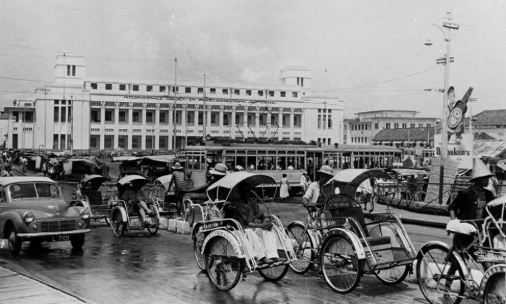Tram sedang mangkal di Jembatan Merah atau Taman Jayengrono pada tahun 1952.
