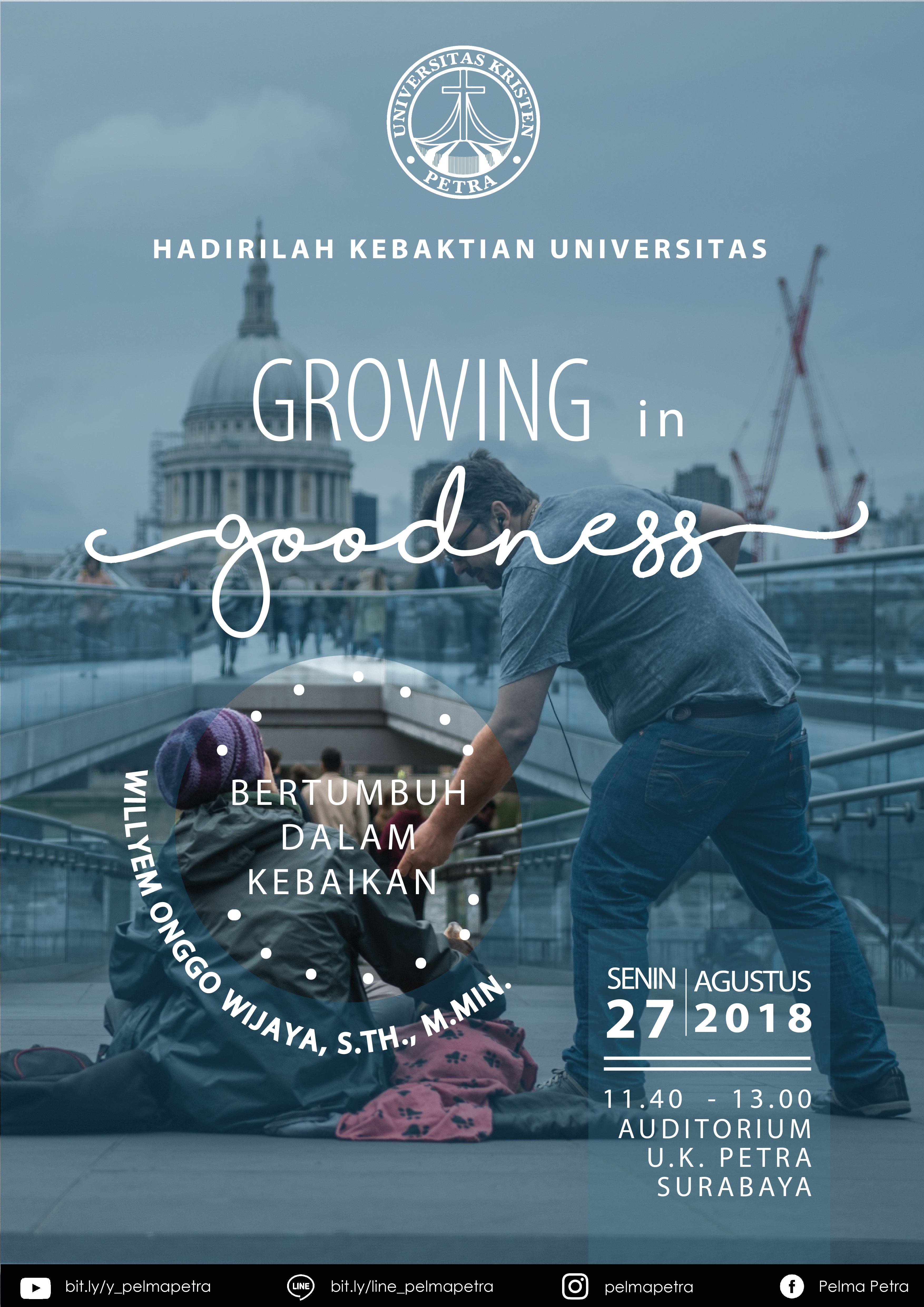 Universitas Kristen Petra mengundang seluruh sivitas akademika UK Petra, untuk hadir dalam kebaktian setiap hari senin. Pada tanggal 27 Agustus 2018 kebaktian bertemakan growing in goodness (bertumbuh dalam kebaikan), dengan pengkhotbah Willyem Onggo Wijaya, bertempat di Auditorium UK Petra.