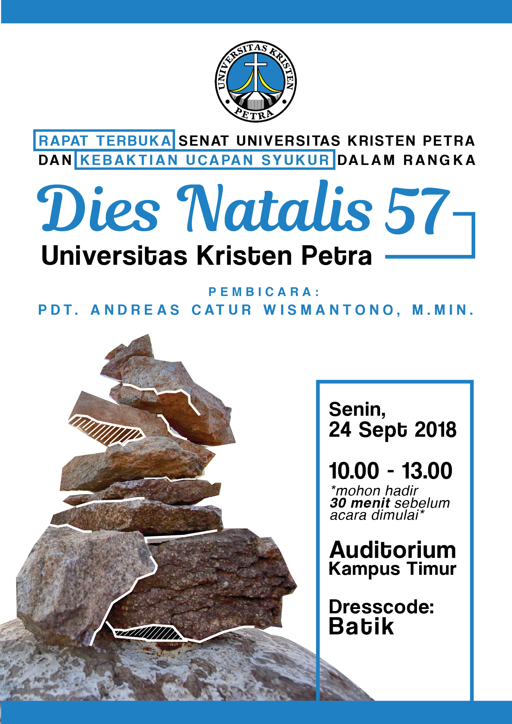 Dalam rangka Dies Natalis ke 57 Universitas Kristen Petra Surabaya, Senat Universitas mengadakan rapat terbuka dan kebaktian ucapan syukur. Acara ini diadakan pada tanggal 24 September 2018 bertempat di Auditorium Kampus Timur Universitas Kristen Petra Surabaya. Dengan menghadirkan bapak Andreas Catur Wismantono sebagai Pengkhotbah.