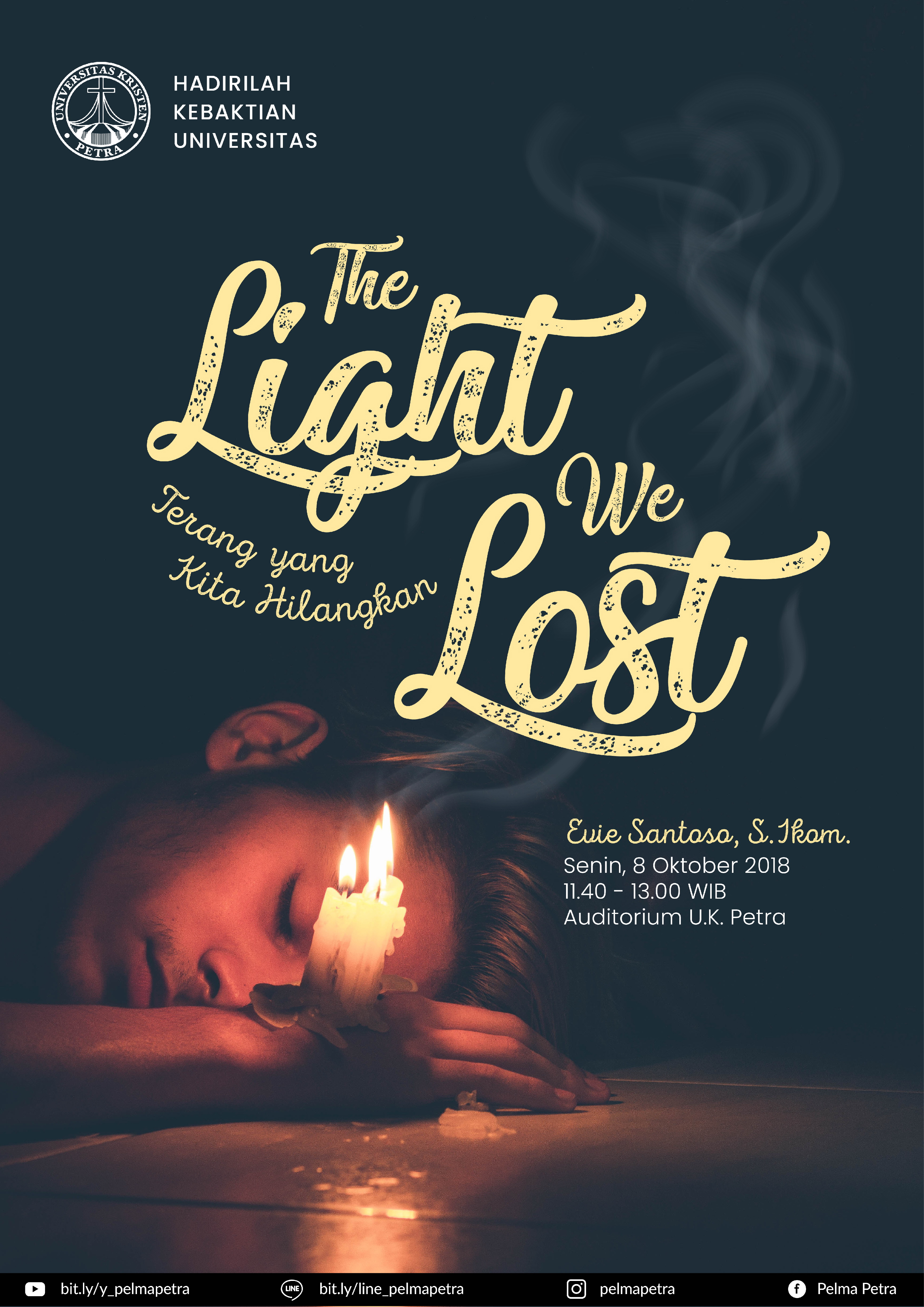 Universitas Kristen Petra Surabaya mengundang seluruh civitas akademika untuk hadir dalam kebaktian setiap hari senin. Pada tanggal 8 Oktober 2018 dengan mengangkat tema "The light we lost (terang yang kita hilangkan" menghadirkan ibu Evie Santoso sebagai pengkhotbah.