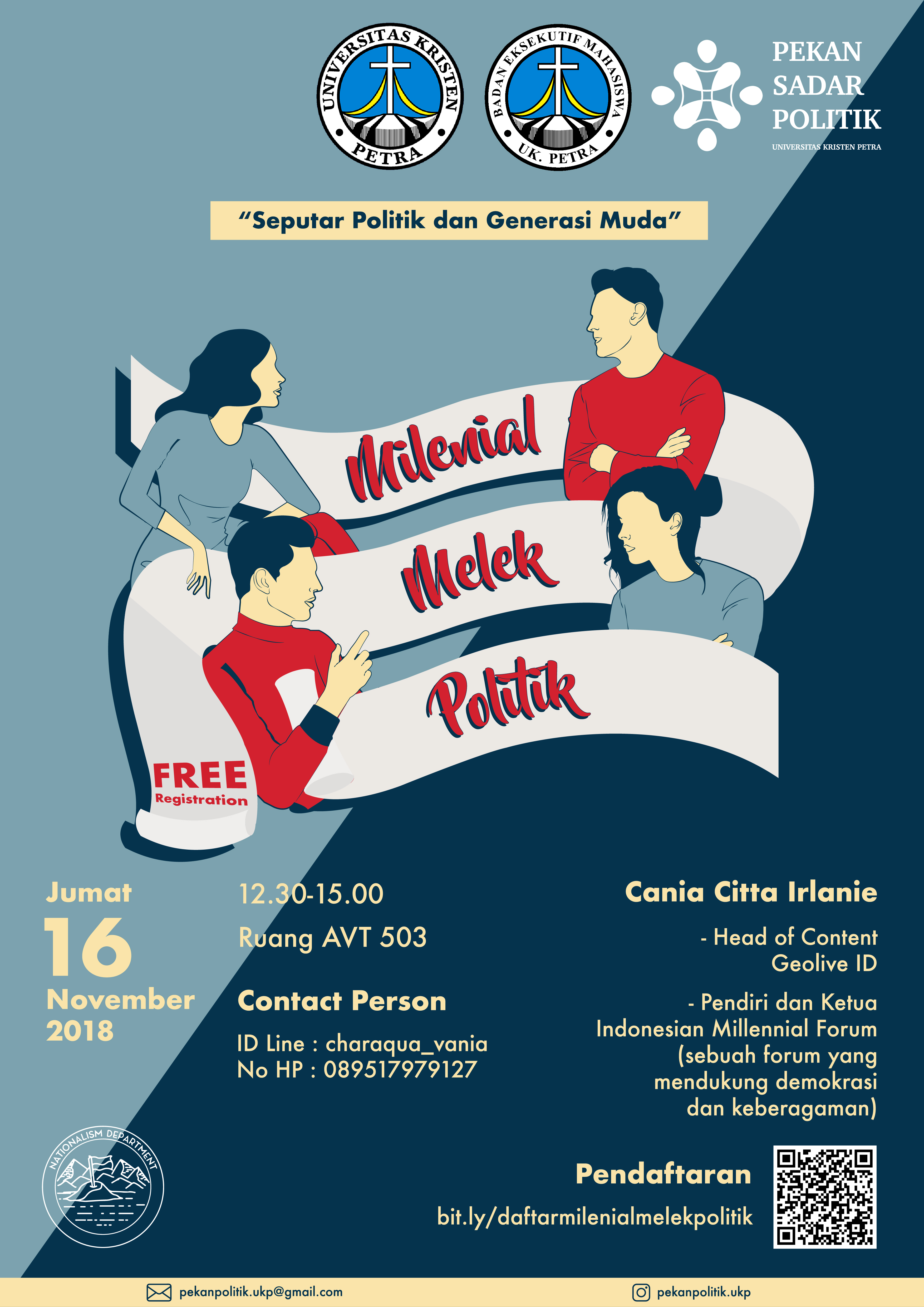 Badan Eksekutif Mahasiswa Universitas Kristen Petra Surabaya pada tanggal 16 November 2018 mengadakan seminar dengan tema "Milenial melek politik". Dalam acara ini hadir Cania Citta Irlanie sebagai nara sumber. Bertempat di ruang AV.T.503 dan bebas biaya masuk.