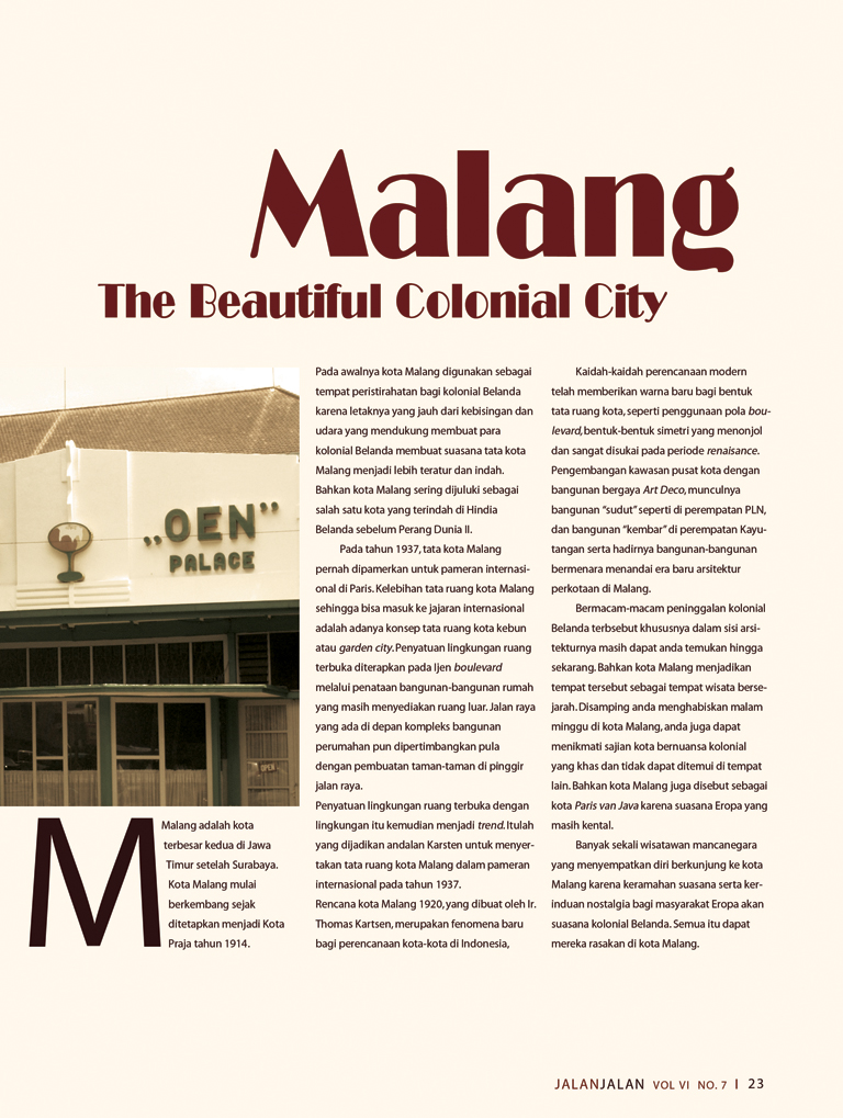 Malang adalah kota yang memiliki suasana historikal yang tinggi dengan banyak