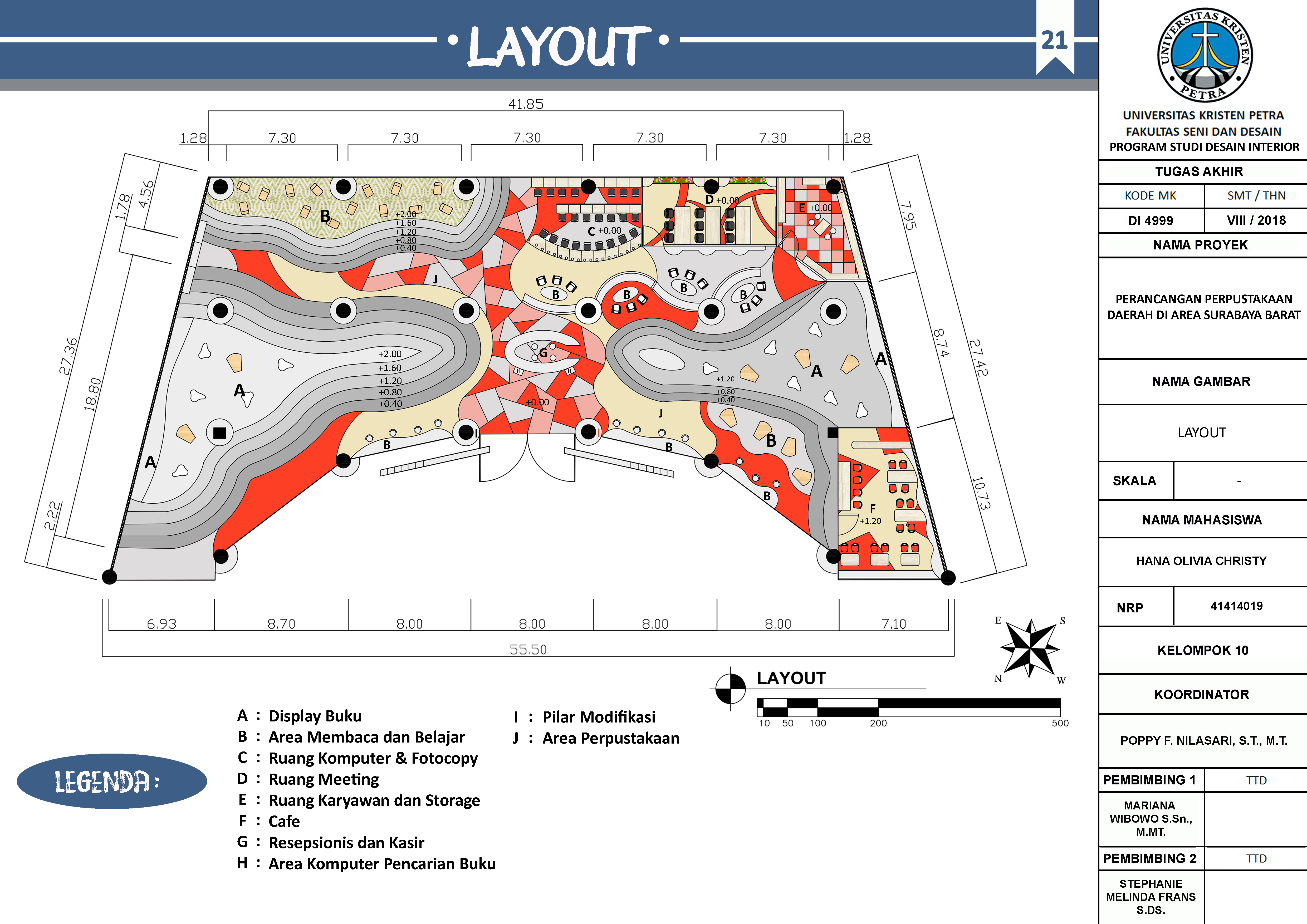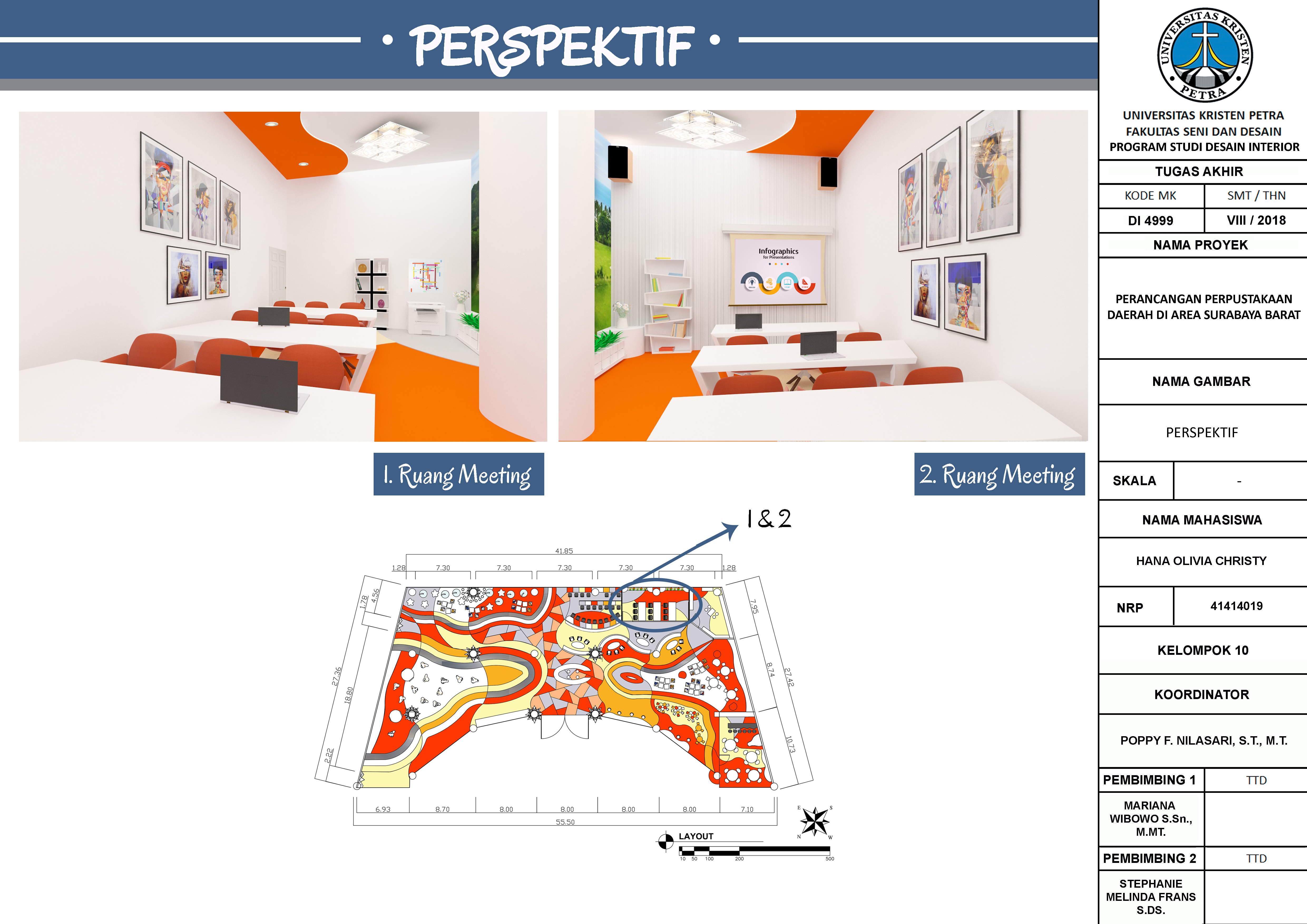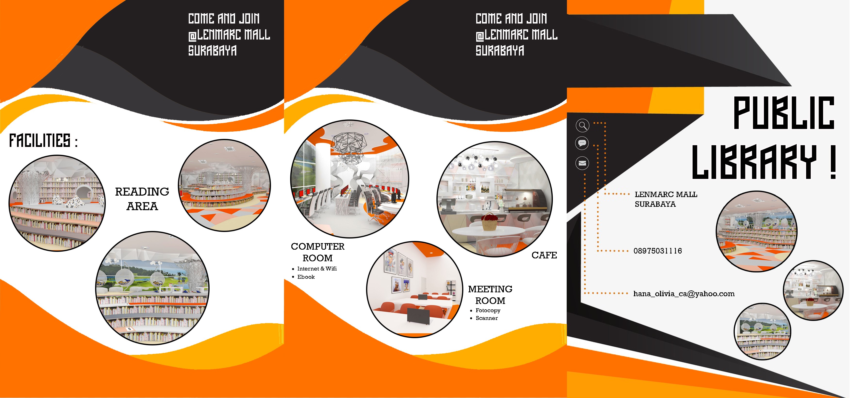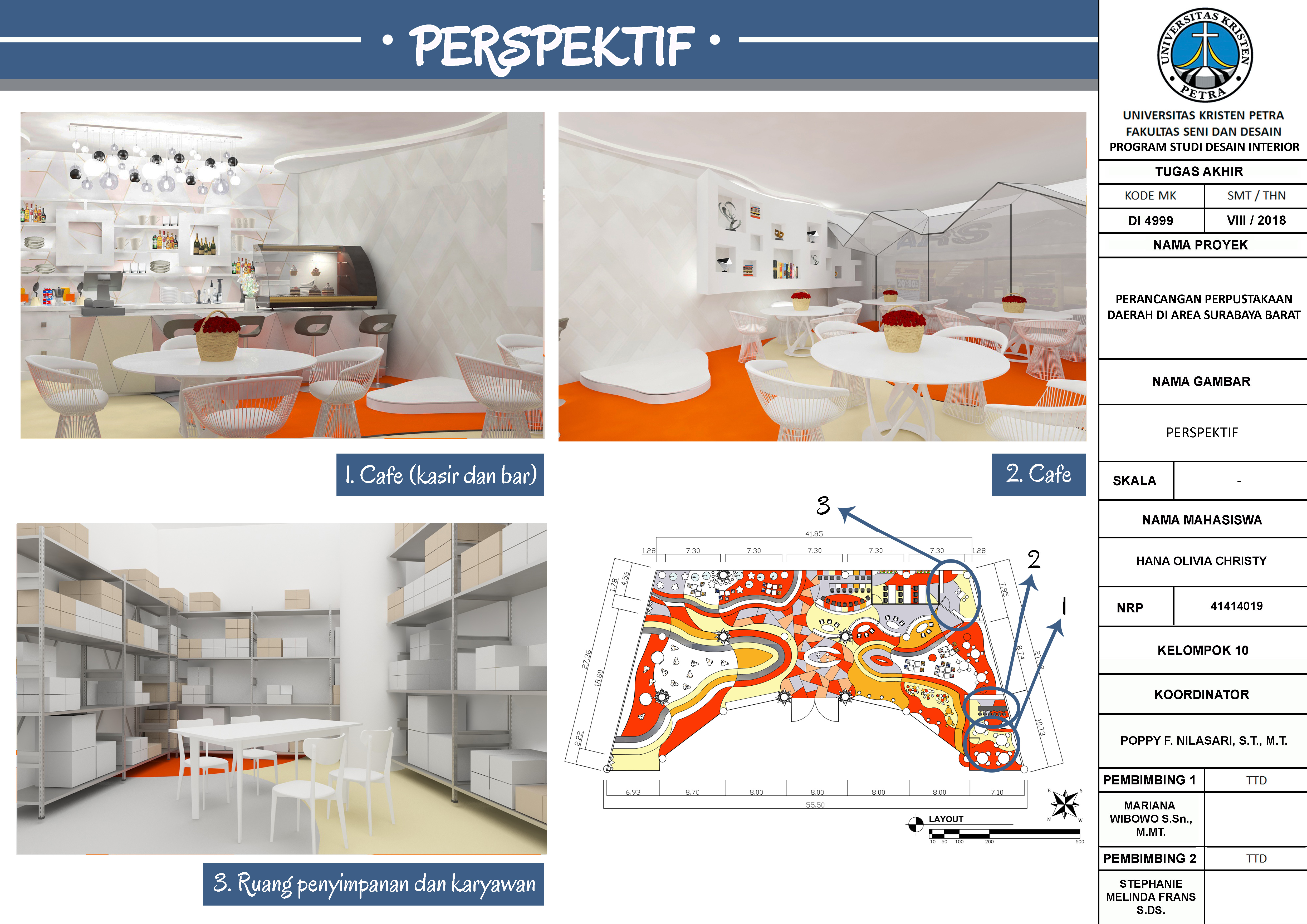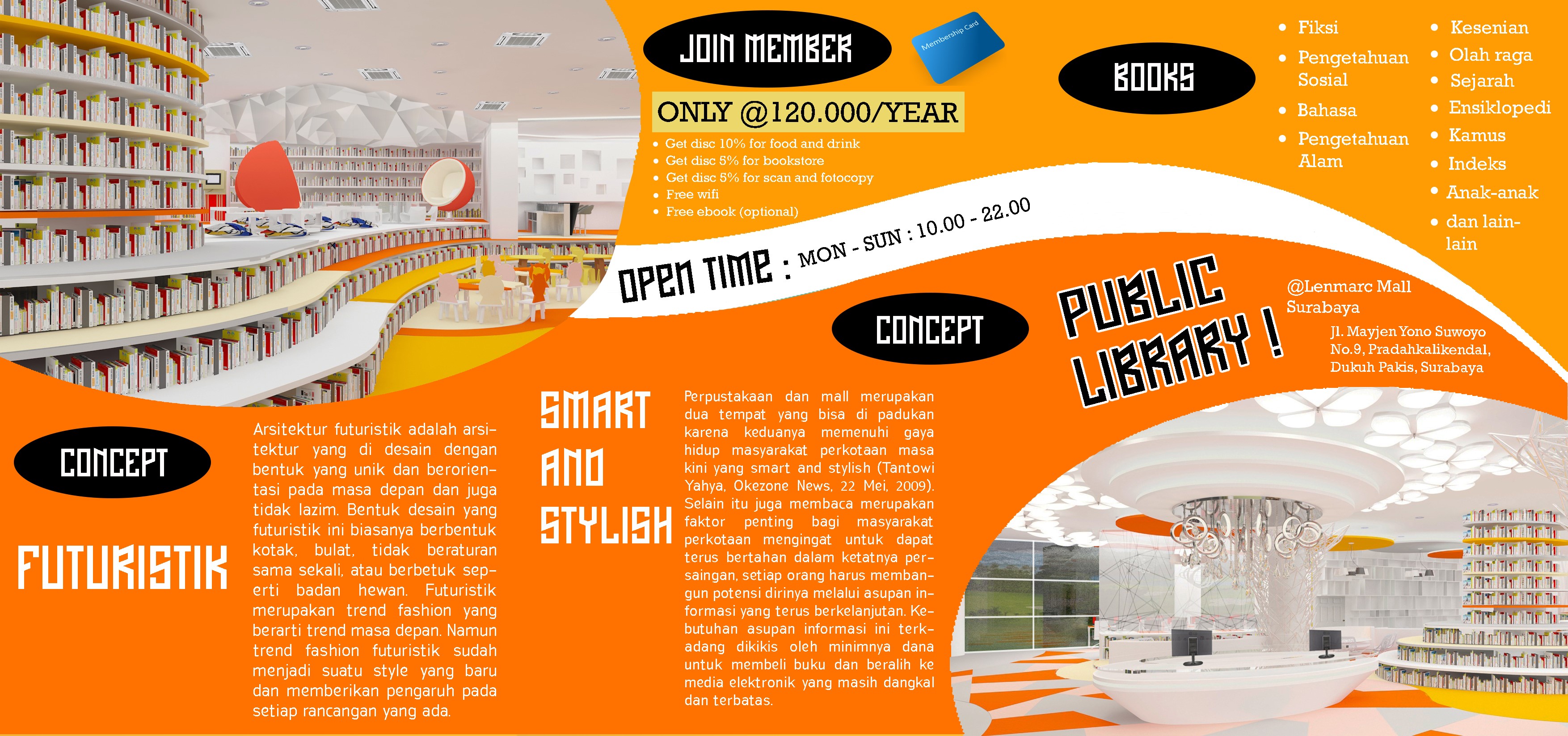 Di era modern sekarang ini, orang cenderung mencari kesenangan atau hiburan di public space, seperti mall dan banyak orang hanya mengikuti trend tanpa memperhatikan hal-hal penting lainnya seperti budaya membaca. Perancangan Interior Perpustakaan Daerah di Area Surabaya Barat ini bertujuan untuk menjawab fenomena banyaknya masyarakat Indonesia khususnya di Kota Surabaya yang malas membaca buku. Target khusus dari perancangan ini adalah memberikan fasilitas atau mewadahi kebutuhan masyarakat akan membaca. Perancangan ini menggabungkan perpustakaan daerah dengan mall sehingga menghadirkan konsep yang baru untuk mengikuti gaya hidup masyarakat kini yang smart and stylish dengan gaya futuristik. Metode dalam proses perancangan dibagi menjadi 7 tahap, yaitu: define, research, ideate, prototype, selection, implementation, and learn. Hasil perancangan ini menggunakan konsep futuristik yang diaplikasikan pada penataan perabot, bentuk perabot, elemen interior, pola lantai, pola plafon dan material yang digunakan.
