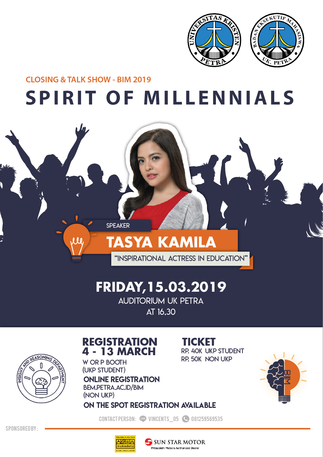 Pada penutupan Bulan Inspirasi Mahasiswa 2019, diadakan acara talkshow dengan narasumber Tasya Kamila. Acara ini dilaksanakan pada 15 Maret 2019, bertempat di Auditorium UK Petra.