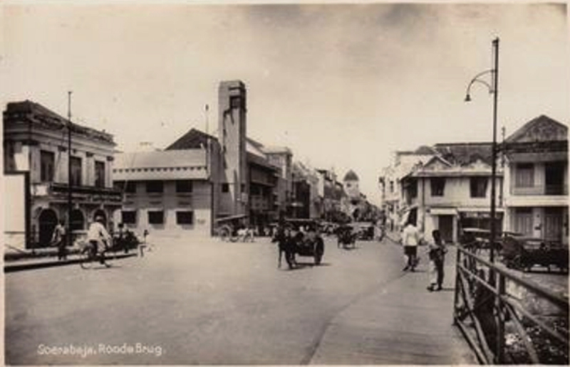 Jembatan Merah dengan latar belakang jalan Kembang Jepun pada tahun 1930