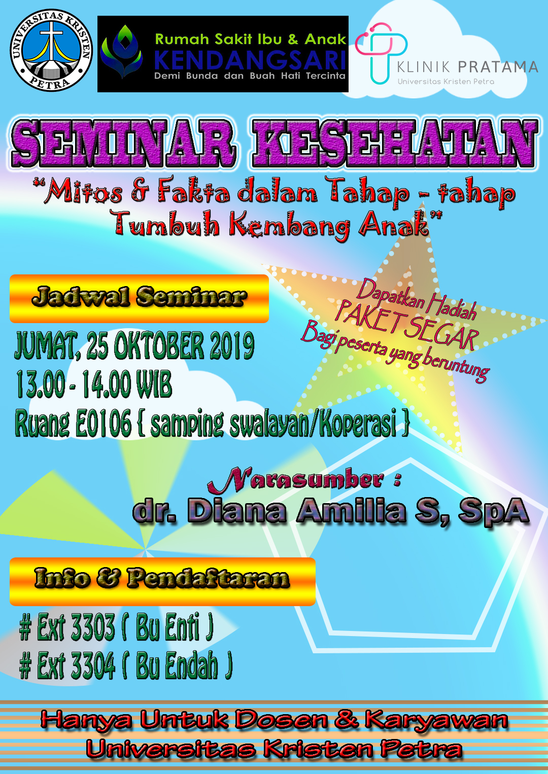 Poliklinik UK Petra Surabaya pada tanggal 25 Oktober 2019 mengadakan seminar kesehatan dengan tema mitos dan fakta dalam tahap-tahap tumbuh kembang anak. Dengan narasumber dr. Diana Amilia, S.Spa., Acara ini bertempat di ruang E.0106. Acara ini khusus untuk dosen dan karyawan UK Petra Surabaya.