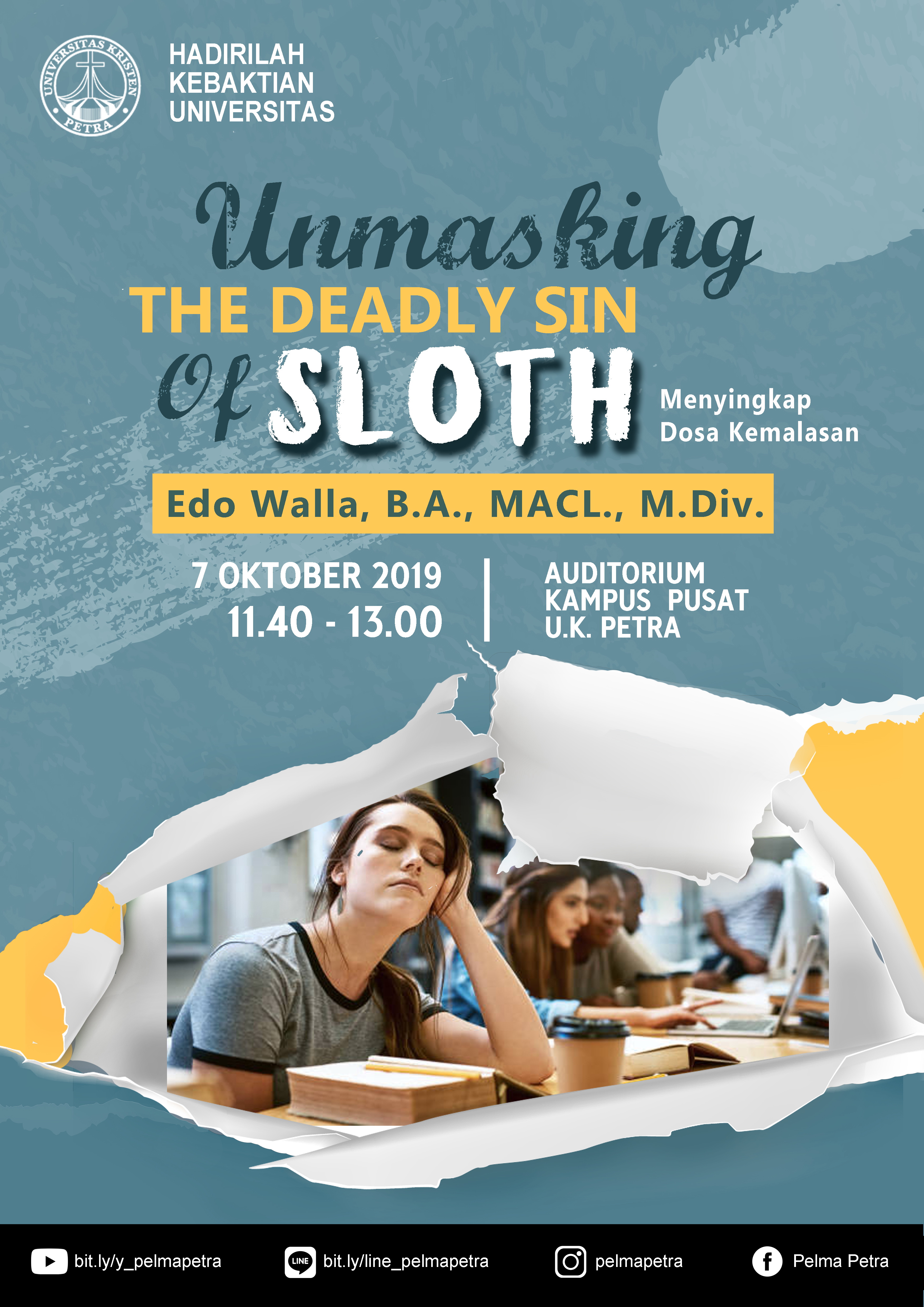 Universitas Kristen Petra Surabaya mengundang seluruh sivitas akademika UK Petra untuk hadir dalam kebaktian universitas yang dilaksanakan setiap hari Senin. Pada tanggal 07 Oktober 2019 kebaktian universitas bertempat di Auditorium UK Petra dengan mengangkat tema "unmasking the deadly sin of sloth (menyingkap dosa kemalasan)". Dengan pengkhotbah Edo Walla, M.Div.