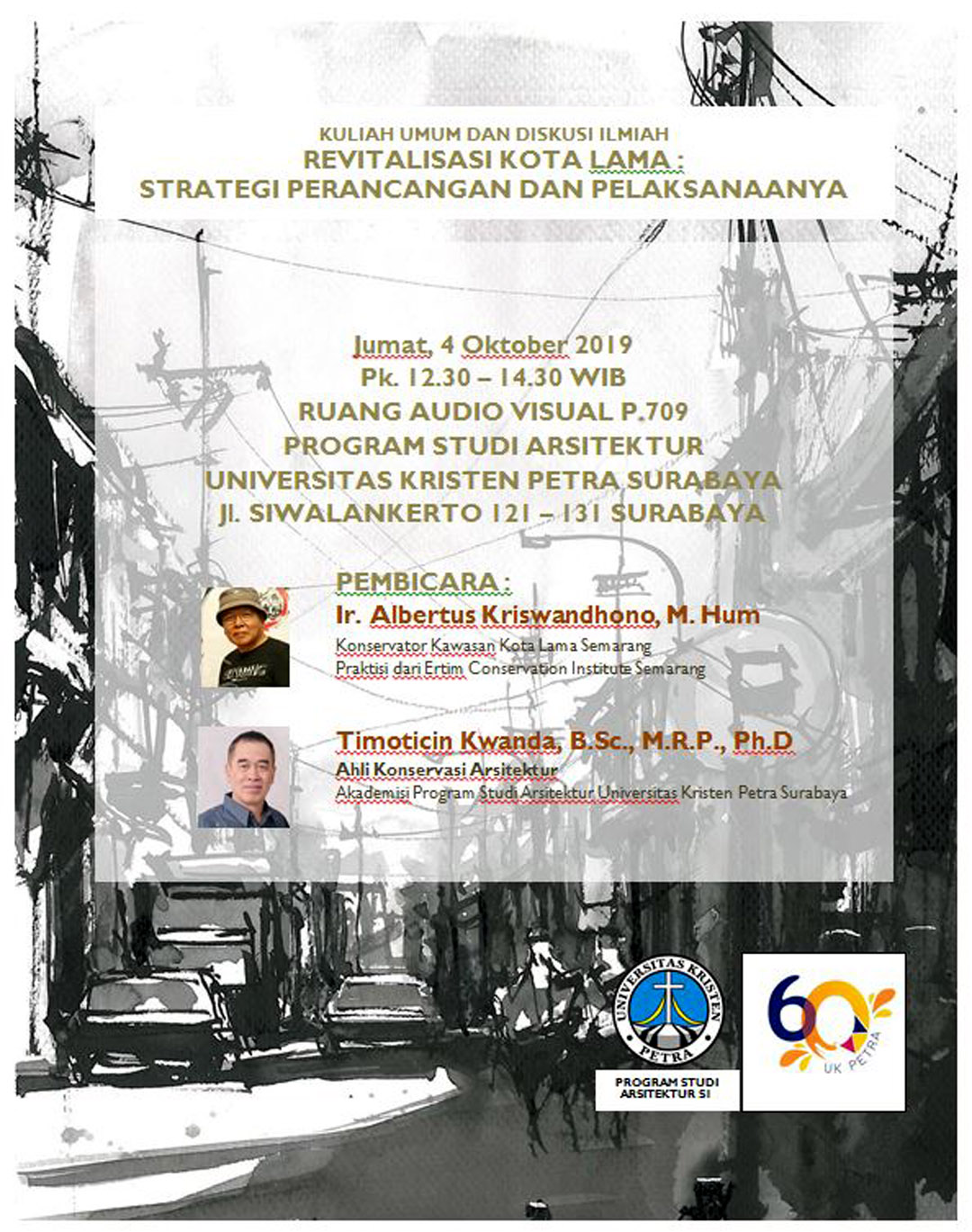 Program Studi Teknik Arsitektur UK Petra, pada tanggal 04 Oktober 2019 mengadakan acara kuliah umum dan diskusi ilmiah dengan tema: revitalisasi kota lama: strategi perancangan dan pelaksanaannya. Dengan narasumber Ir. Albertus Kriswandhono, M.Hum., dan Timoticin Kwanda, Ph.D. bertempat di ruang P.709.