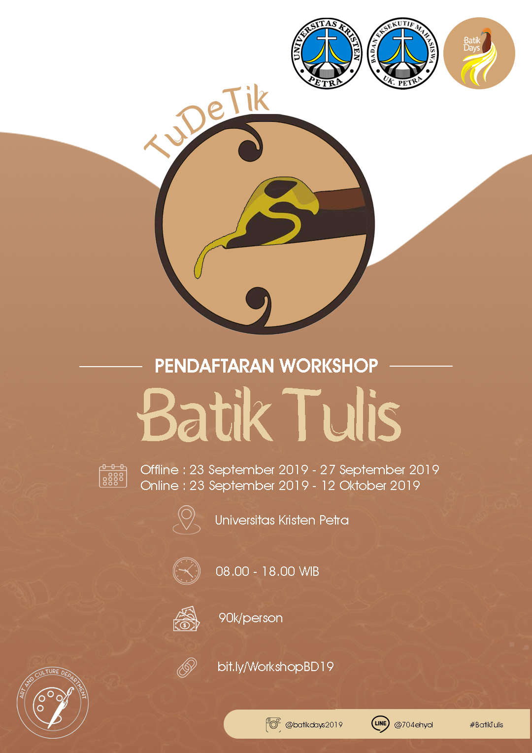 Badan Eksekutif Mahasiswa UK Petra mengadakan workshop tentang batik tulis, pendaftaran untuk acara ini di buka pada 23 September hingga 12 Oktober 2019, bisa secara offline maupun online. Dengan biaya pendaftaran 90.000 Rupiah untuk 1 peserta.