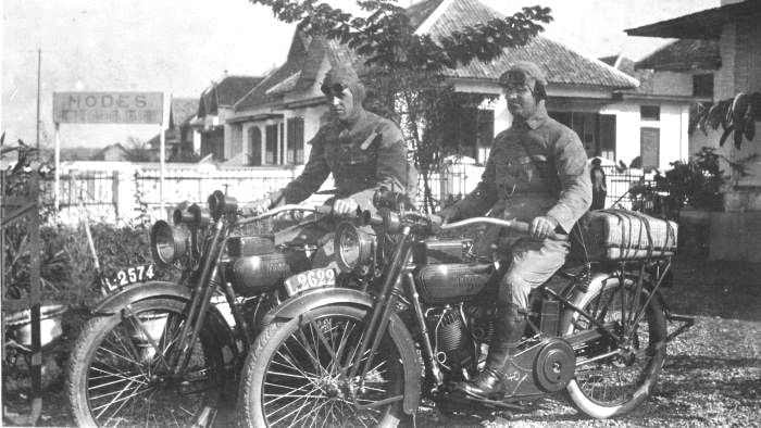 2 orang Eropa naik sepeda motor Hardley Davison di jalan di Java. Sekitar tahun 1918.