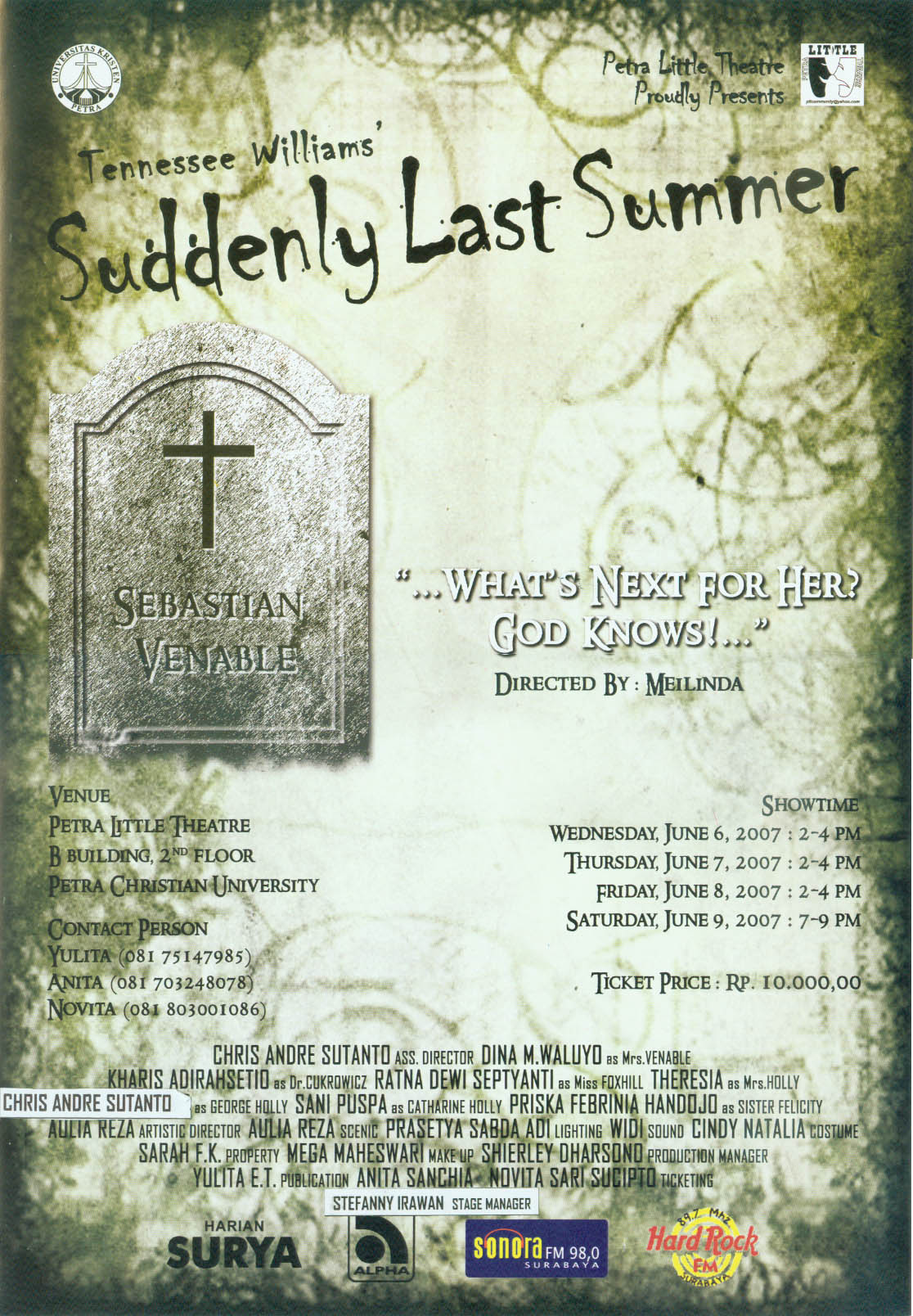 Pementasan teater yang diadakan oleh Petra Little Theatre UK Petra dari tanggal 6-9 Juni 2007 mengambil judul Suddenly Last Summer karya Tennessee Williams yang mengisahkan seorang pemuda bernama Sebastian mati terbunuh. Ibunya mengira yang membunuh adalah saudara sepupunya yakni Catherine Holly. Walaupun Chaterine sudah mengatakan kejadian yang sebenarnya bahwa Sebastian dibunuh oleh sekumpulan anak kanibal karena dia homoseksual, ibunya tetap tidak percaya.