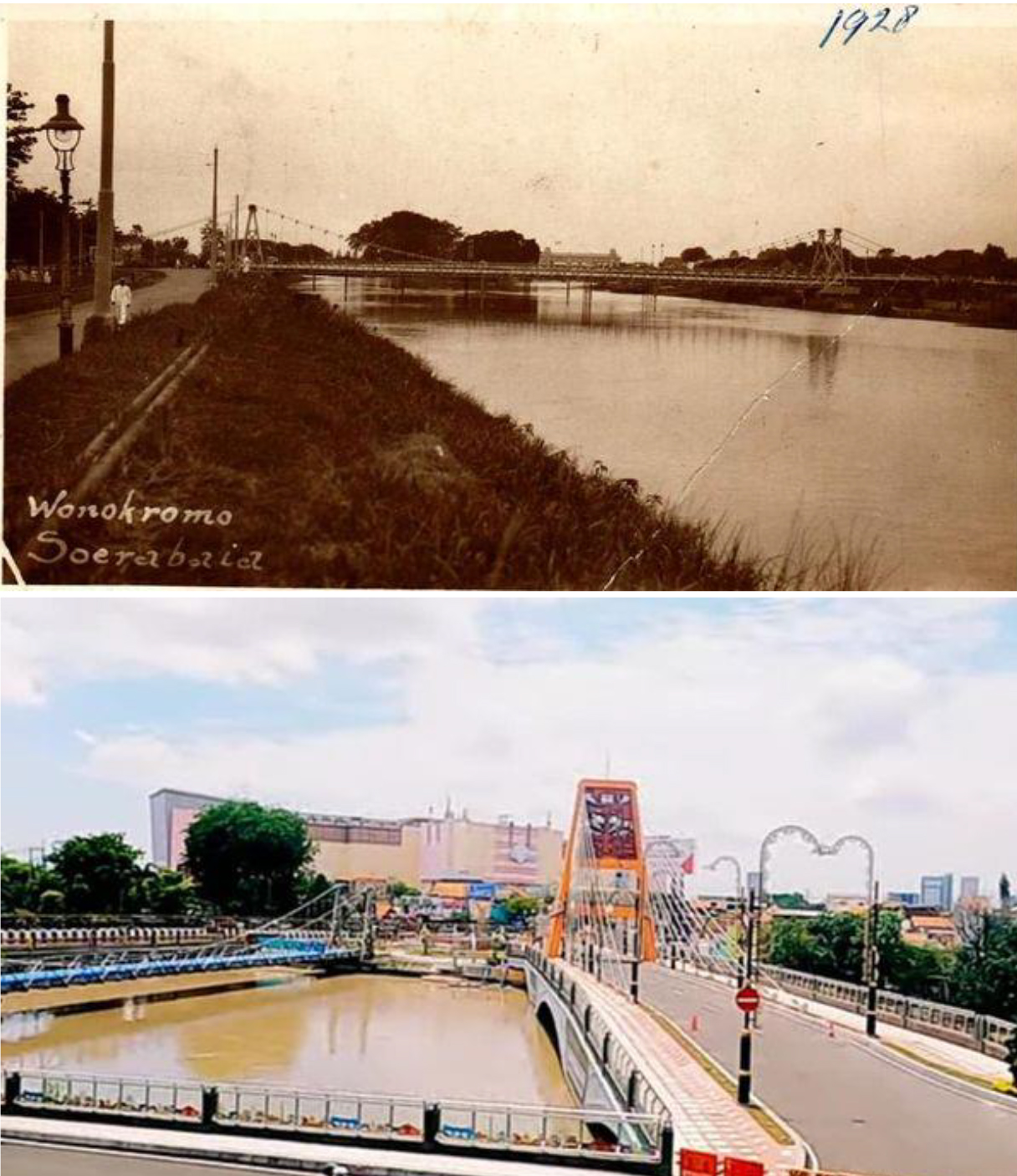 Kondisi jembatan gantung pipa Joyoboyo - Wonokromo Pulo tahun 1928 & tahun 2021