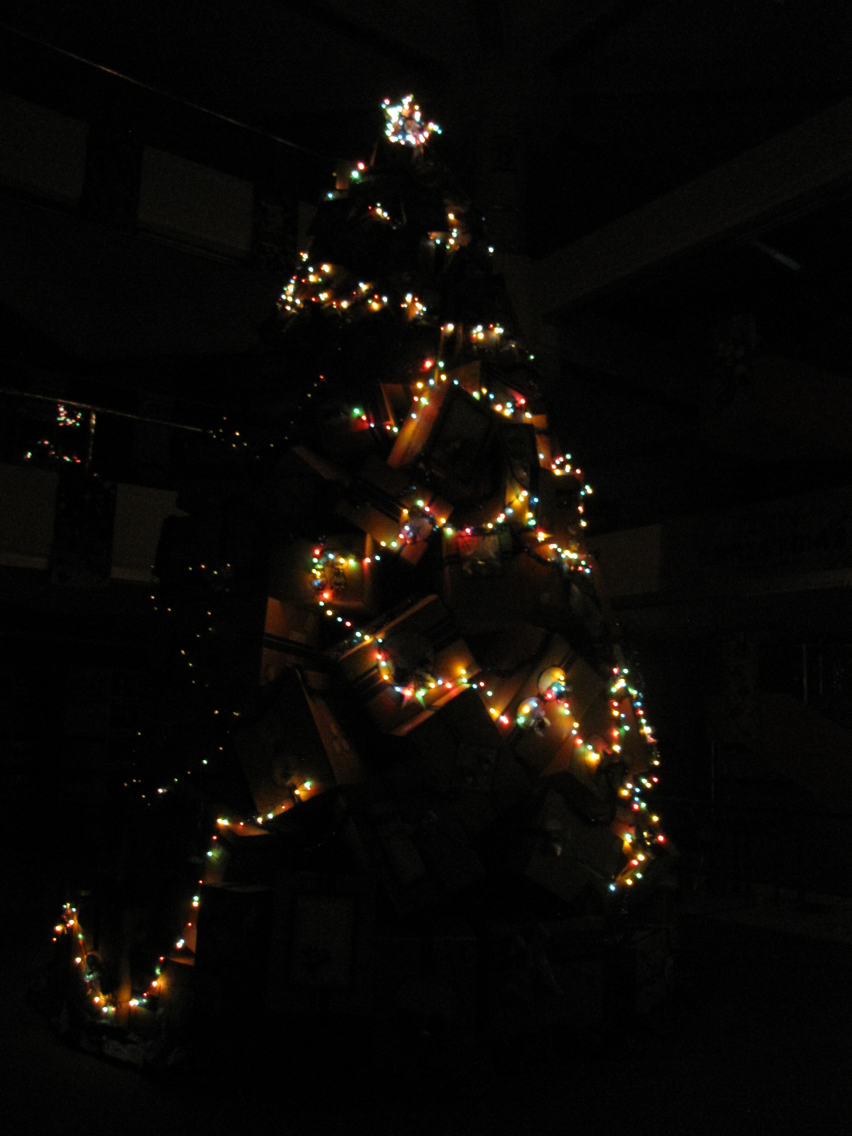 Pohon Natal Kardus. Biasanya kardus dijadikan pembungkus barang, membungkus parcel atau hadiah, membungkus kado-kado Natal. Hadiah pun tersimpan, kadus terbuang tanpa kenangan. Terinspirasi hal itu maka Titien Wahono memikirkan kardus-kardus itu untuk menjadi sebuah pohon natal. Pembuatan kerangkanya dari kayu gelam dengan tinggi 7 meter hingga tertumpuk sekitar 130 kardus dalam pelbagai ukuran. Sebagai hiasan dilekatkan kertas kue, asesoris, dan lampu natal. Green Christmas terbuat dari 124 kardus bekas dengan tinggi kurang lebih 7 meter. Pohon Natal tersebut dipajang di area pameran perpustakaan mulai dari 9 Desember 2010 hingga 28 Januari 2011. Pilihan kardus bekas, jelas dia, karena sampai sekarang mayoritas masyarakat menilai materi itu lebih cocok untuk dibuang di tempat sampah. "Namun, bagi kami, kardus tak berguna dan tak menarik tersebut bisa disusun menjadi pohon natal yang cantik, bahkan ramah lingkungan," katanya. Selain itu, tambah Aditya, para mahasiswa Jurusan Desain Komunikasi Visual kampus tersebut turut menampilkan karya Patra Natal. "Kami yakin sajian ini memberikan suguhan menarik bagi pengunjung yang memeriahkan Natal mendatang," katanya. Salah satu mahasiswa Jurusan Desain Komunikasi Visual UK Petra Surabaya, Asthararianty, mengaku, ada 26 karya Patra Natal yang telah diseleksi. "Kami membuatnya dengan bahan kain kanvas. Lalu, kami warnai dengan cat poster dan cat tembok," katanya. Sejumlah kreasi pohon natal telah disiapkan oleh para sivitas, misalnya, pohon terang berbahan tali rafia setinggi 7 meter. Pohon bertali itu dapat dijumpai di lapangan hijau di kampus tersebut. Ada pula komputer bekas yang disusun menjadi sebuah pohon natal. "Enam belas unit CPU, 10 unit monitor, 18 keyboard, dan delapan mouse disusun membentuk sebuah pohon natal. Kalau kreasi ini dapat dijumpai di Pusat Komputer Gedung W lantai 4," katanya.
